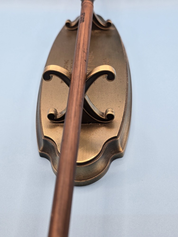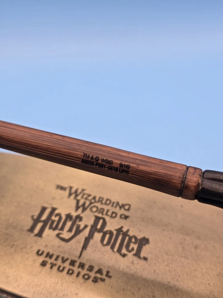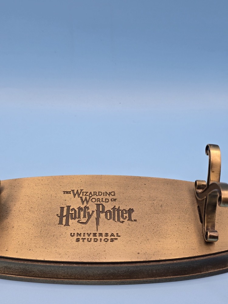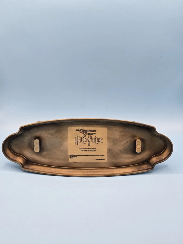 Official Harry Potter Wand & Wall Display Set – Universal Studios Authentic Wizarding World of Harry Potter merchandise from Universal Studios. This listing includes one official character wand and one official metal wall-mounted wand display, sold together as a set. The wall display is a cast metal plaque with an antique brass finish and embossed The Wizarding World of Harry Potter and Universal Studios branding. Designed to hold a single wand horizontally. Original Universal Studios authentication sticker is present on the back. The wand is an authentic Universal Studios park wand with wood-look finish and printed SKU text. Tip is intact with no cracks or breaks. Condition: Both items are in very good used condition. The display shows light surface patina and minor speckling consistent with normal factory finish and age. No bends, cracks, or broken brackets. The wand shows light handling wear from display use only. Details: Brand: Universal Studios Franchise: Harry Potter Theme Park: The Wizarding World of Harry Potter Material (display): Metal Finish: Antique brass Mounting: Wall-mounted (hardware not included) Country of Manufacture: China Notes: Sold as a set (wand + display) This is official park merchandise, not a replica Please review all photos for exact condition and details Carefully packed and shipped promptly.