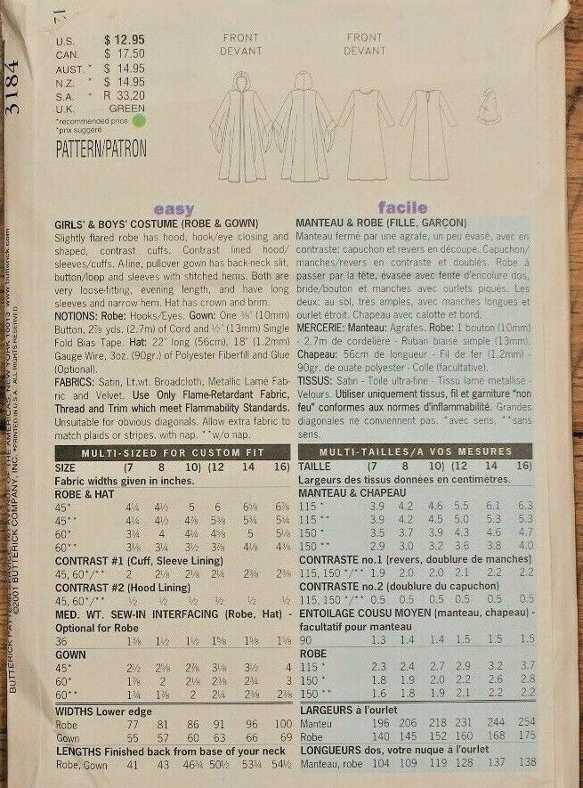 ITEM: Butterick Girls Boys Costume (Robe with Hood & Gown with Hat) Harry Potter Sewing Pattern #3184 SIZE: 12-14-16 PATTERN NUMBER: 3184 DESIGN OPTIONS: Harry Potter Costume Robe - Slightly Flared, Hood, Hook/Eye Closing, Shaped Contrast Cuffs Gown - A-Line, Pullover, Neck Back Slit, Button/Loop, Sleeves with Stitched Hem Both are Loose-Fitting, Evening Length, Long Sleeves, Narrow Hem Hat - Crown, Brim CONDITION: Uncut & factory folded. The Envelope Shows Some Wear. This comes from a smoke free environment. Email us with any questions. SHIPPING FREE FOR USA ONLY: We will ship this item USPS Ground Advantage mail with Tracking. INTERNATIONAL SHIPPING: Ebay International Shipping. TO VIEW MY OTHER LISTINGS / SIMILAR ITEMS: Store: York Bluff Auction: 7522dth