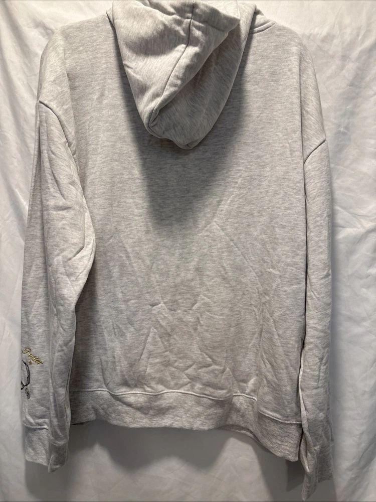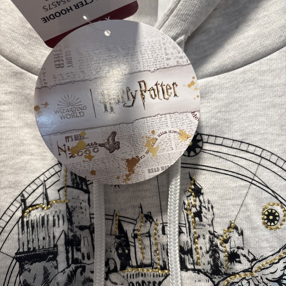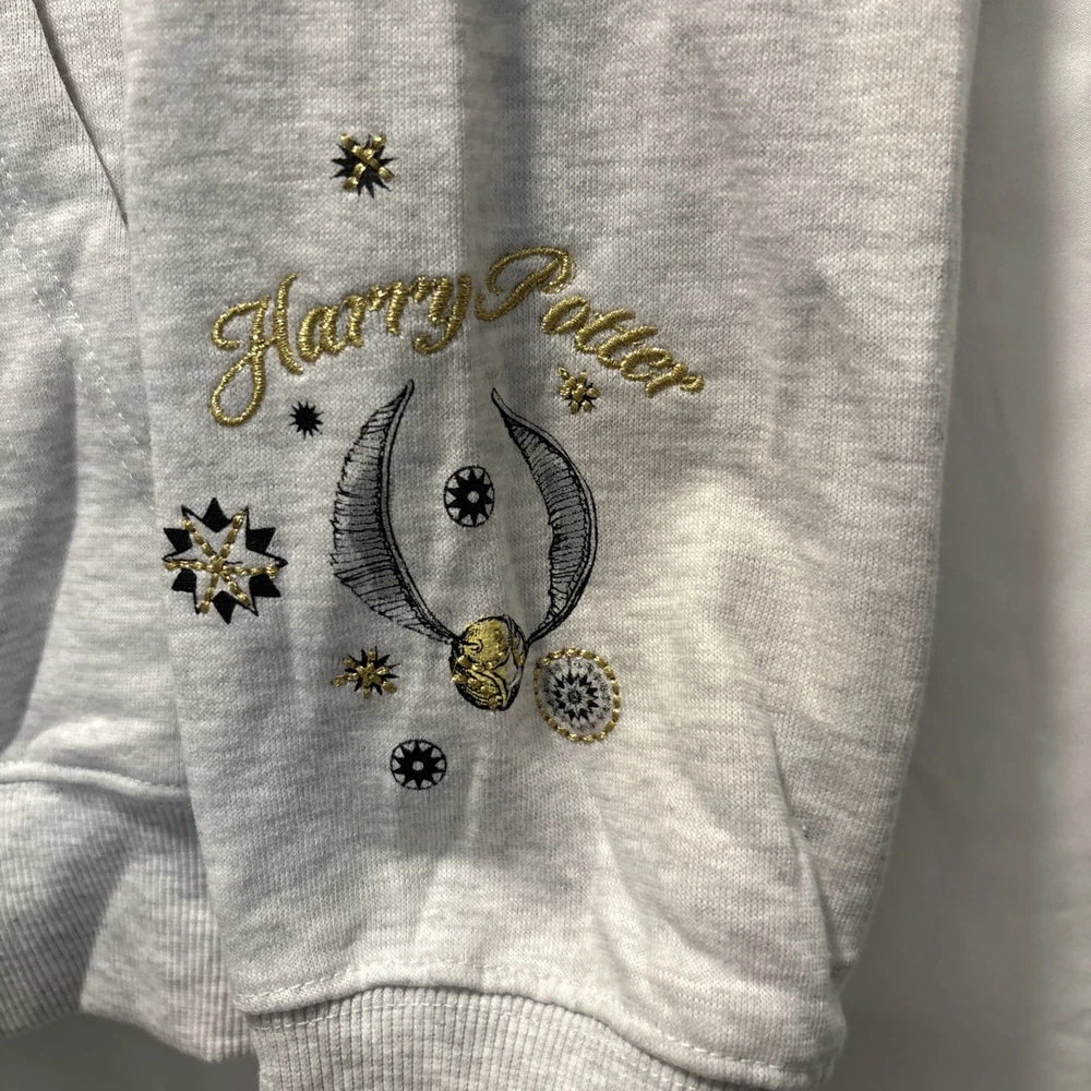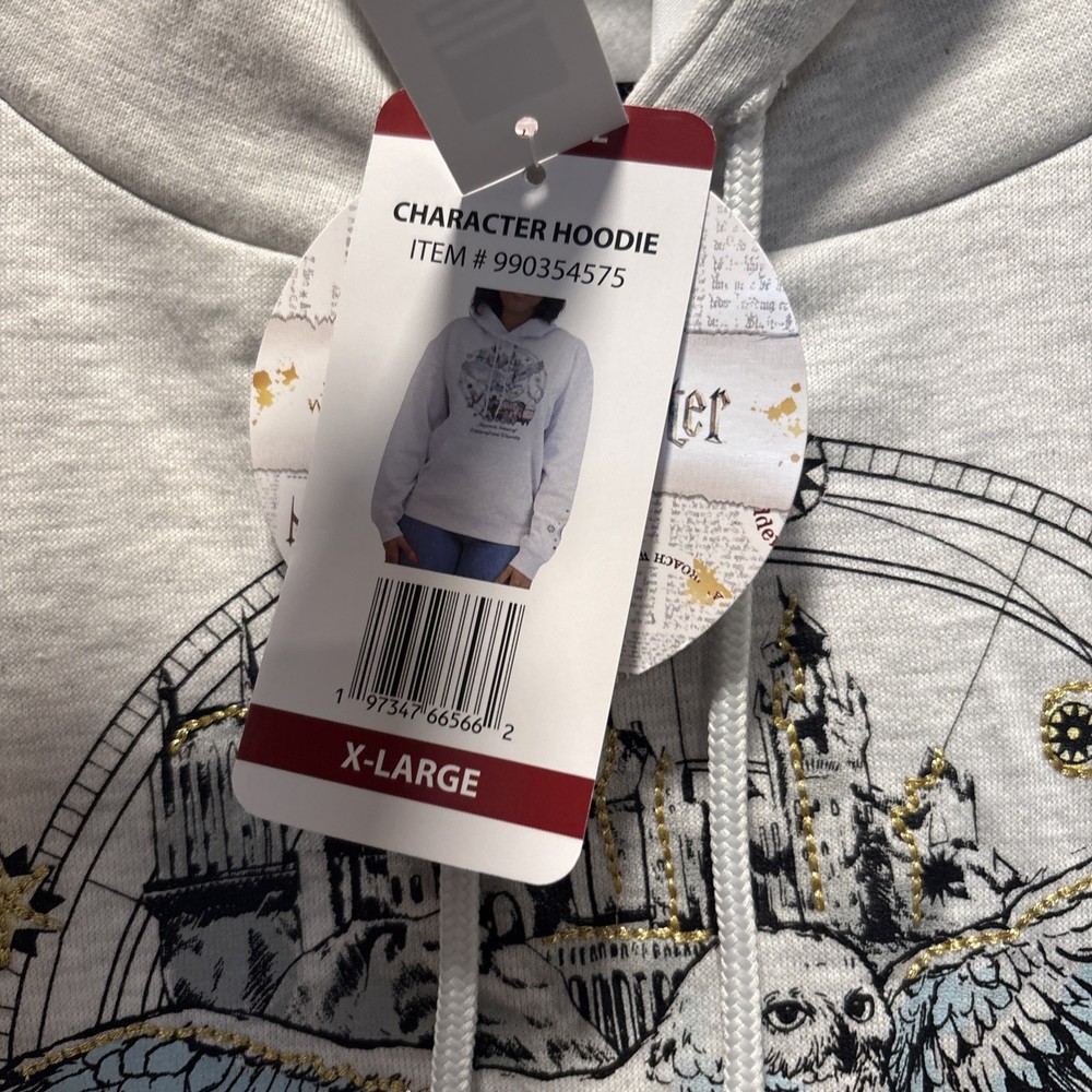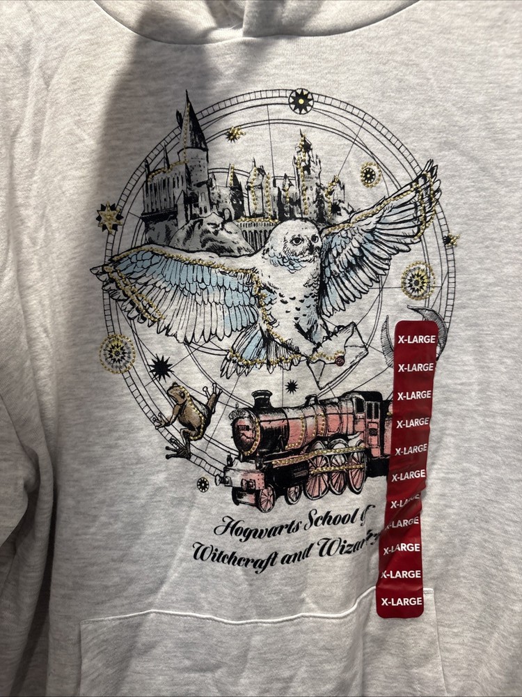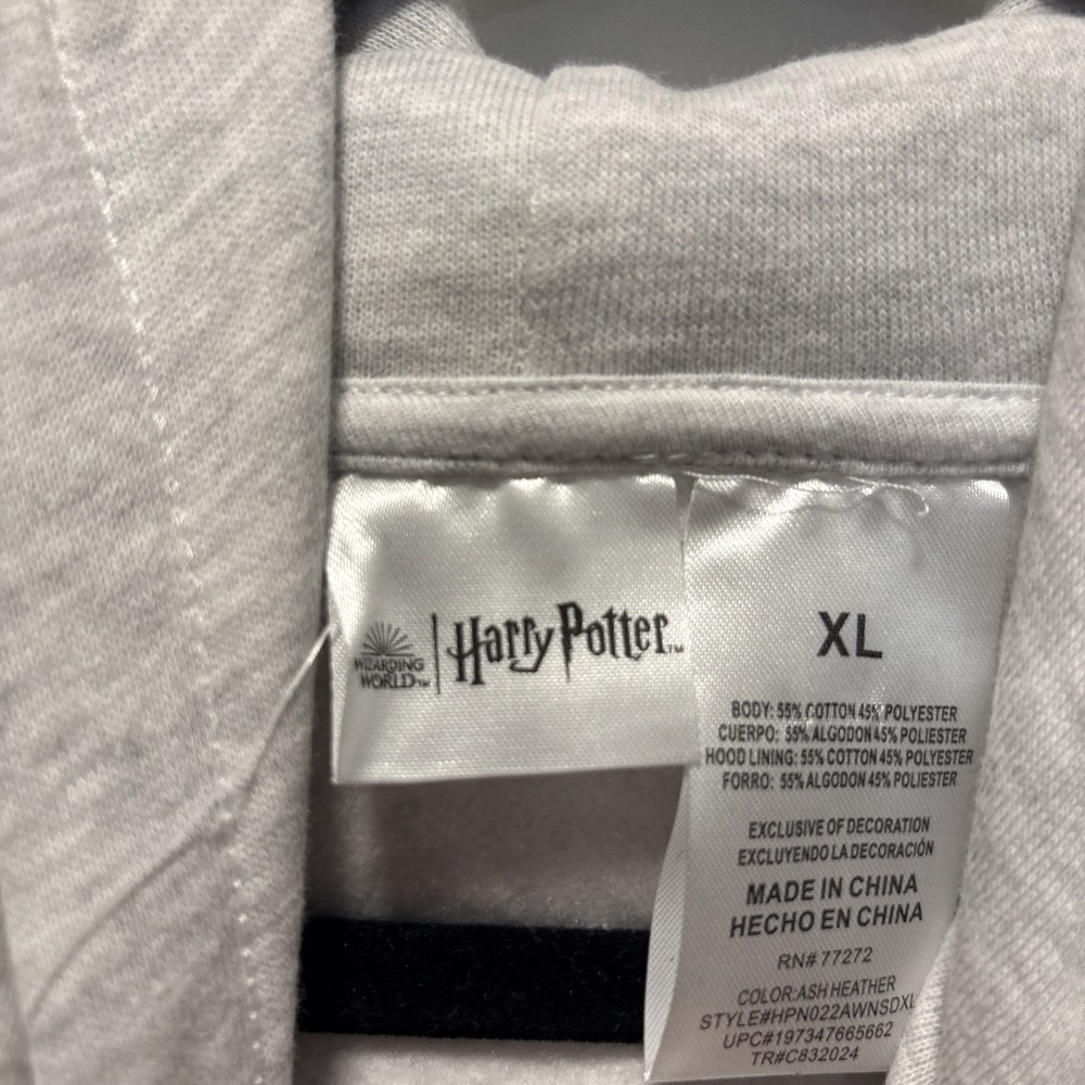 The product is a women's XL character hoodie from the Harry Potter brand, featuring a design inspired by Hogwarts Witchcraft. The hoodie is a stylish and comfortable option for activewear, made from a blend of polyester and cotton. It comes in a gray color and showcases iconic elements from the Harry Potter movie series, making it a fun and cozy addition to any fan's wardrobe.
