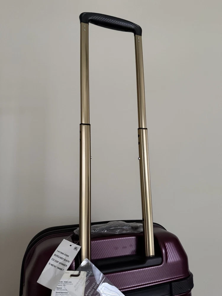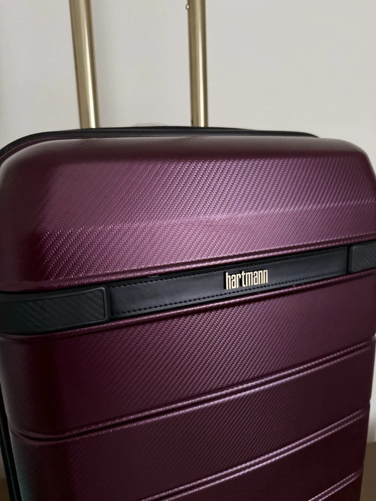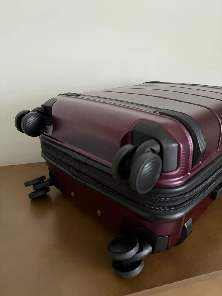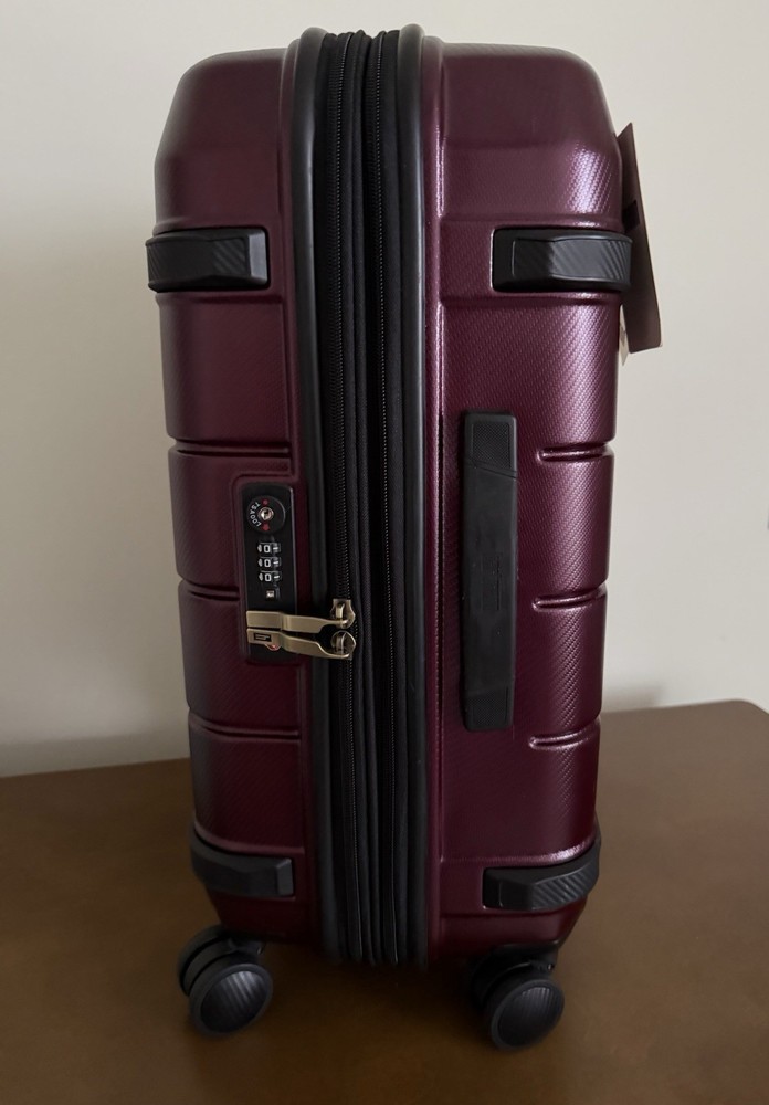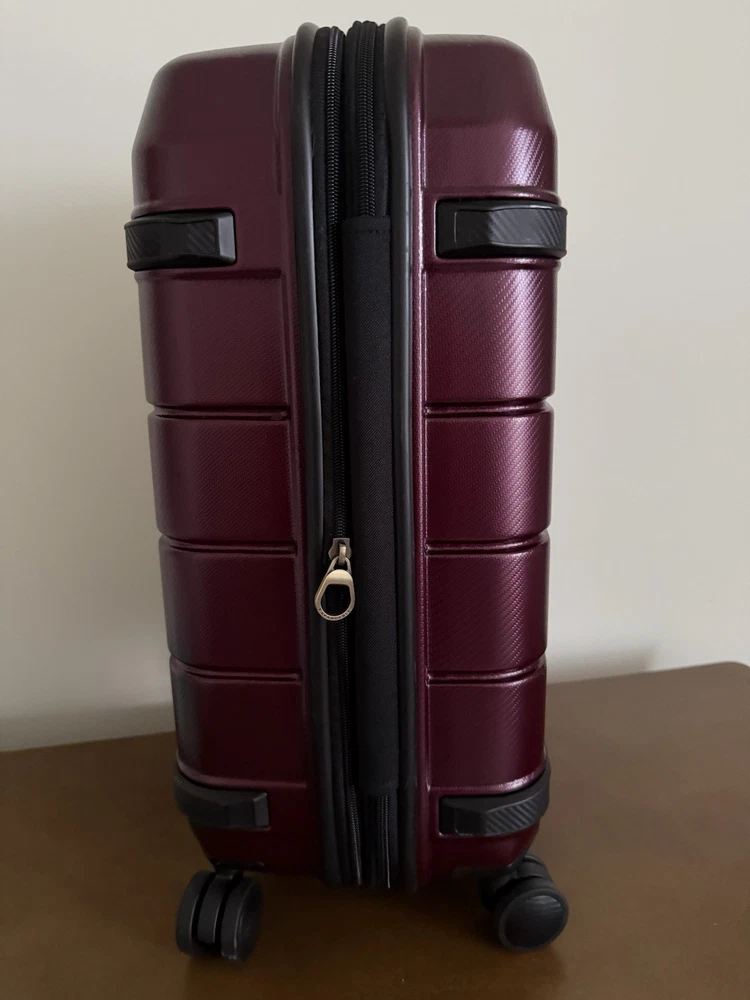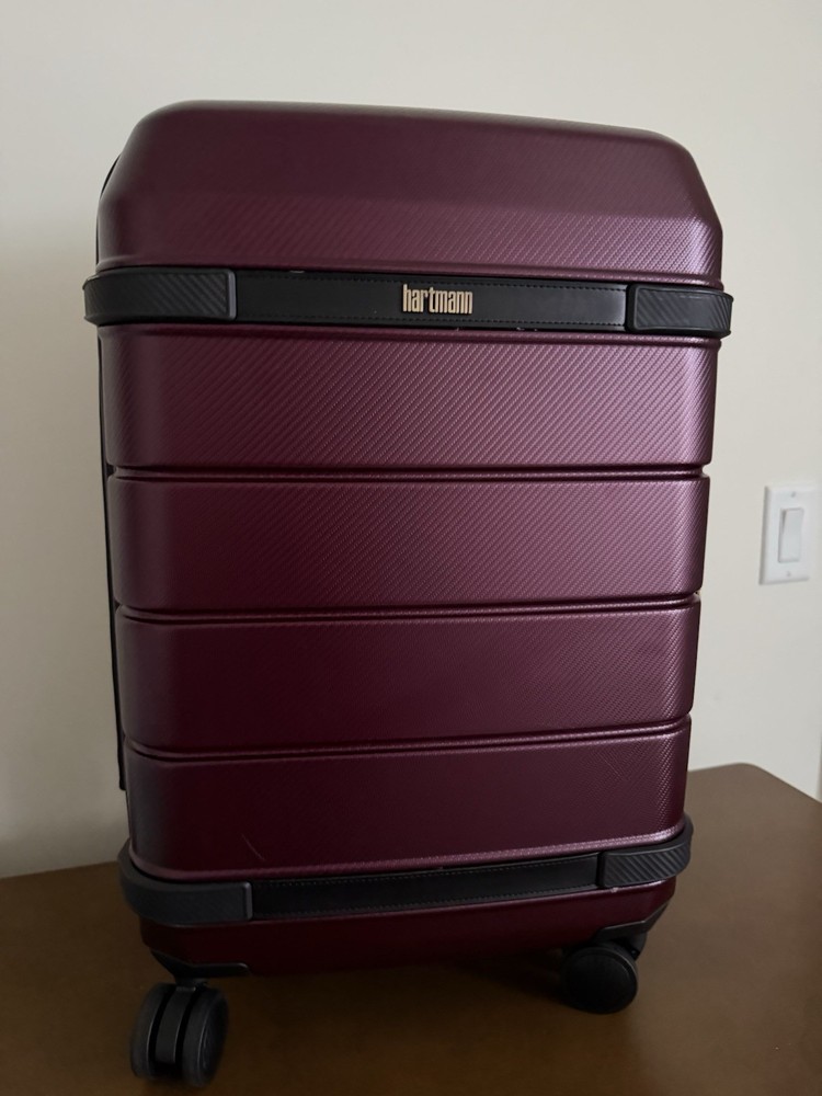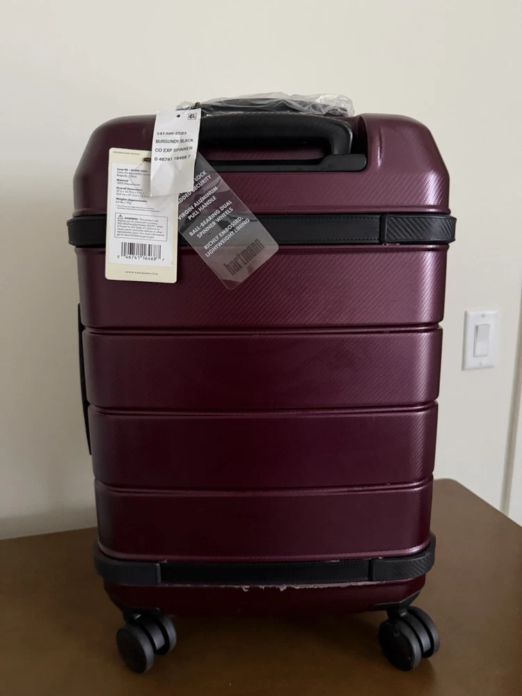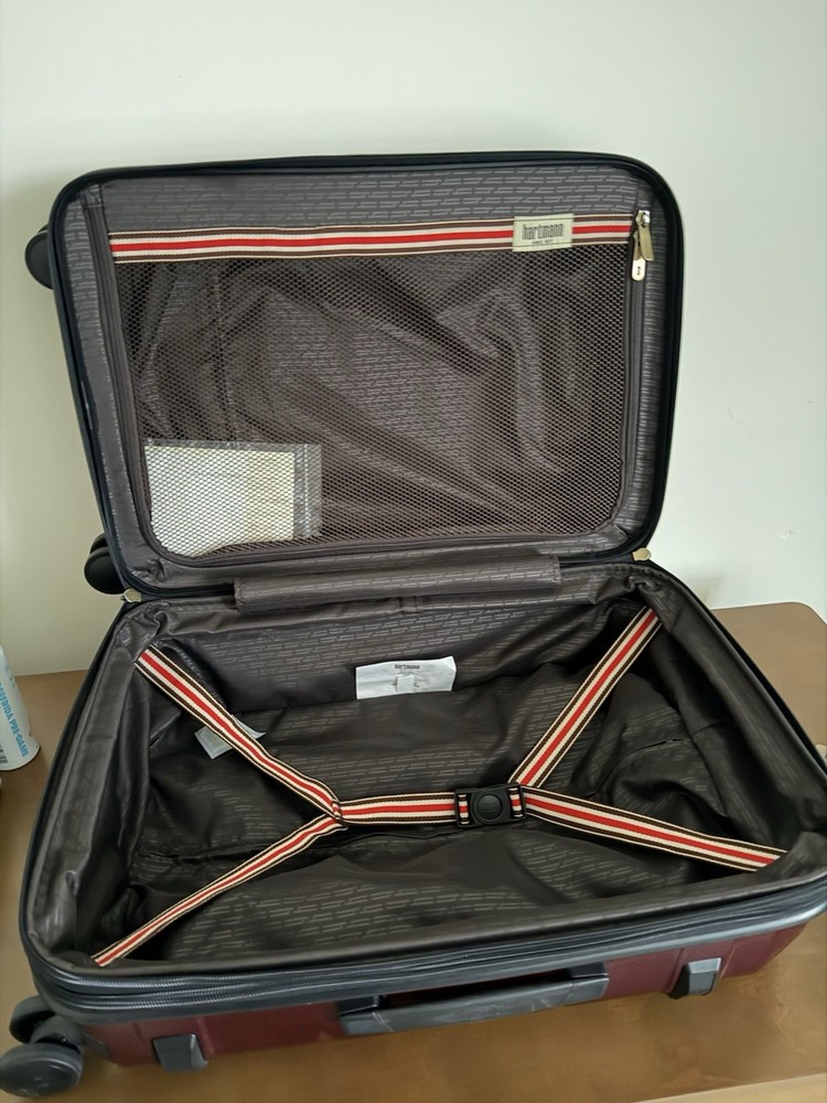 Brand new with tags! Hartmann luxe hardside carry-on expandable spinner. 22" x 14.75" x 9.25". Model: 141395-2593. Color burgundy with black. Durable polycarbonate shell. Ball-bearing dual spinner wheels provides a smooth rolling experiences on surfaces. Integrated TSA combination lock. Virgin aluminum pull handle. Does not come with dust bag or original packaging. The Hartmann Luxe 22" Hardside Carry-On Spinner in burgundy/black is a stylish and versatile luggage option for travelers. Made from durable polycarbonate material, this expandable carry-on features a hardcase design, making it perfect for protecting your belongings while on the go. The spinner wheels make it easy to maneuver through airports and train stations, while the unisex adult design ensures a comfortable experience for anyone using it. With its compact size and convenient features, this carry-on is a practical and fashionable choice for any journey.
