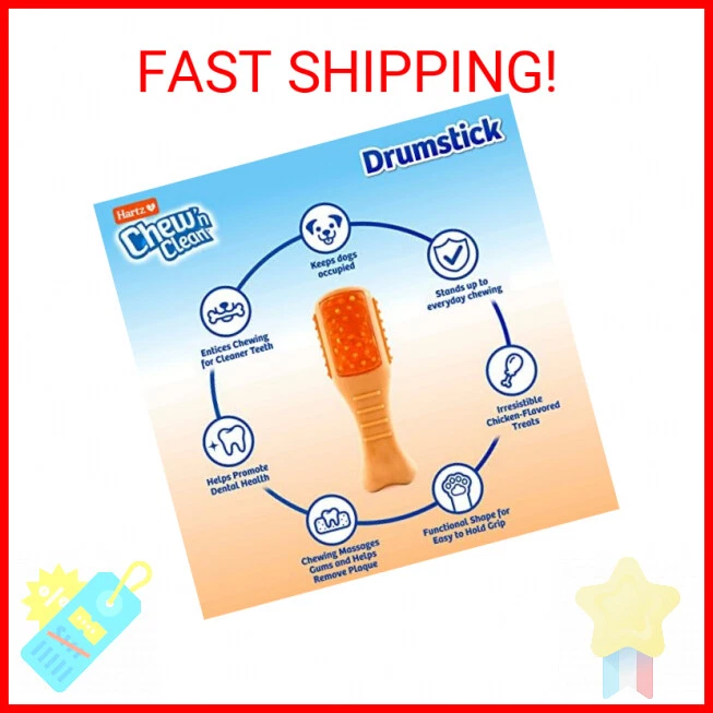Hartz Chew ‘n Clean Chew Toy and Treat in One Chicken Flavored Drumstick Dog Toy, Extra Small - Combines a durable nylon outer shell embedded with delicious chicken-flavored treats for overall chewing satisfaction. Suitable for teething puppies and adult dogs. - The toy’s outer shell has nubs and contours that gently massage your dog’s gums and help to clean teeth by keeping tartar and plaque at bay, along with freshening breath. - Each toy has embedded chicken-flavored treats to entice chewing and is ideal for moderate, non-aggressive chewers. - The unique and functional drumstick shape is designed to be easy for dogs to hold with their paws and grasp in their mouth. - This fun drumstick chew toy is available in an extra small size (dogs under 10 pounds) and in a small size (dogs 10 to 20 pounds). Payments We accept the following payment methods PayPal Support Our dedicated customer support team is here to assist you from 9AM to 5PM Monday through Friday, excluding public holidays. Should you reach out to us and not recieve an immediate response, it's likely due to a higher-than-usual volume of inquires. We want to reassure you that your concerns are important to us, and we're working dilligently to get back to you. Expect a response by the next business day at the latest. Your understanding and patience are greatly valued as we strive to provide you with the best support possible! Shipping All orders are processed within 5 business days. Shipping estimates may be shown on this listing by eBay, and these are often not an accurate reflection of our shipping times. If we are experiencing a high volume of orders, shipments may be delayed by a few days. Please allow additional days in transit for delivery. If there will be a significant delay in shipment of your order, we will contact you via message. Shipping rates & delivery estimates Shipping is often free, but if charges for your order apply they will be calculated and displayed at checkout.
