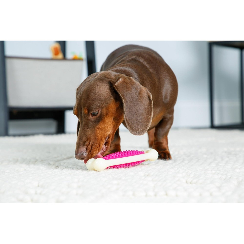 Hartz Chew 'n Clean Tuff Bone, Dental Dog Chew Toy, Medium, Color May Vary (Pack Of 24) Hartz Chew ‘n Clean Tuff Bone satisfies your dog's natural desire to chew. These durable chew toys are textured with nubs that gently massage and exercise your dog's gums, keep teeth clean, and support overall better dental hygiene. These chew toys have a bacon scent to entice your dog to chew while promoting those dental benefits. About this item This patented design is assembled from durable nylon and polyurethane with a textured surface to withstand active chewing from both puppy teething and adult dogs The nubs gently massage your dog's gums and help to clean teeth by keeping tartar and plaque at bay Enticing bacon-scented chew toy to pique your pup's interest and support their natural desire and behavior to chew Always select toys appropriate for your dog's size and chewing habits and be sure to supervise your pet's chew and playtime. Additional Chew ‘n Clean Dog Chew Toys available are bacon-scented Twisty Bones for mild to moderate chewers and Dental Duos for a toy & bacon flavored dental treat all in one Chew ‘n Clean Tuff Bones are perfect for puppies teething and mild to moderate chewing for adult dogs. Chew ‘n Clean Tuff Bones are available in a range of different sizes to fit every dog's chewing needs!