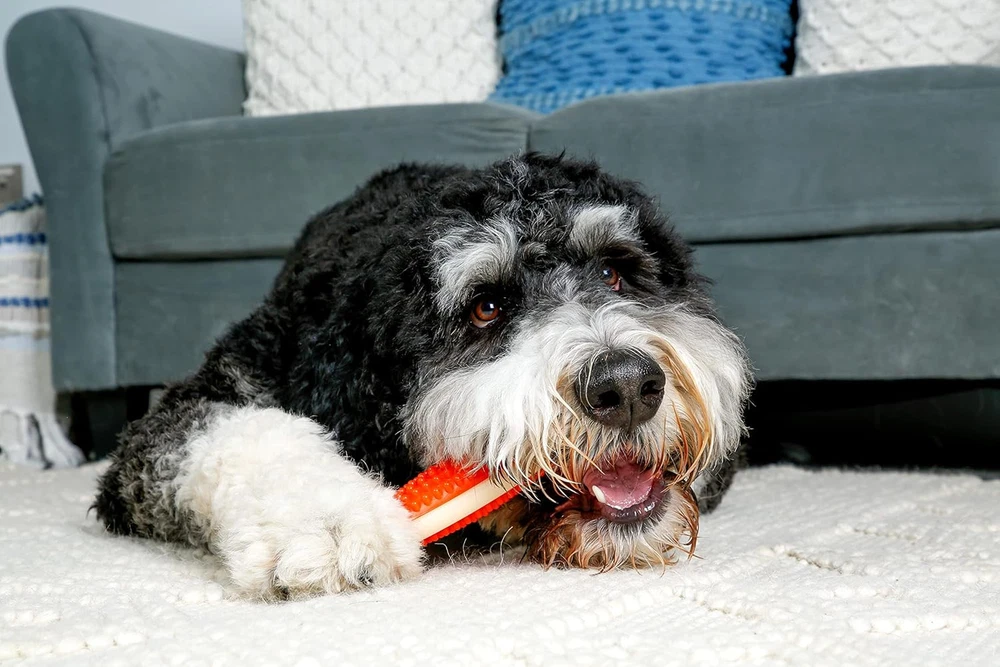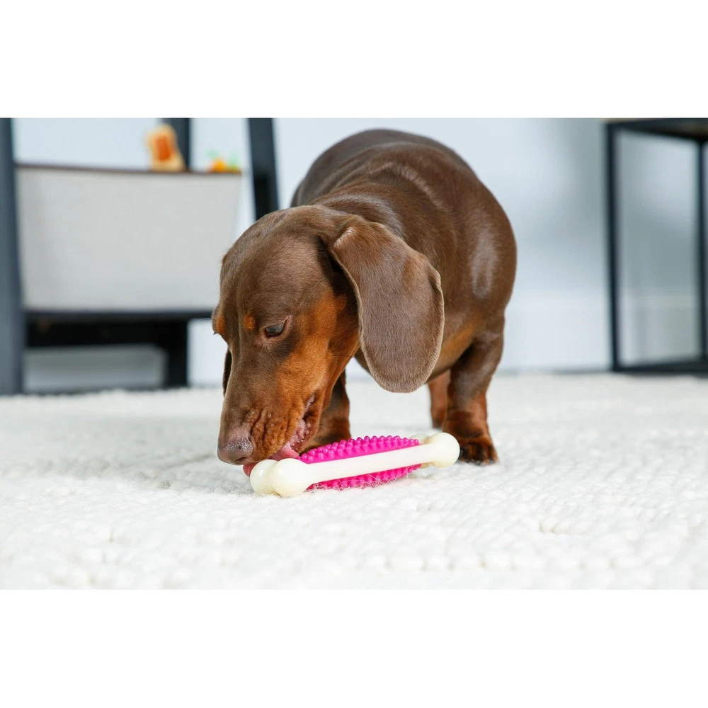 Hartz Chew 'n Clean Tuff Bone, Dental Dog Chew Toy, Medium, Color May Vary (Pack Of 2) Hartz Chew ‘n Clean Tuff Bone satisfies your dog's natural desire to chew. These durable chew toys are textured with nubs that gently massage and exercise your dog's gums, keep teeth clean, and support overall better dental hygiene. These chew toys have a bacon scent to entice your dog to chew while promoting those dental benefits. About this item This patented design is assembled from durable nylon and polyurethane with a textured surface to withstand active chewing from both puppy teething and adult dogs The nubs gently massage your dog's gums and help to clean teeth by keeping tartar and plaque at bay Enticing bacon-scented chew toy to pique your pup's interest and support their natural desire and behavior to chew Always select toys appropriate for your dog's size and chewing habits and be sure to supervise your pet's chew and playtime. Additional Chew ‘n Clean Dog Chew Toys available are bacon-scented Twisty Bones for mild to moderate chewers and Dental Duos for a toy & bacon flavored dental treat all in one Chew ‘n Clean Tuff Bones are perfect for puppies teething and mild to moderate chewing for adult dogs. Chew ‘n Clean Tuff Bones are available in a range of different sizes to fit every dog's chewing needs!