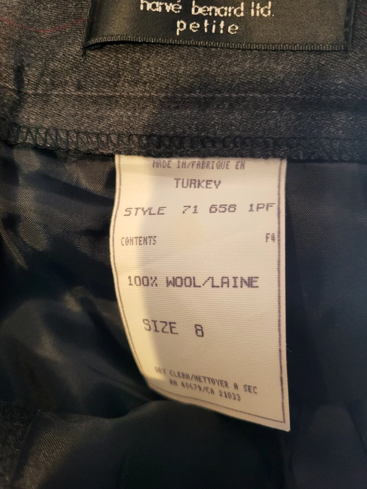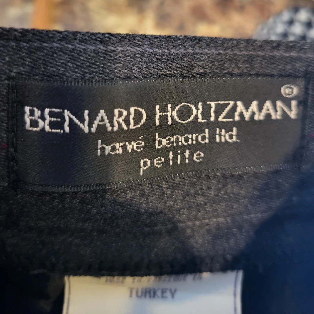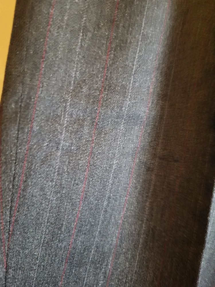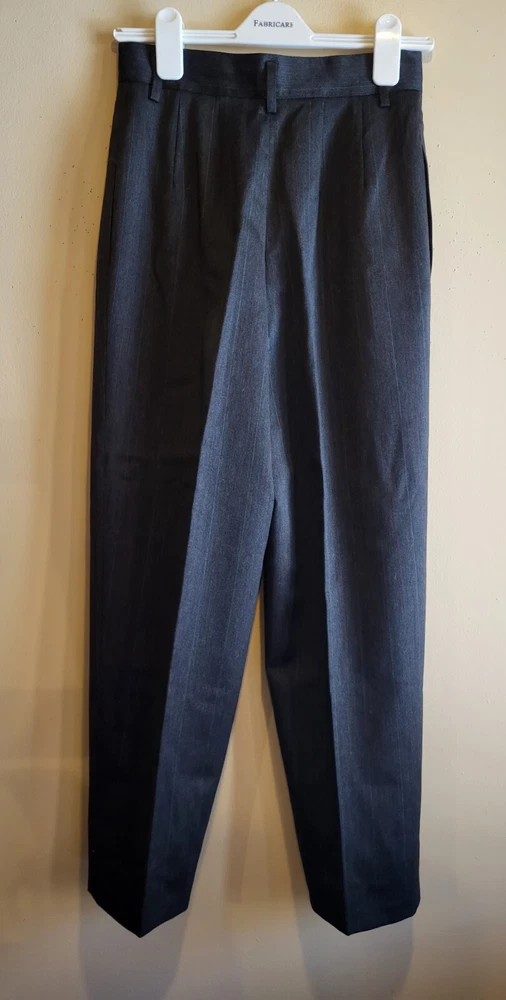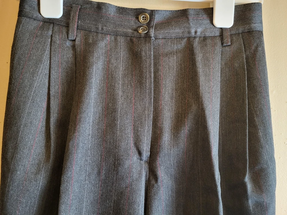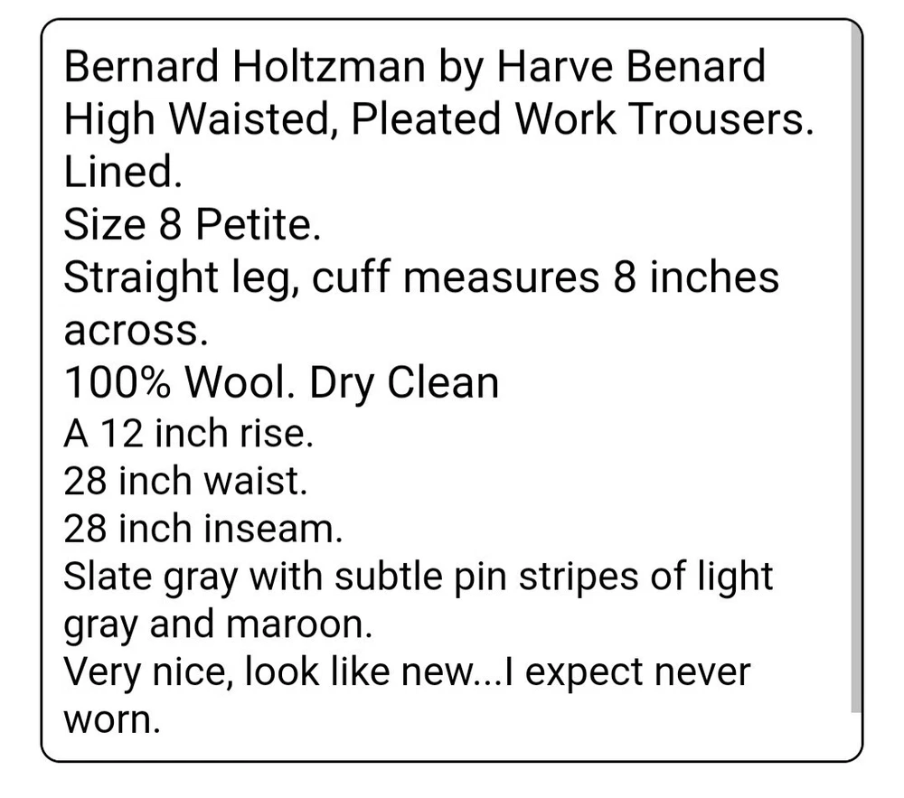 Bernard Holtzman by Harve Benard High Waisted, Pleated Work Trousers. Lined. Straight leg, cuff measures 8 inches across. 100% Wool. Dry Clean A 12 inch rise. 28 inch waist. 28 inch inseam. Slate gray with subtle pin stripes of light gray and maroon. Very nice, look like new...I expect never worn.