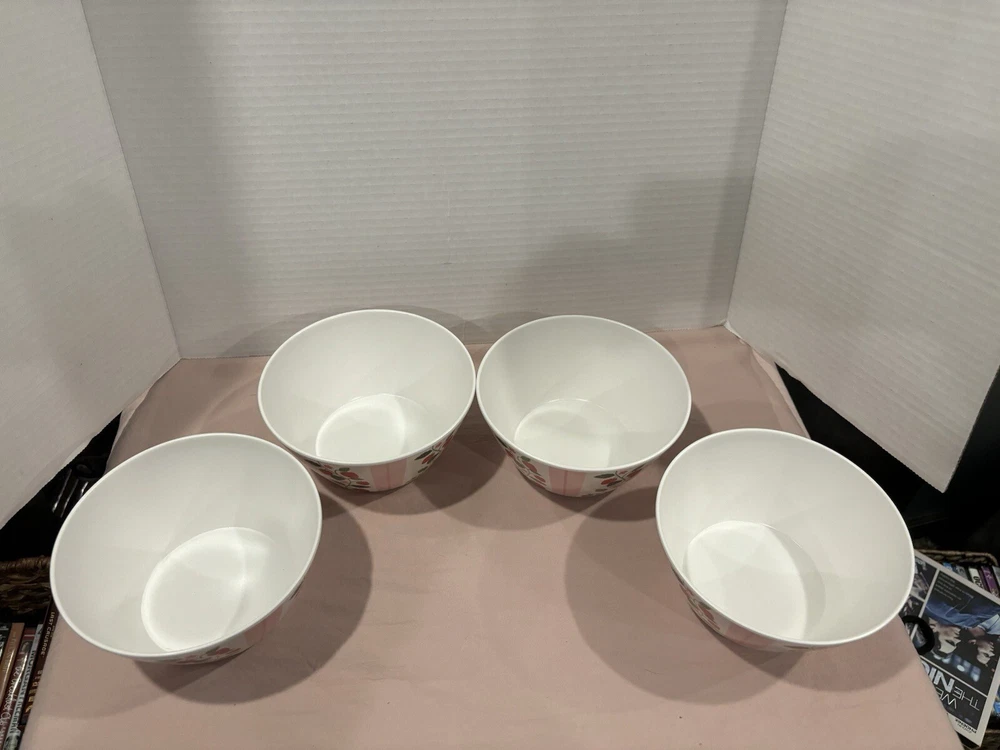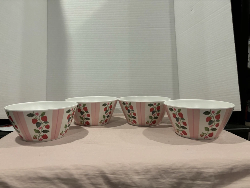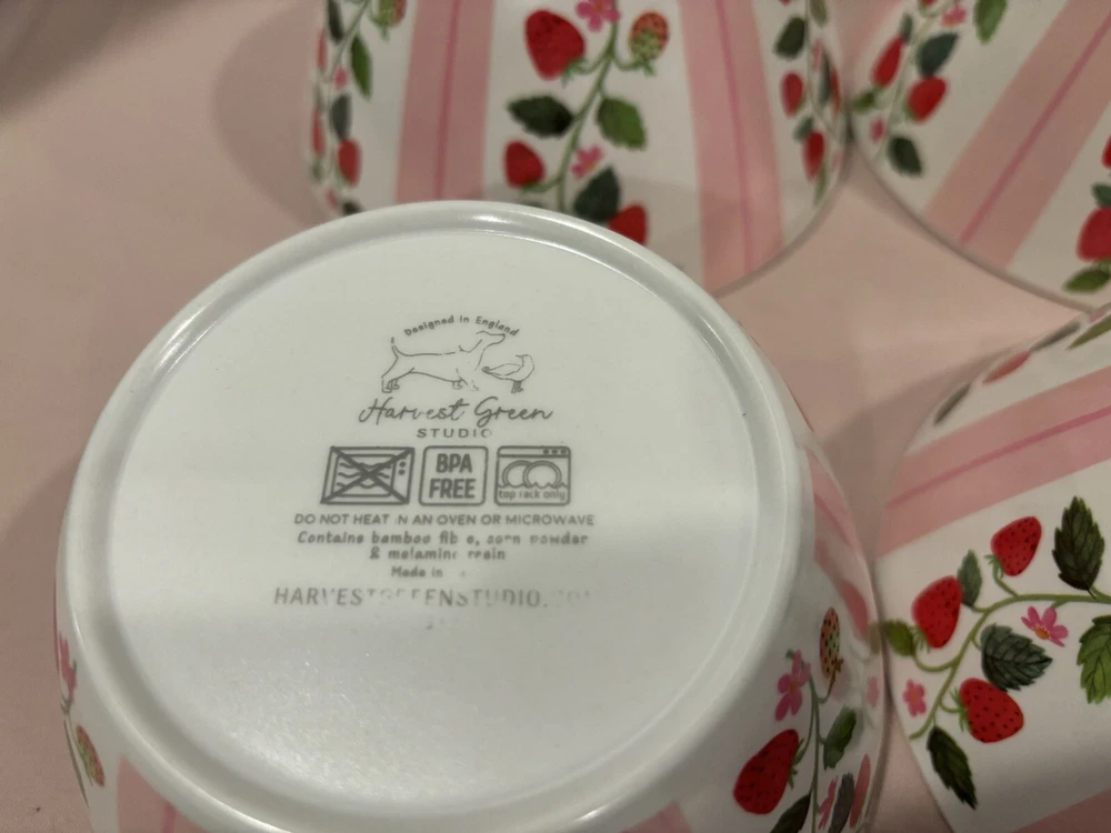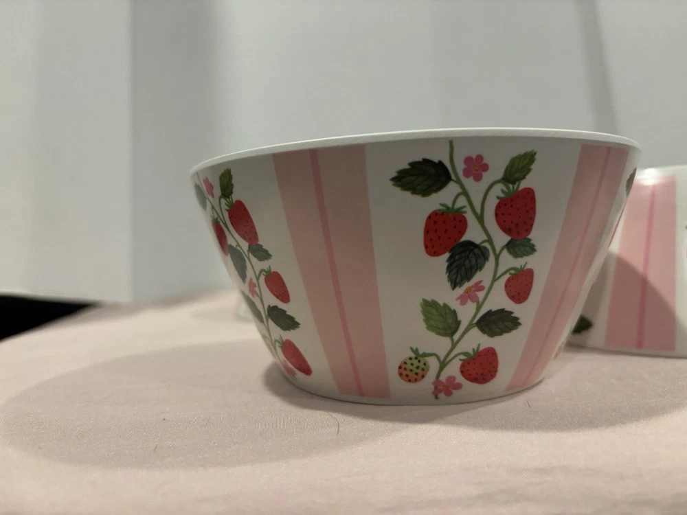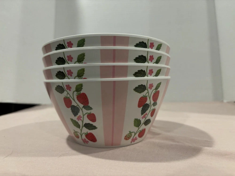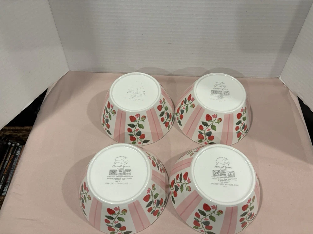 The product is a set of 4 salad bowls from Harvest Green Studios, featuring a strawberry design in pink and white. These bamboo bowls are part of the Strawberry product line and have a harvest pattern.