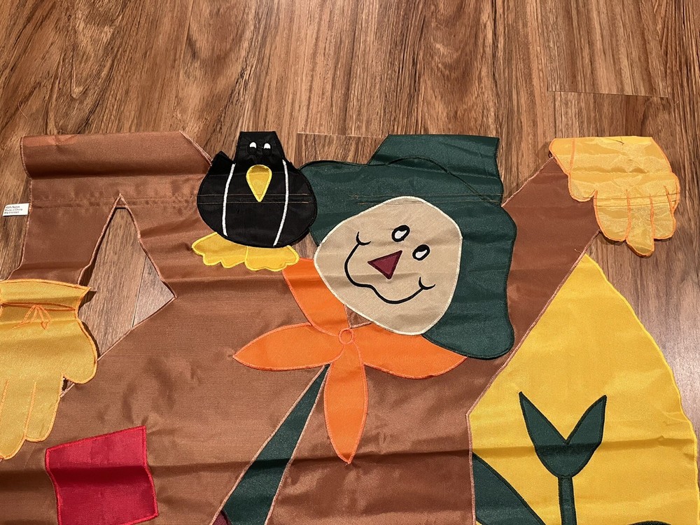 Harvest Hearth Nylon House Flag 28x40 NEW! Scarecrow Black Crow. Not your basic oblong flag....sculpted edges! This flag is new, I opened it to photograph. I didn't see any reason to roll it pack up, I will however include the original packaging.