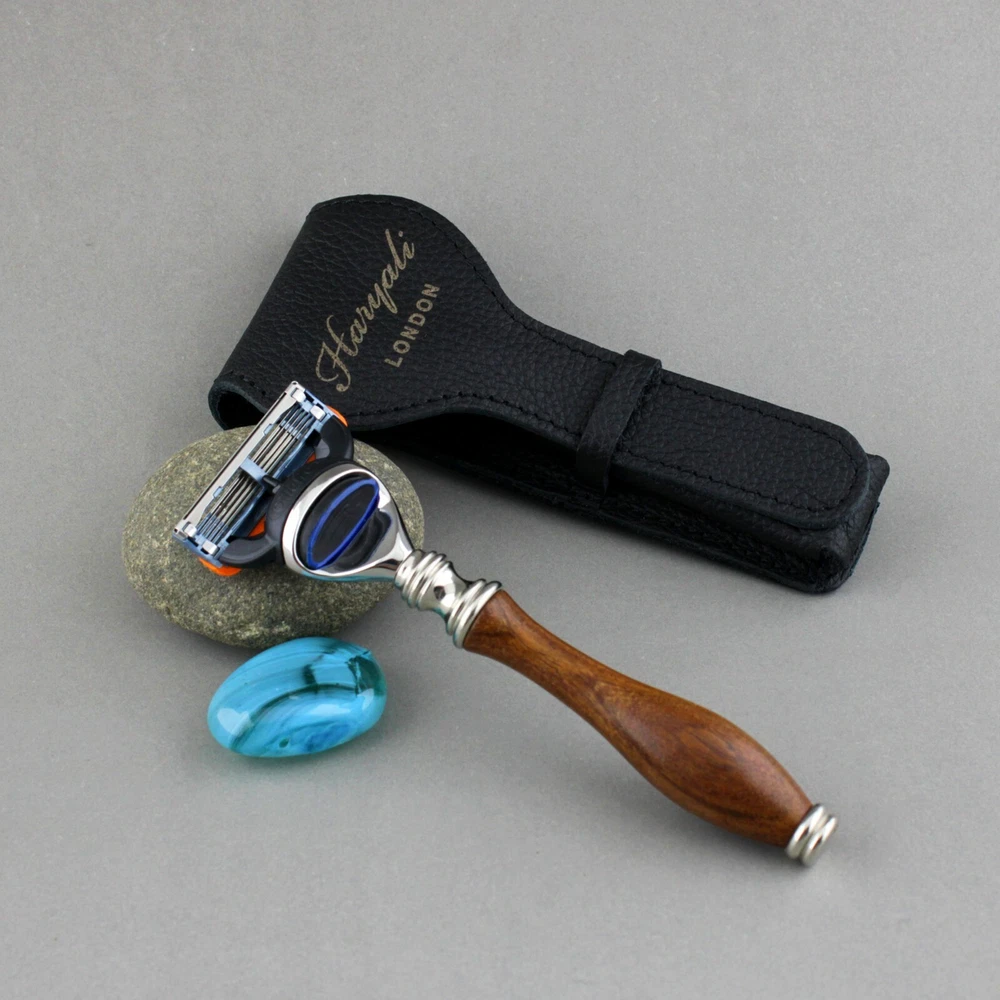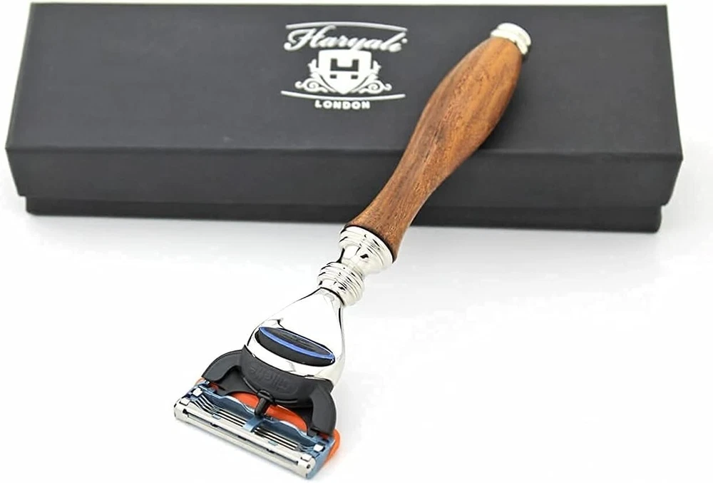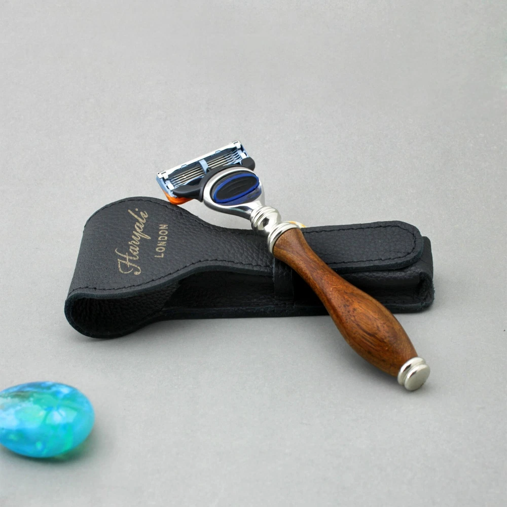 Haryali Men's Wooden 5 Edge Shaving Razor with Leather Pouch Case, Best for Gift This product data sheet is originally written in English. 5 Edge Razor & Leather Pouch/Case by Haryali London 5 Edge Shaving Razor (Wood Handle) HaryaliLondon presents 5 Edge Compatible shaving razor that is suitable equally for those having thick, rough, frizzy and growing hair. A steady look, grip and balance are essential for a shaving razor. To get an effortless, hassle free and smooth shaving experience. Having two extra edges as compare to mach 3 (3 edge) razor, the razor glides smoothly and eliminates irritation, pain and razor burns. It leaves no chance to come back for a second glide. All the edges work perfectly one after another and give a closer shave cut. Better shave in 1 stroke? Nothing is better than . Equally suitable for hair of any part of the body. Micro-fins act to smooth the skin before the edges touch and cut the hair in order to get a comfortable and close shave. The thin lubrication strip at the top of razor helps a smooth and great glide by producing lubricants. To get an optimal shave, make sure that to change the cartridge when lubrication strip gets white. The razor handle is made of pure wood that gives it a beautiful and natural look and durability along with firm grip and control. When ergonomics come in mind, the 5 edge compatible razor becomes a best option. This razor is long lasting. All you need to buy is the edges’ cartridge. It fits all standard size edges cartridge available everywhere around you. You simply can't get any better value for money in the long run. Razor Dimensions: Lenght: 15cm Head Width: 4cms Genuine Leather Case Our 5 Edge Protective Leather Case is perfect to keep your new razor safe at all times. Made of genuine leather and with a simple slide through fasting for an easy handling, this pouch is perfect for travelling. Efficient and elegant with Haryali London engraved logo. Pouch Dimensions: Lenght: 16cm Maximum Width: 6cms Package Includes: 1 x 5 edge shaving razor 1 x Razor pouch Having two extra edges as compare to mach 3 (3 edge) razor, the razor glides smoothly and eliminates irritation, pain and razor burns. It leaves no chance to come back for a second glide. All the edges work perfectly one after another and give a closer shave cut. Better shave in 1 stroke? Nothing is better than . Customer satisfaction is our first priority. If in any case you are not satisfied with your purchase and wish to return, please contact us and we will arrange 100% hassle-free replacement or refund without questions being asked, so you don't really have to lose anything. 2. Please leave us the positive feedback and good detailed seller rating after you received our package and satisfied with it. as you know, every seller works hard for positive feedback. and if you have any quest Having two extra edges as compare to mach 3 (3 edge) razor, the razor glides smoothly and eliminates irritation, pain and razor burns. It leaves no chance to come back for a second glide. All the edges work perfectly one after another and give a closer shave cut. Better shave in 1 stroke? Nothing is better than . Customer satisfaction is our first priority. If in any case you are not satisfied with your purchase and wish to return, please contact us and we will arrange 100% hassle-free replacement or refund without questions being asked, so you don't really have to lose anything. 2. Please leave us the positive feedback and good detailed seller rating after you received our package and satisfied with it. as you know, every seller works hard for positive feedback. and if you have any quest Brush Size -- Bowl Material -- Unit Type Unit MPN Does not apply Unit Quantity 1 Colour Brown Set Includes Razor pouch / case Set Includes Razor Bowl Diameter -- Handle Material Wood Brand Haryali London Model -- Type Shaving Kit Brush Material --