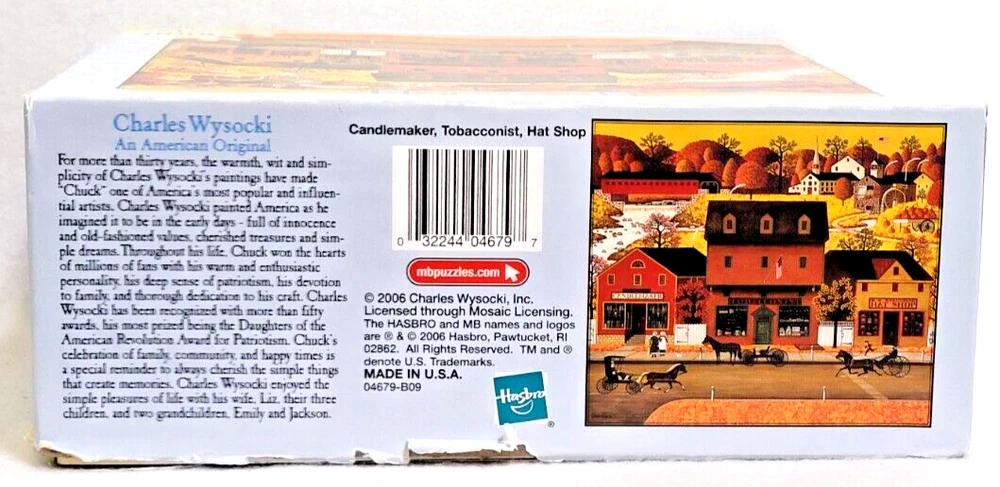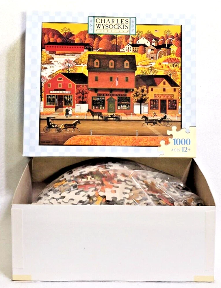 This 1000-piece jigsaw puzzle features a charming scene from Hasbro's Charles Wysocki collection. The puzzle showcases a beautiful landscape with a candlemaker, tobacconist, and hat shop in the foreground. The puzzle pieces are interlocking and made of high-quality cardboard, ensuring a durable and fun puzzle-solving experience. The puzzle is recommended for ages 10 and up and is perfect for anyone who enjoys solving puzzles. It comes from a smoke-free household and measures 22 9/32" x 25 9/16". The puzzle was made in the United States and is ideal for collectors and puzzle enthusiasts alike. From the box: Charles Wysocki painted America as he imagine it to be in the early days -- full of innocence and old-fashioned values, cherished treasures and simple dreams. Doing puzzles has some hidden benefits . Excellent qualities : Cultivate concentration, patience, and temper your will Movement development : Train hand-eye coordination and precise small movements Spatial intelligence : Improve visual discrimination of colors and shapes Critical thinking ability : Understand the relationship between parts and the whole, and draw inferences from one example to explore the future Relaxes your mind : Relieve work pressure and release yourself Brain development : Enhance memory and may help prevent or slow brain degeneration We did not work the puzzle or count the pieces, but we verify the number count at your request. Each item we ship is carefully packaged to prevent any damage and is shipped immediately with tracking.