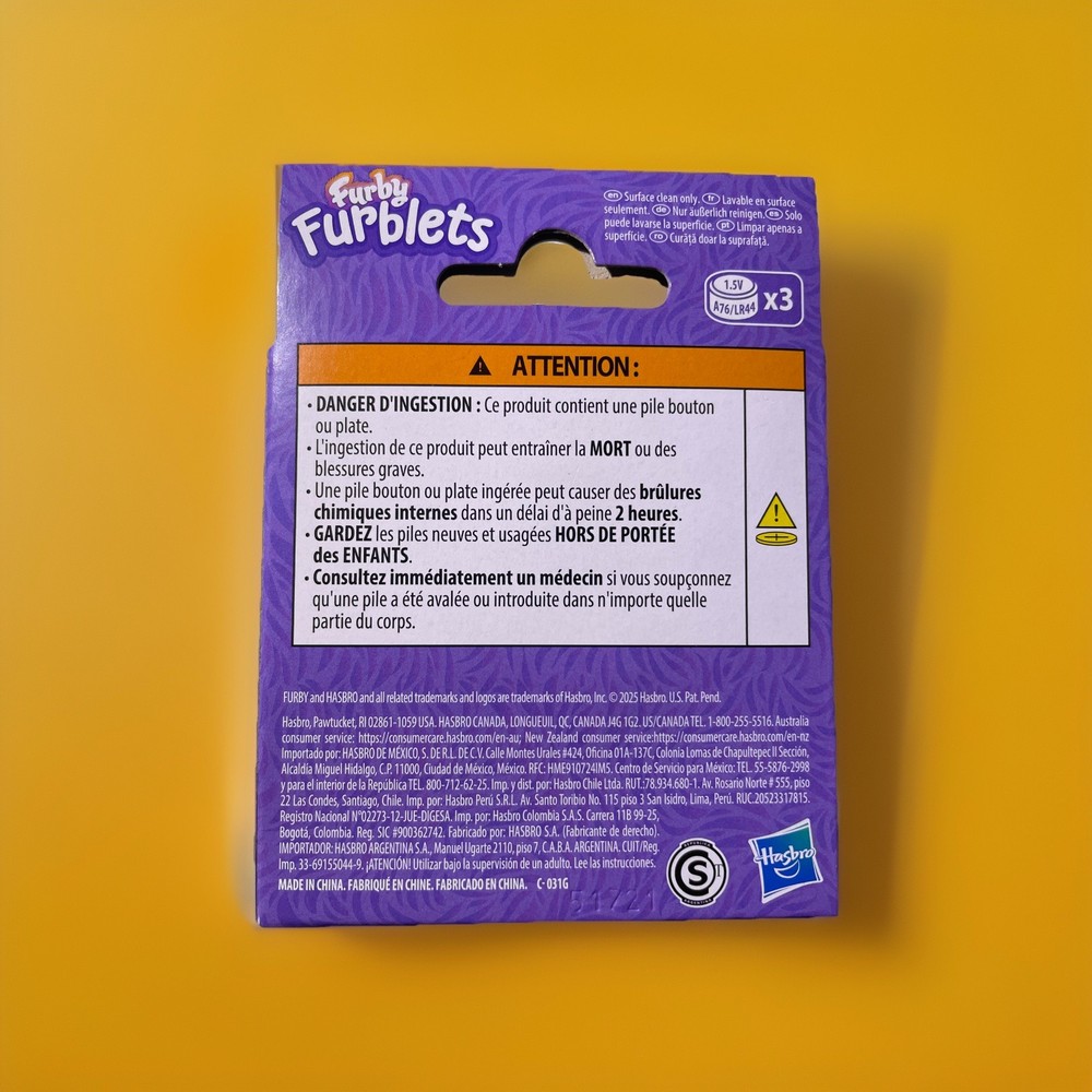 Celebrate in style with BEE‑DAY, the special‑edition Furby Furblet by Hasbro! This mini electronic friend is designed to look like a festive cupcake with a lit candle, and it sings a birthday song in Furbish — perfect for gifting, collecting, or adding a little party energy to any day. BEE‑DAY is part of the Furblets line of pocket‑sized musical companions and features fun sounds, bright colors, and adorable details that make it a standout in any collection. --- Features • Official Hasbro Furby Furblet – BEE‑DAY • Special Edition that resembles a cupcake with sprinkles and a candle • Sings “Happy Birthday” in Furbish • 45+ sounds, songs, and phrases • 3 ways to activate sounds: • Press the beak • Tap the heart gem • Interact during play • Vibrant colors: white body with rainbow sprinkles, pink faceplate/cup, blue heart gem, and orange/yellow candle hair • Recommended for ages 6+ • Includes button cell batteries (A76/LR44) --- Safety Note This product contains a button cell or coin battery. Ingestion hazard — can cause serious injury or death. Keep away from small children and follow all safety instructions on the packaging.