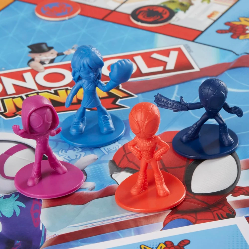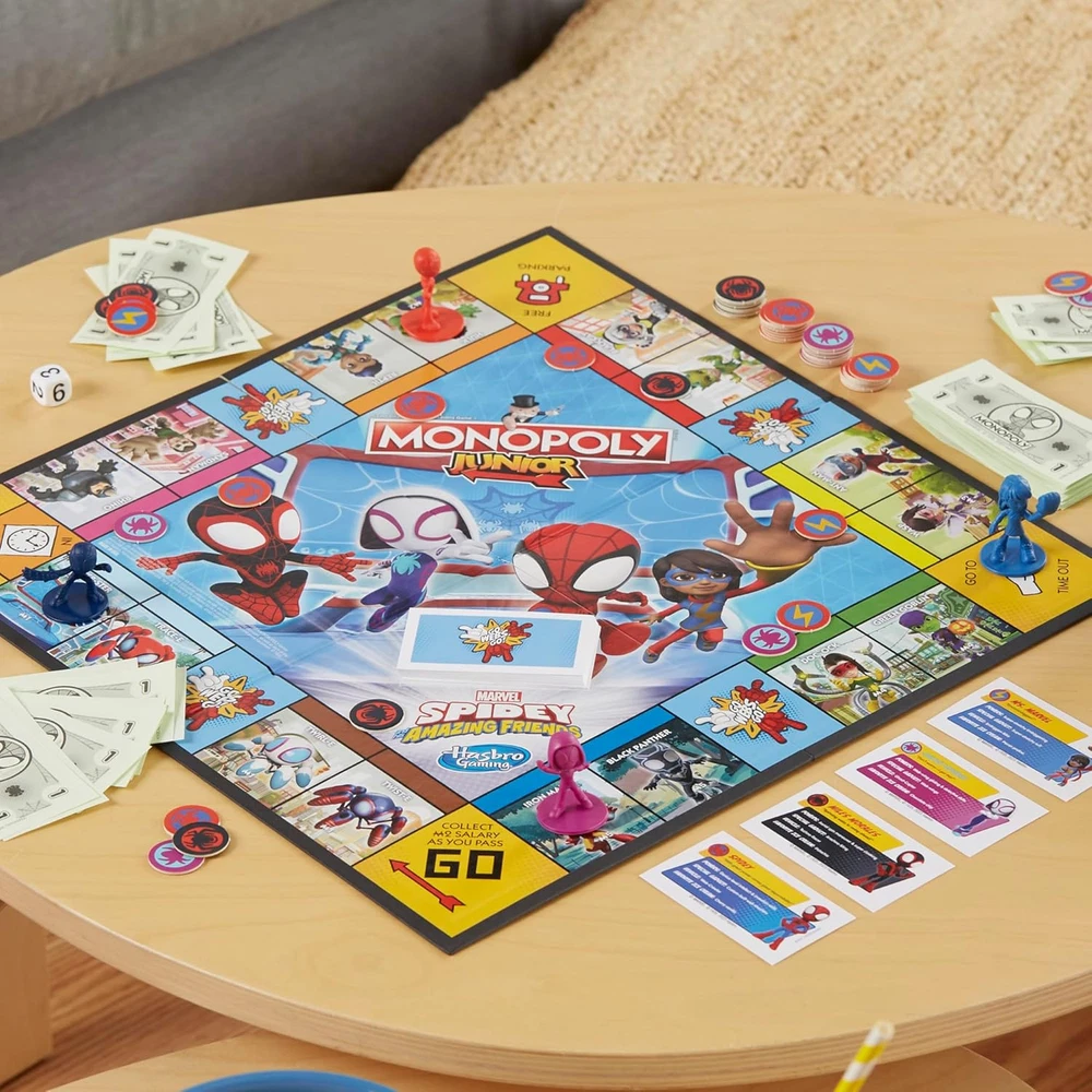 INSPIRED BY SPIDEY AND HIS AMAZING FRIENDS ANIMATED SERIES: In this Monopoly Junior: Marvel Spidey and His Amazing Friends game, team up with Amazing Characters to protect the friendly neighborhood PLAY AS MEMBER OF TEAM SPIDEY: Includes 4 Monopoly Junior game tokens. Kids can play as their favorite Team Spidey member: Spidey, Spider-Man, Ghost-Spider, or Ms. Marvel SPIDEY THEMED GAMEBOARD: In this Monopoly Junior kids game, Properties are replaced with Marvel Amazing Characters Spidey fans will recognize, such as Ant-Man, Doc Ock, Iron Man, Wasp, and Hulk COLLECT TEAMWORK FEES: Players move around the board teaming up with Amazing Characters and collecting teamwork fees. The player with the most Monopoly money at the end wins SIMPLIFIED MONOPOLY GAMEPLAY: This fun children's game is a good introduction to the Monopoly game for kids. It's designed to be fast, fun, and exciting for younger players GREAT GIFT FOR SPIDEY FANS: This Spidey preschool game is high-flying fun for playdates, Family Game Night, and rainy days, and it makes a great gift for boys and girls ages 5 and up It's Spidey-time! Kids can imagine protecting the friendly neighborhood as a member of Team Spidey with this Monopoly Junior: Marvel Spidey and His Amazing Friends Edition board game! In this edition, Properties are replaced by Amazing Characters that Spidey fans know and love. Players "swing" around the board as Spidey, Spider-Man, Ghost-Spider, or Ms. Marvel, as they try to team up with as many Amazing Characters as they can. Kids can enjoy placing a Team Spidey sign on their new team member and collecting teamwork fees. The bigger a player's team, the more Monopoly money they'll be able to collect from other players. When one player goes bankrupt, the game is over. The player with the most cash wins! This fun preschool board game for kids is designed for 2-4 players, and it makes a fun gift for Spider-Man and Marvel fans ages 5 and up. Copyright Marvel. The Hasbro, Hasbro Gaming, Parker Brothers, and Monopoly names and logos, the distinctive design of the gameboard, the four corner squares, the Mr. Monopoly name and character, as well as each of the distinctive elements of the board and playing pieces are trademarks of Hasbro for its property trading game and game equipment.