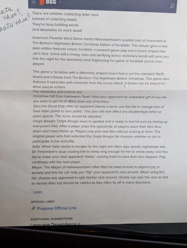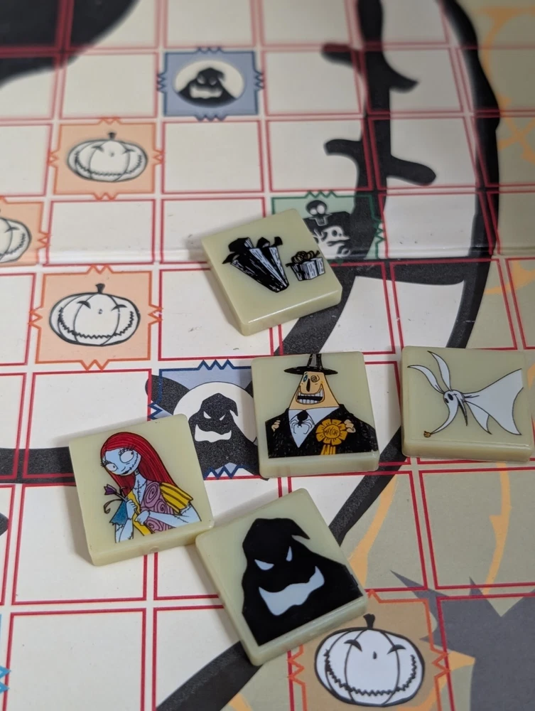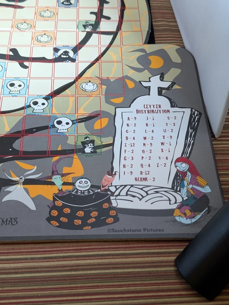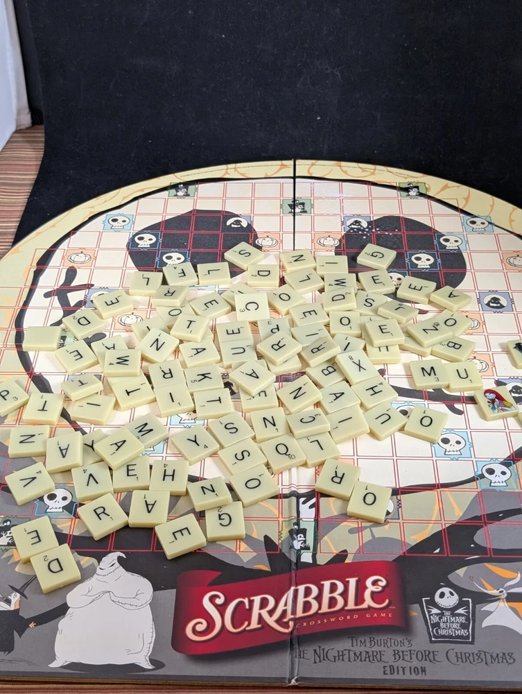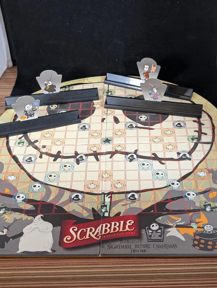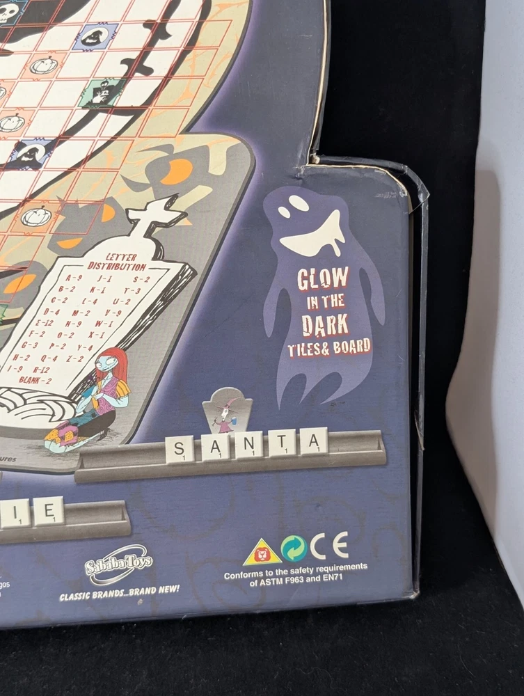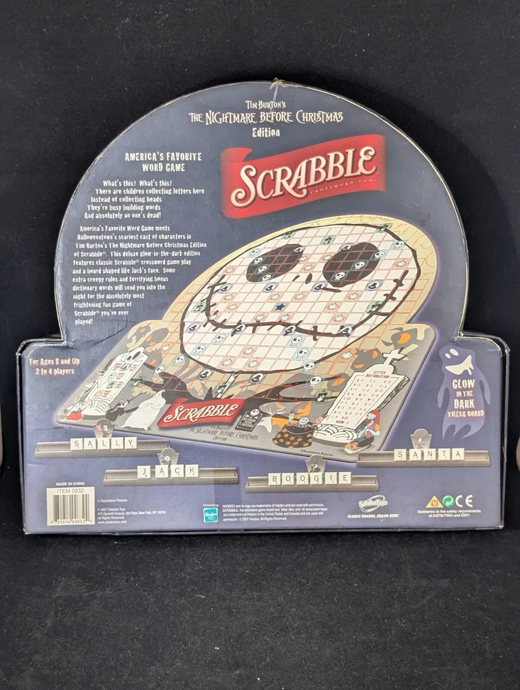 This Hasbro Scrabble game is a must-have for any fan of Tim Burton's The Nightmare Before Christmas. It is a complete board game that can be played by up to 4 players. The game includes all the necessary components, such as the board and tiles. The original instruction sheet is missing however a reprinted section with the rules concerning the deviation from regular scrabble is included. The game is perfect for boys and girls and was manufactured in the United States in 2007. It is a strategy game that can provide hours of fun for the whole family. The game is based on the popular Scrabble brand and features characters from the Nightmare Before Christmas movie.
