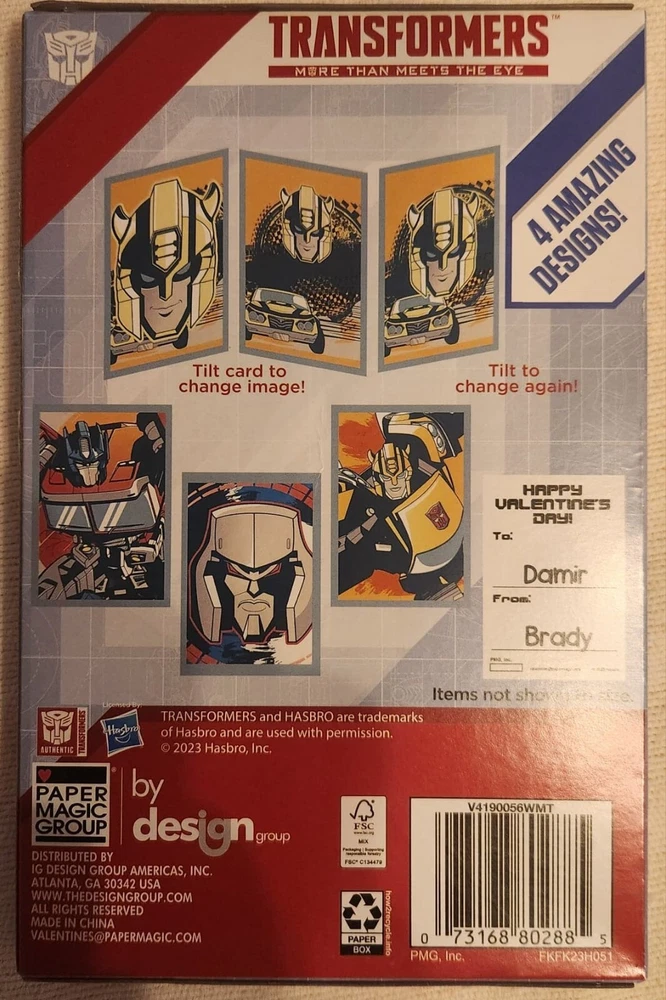 Celebrate Valentine's Day with the ultimate gift for Transformers fans! This set of 16 lenticular cards features the iconic Optimus Prime and Buzz from the beloved franchise. Made with high-quality cardboard material and vibrant multicolor designs, these cards are perfect for children ages 5-12 to gift to their friends on Valentine's Day. Each square-shaped card showcases a different image of Optimus Prime and Buzz, making it a unique and collectible item for fans of all ages. This original set, manufactured by Hasbro in 2023 and produced using kid-friendly techniques, is a must-have for any Transformers or robot enthusiast. Embrace the power of the Autobots and Decepticons this Valentine's Day with these amazing lenticular cards! Bin#W
