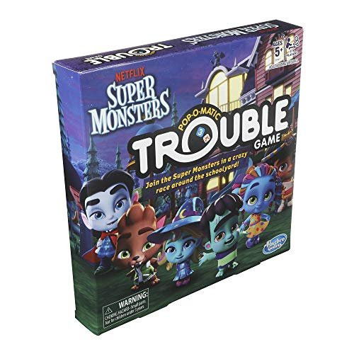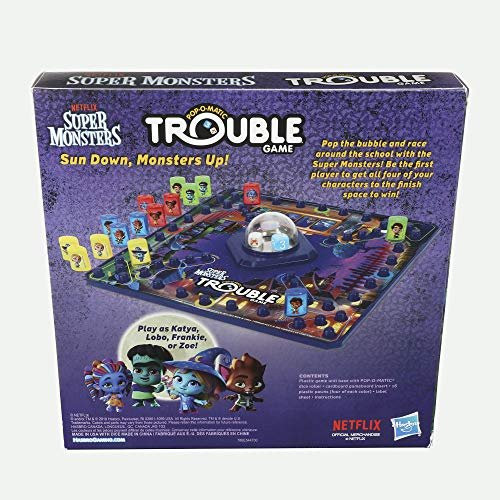 Hasbro Games Trouble: Netflix Super Monsters Edition Board Game for Kids Ages 5+ It's Trouble gameplay inspired by the popular kids' Netflix original series, Super Monsters. Choose to play as Katya, Lobo, Frankie, or Zoe while moving around the gameboard. Press the Pop-O-Matic dice roller and imagine racing around Pitchfork Pines. The first player to get all 4 characters to the Finish space wins. Do you remember playing the Trouble game when you were younger? Join your kids or grandkids in this Super Monsters edition of the classic game The board game is quick to set up, and kids as young as 5 years old can understand the easy game rules. It makes a great birthday gift, holiday gift, or a fun addition to your collection for family game night.