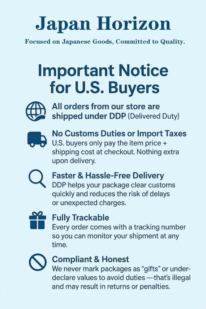 Important Q&A for U.S. Buyers Q: Why do other stores sell the same product with shipping at a much lower total price? Why are your items more expensive? A: For U.S. buyers, we use DDP (Delivered Duty Paid) shipping , which is safe, reliable, and recommended by eBay. Your total checkout price already includes item price, international shipping, import duties, taxes, and handling fees , so no additional charges upon delivery. Some stores that appear cheaper may not include import duties and related fees . You might need to pay these separately, delaying delivery. Other sellers might falsely declare items as "gifts" or use untracked shipping, which is not legally permitted . Shipping & Policies To United States Shipping is DDP (Delivered Duty Paid). All duties & taxes are prepaid ? no extra fees upon delivery . Expedited: 2?5 business days via SpeedPAK Economy: 8?15 business days via SpeedPAK To Other Countries Shipping is DDU (Delivered Duty Unpaid). Import duties & taxes are the buyer?s responsibility. Expedited: 2?7 business days via FedEx Economy: 7?21 business days via Japan Post About Japan Horizon Welcome to Japan Horizon-your source for authentic, high-quality Japanese products. We handpick each item to showcase Japan's craftsmanship, design, and culture. From timeless traditions to modern innovations, discover the essence of Japan and bring its charm into your everyday life.