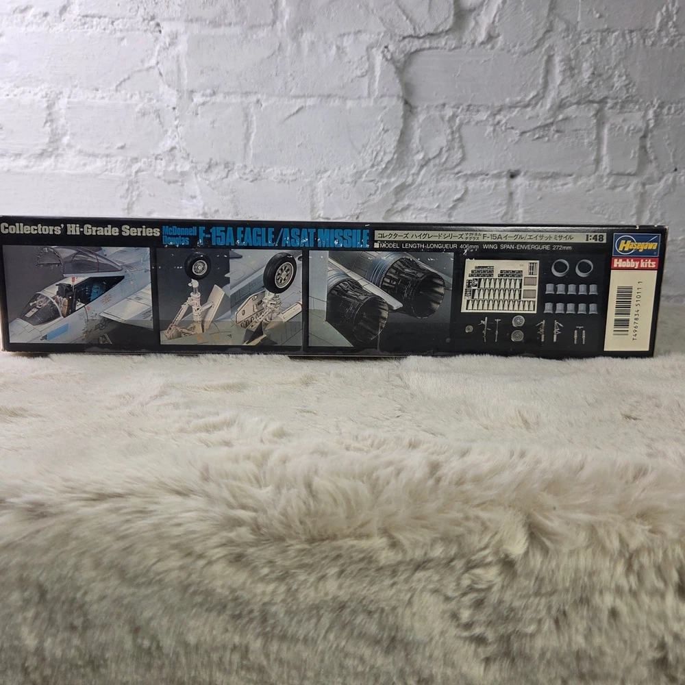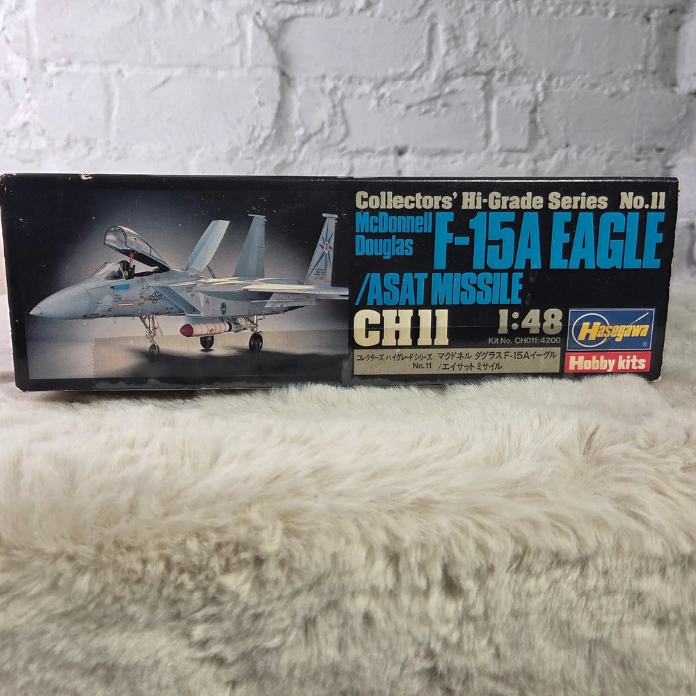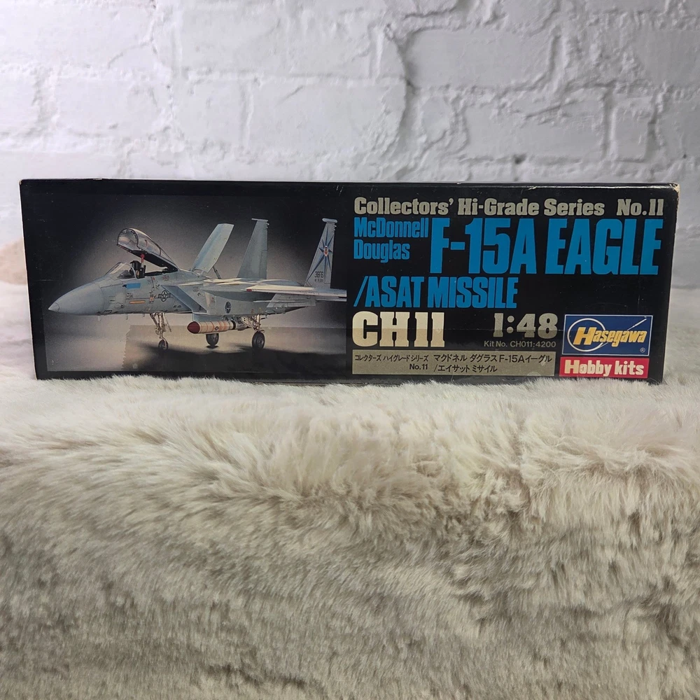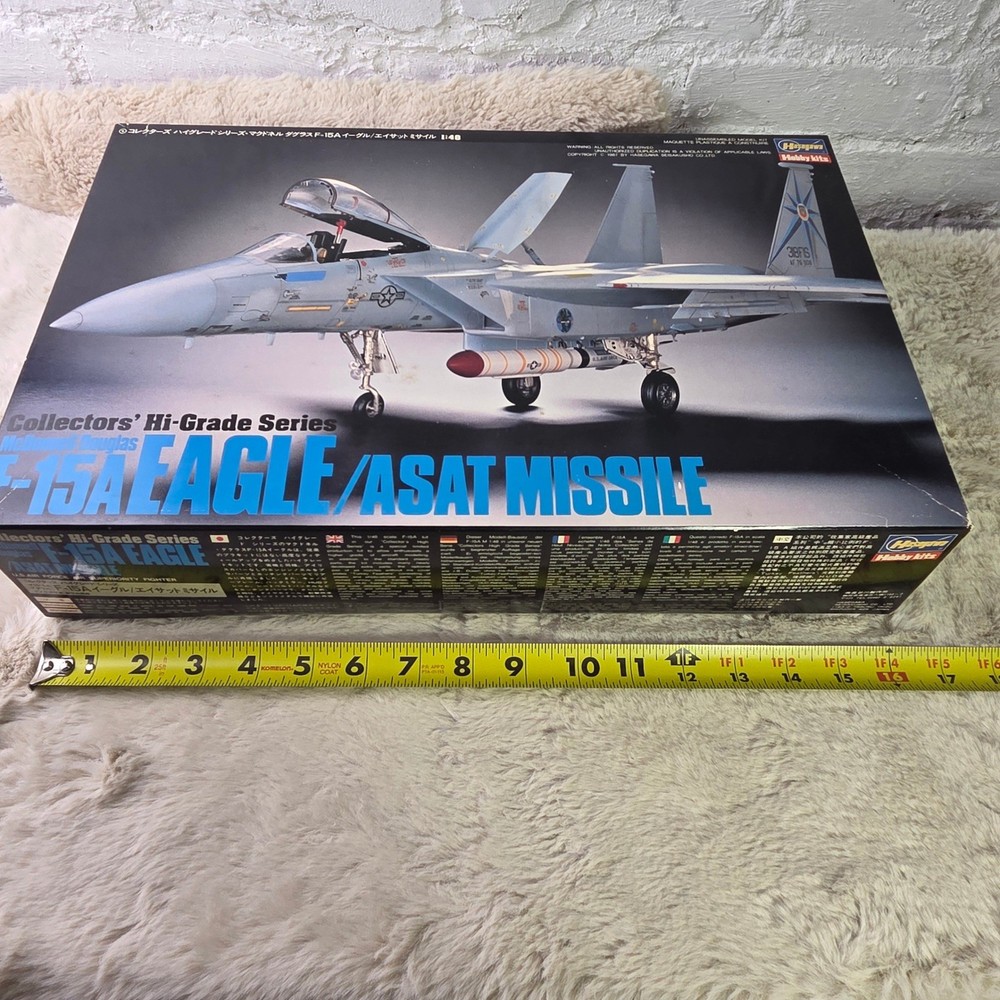 Hasegawa Collectors' Hi-Grade Series No. 11 McDonnell Douglas F-15A Eagle with ASAT Missile model kit. This 1:48 scale unassembled kit features high-quality plastic components alongside premium photo-etched and soft metal parts for enhanced detail. The kit includes specialized components for the ASAT (Anti-Satellite) missile, soft metal landing gear, and photo-etched interior and exterior accents. All parts remain in their original factory-sealed plastic bags. Measurements: • Model Length: 406mm • Wing Span: 272mm • Box Length: 16.5"