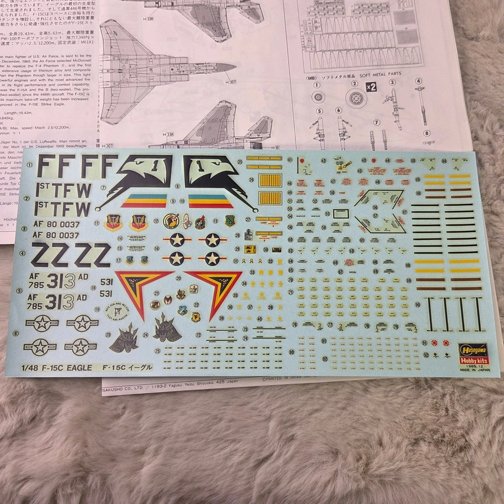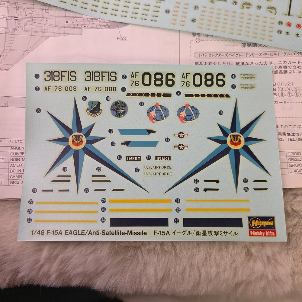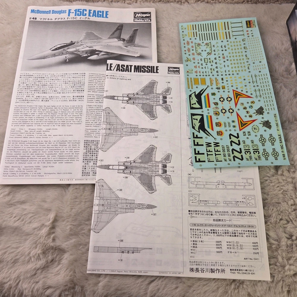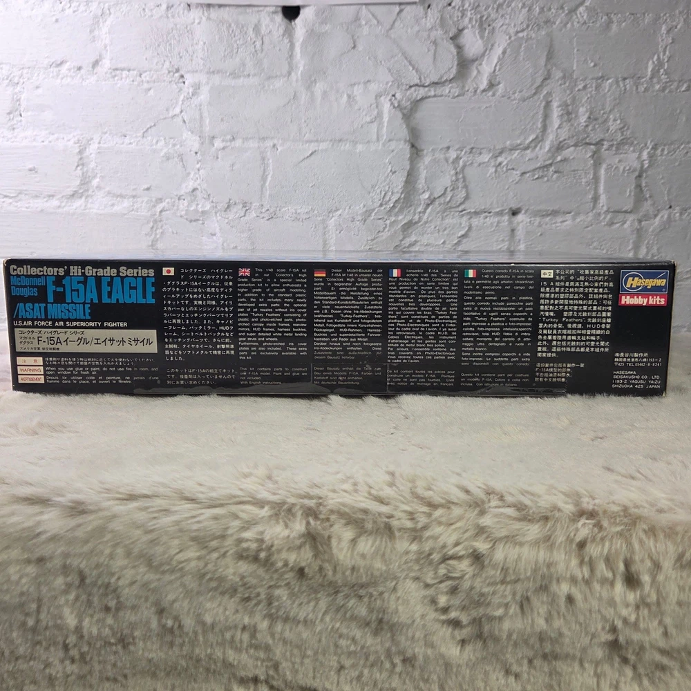 Hasegawa Collectors' Hi-Grade Series No. 11 McDonnell Douglas F-15A Eagle with ASAT Missile model kit. This 1:48 scale unassembled kit features high-quality plastic components alongside premium photo-etched and soft metal parts for enhanced detail. The kit includes specialized components for the ASAT (Anti-Satellite) missile, soft metal landing gear, and photo-etched interior and exterior accents. All parts remain in their original factory-sealed plastic bags. Measurements: • Model Length: 406mm • Wing Span: 272mm • Box Length: 16.5"
