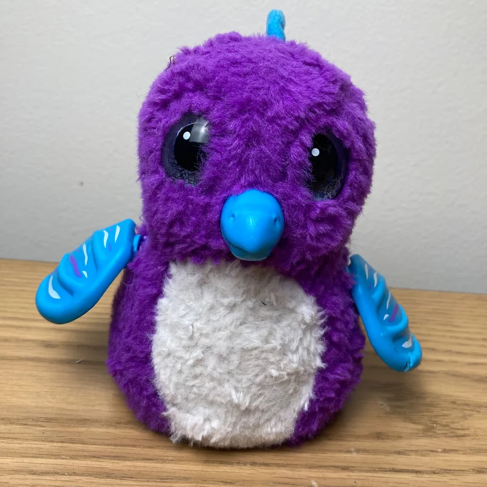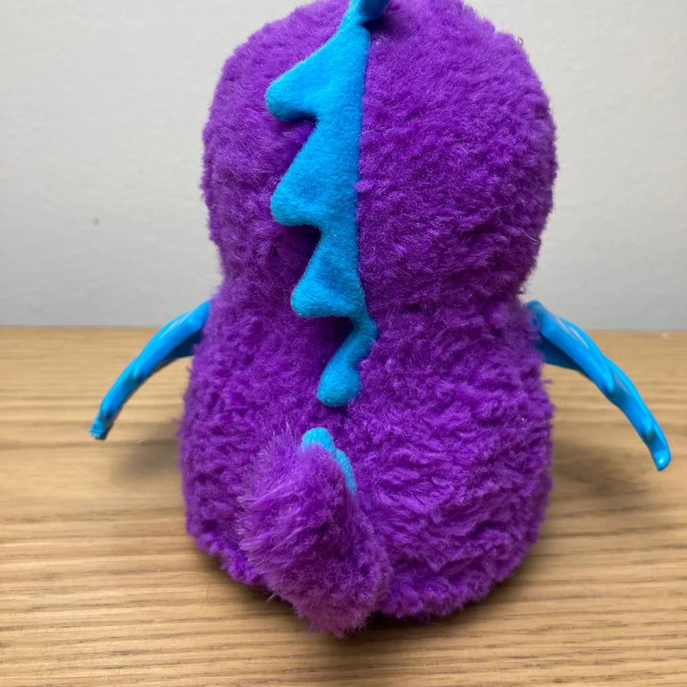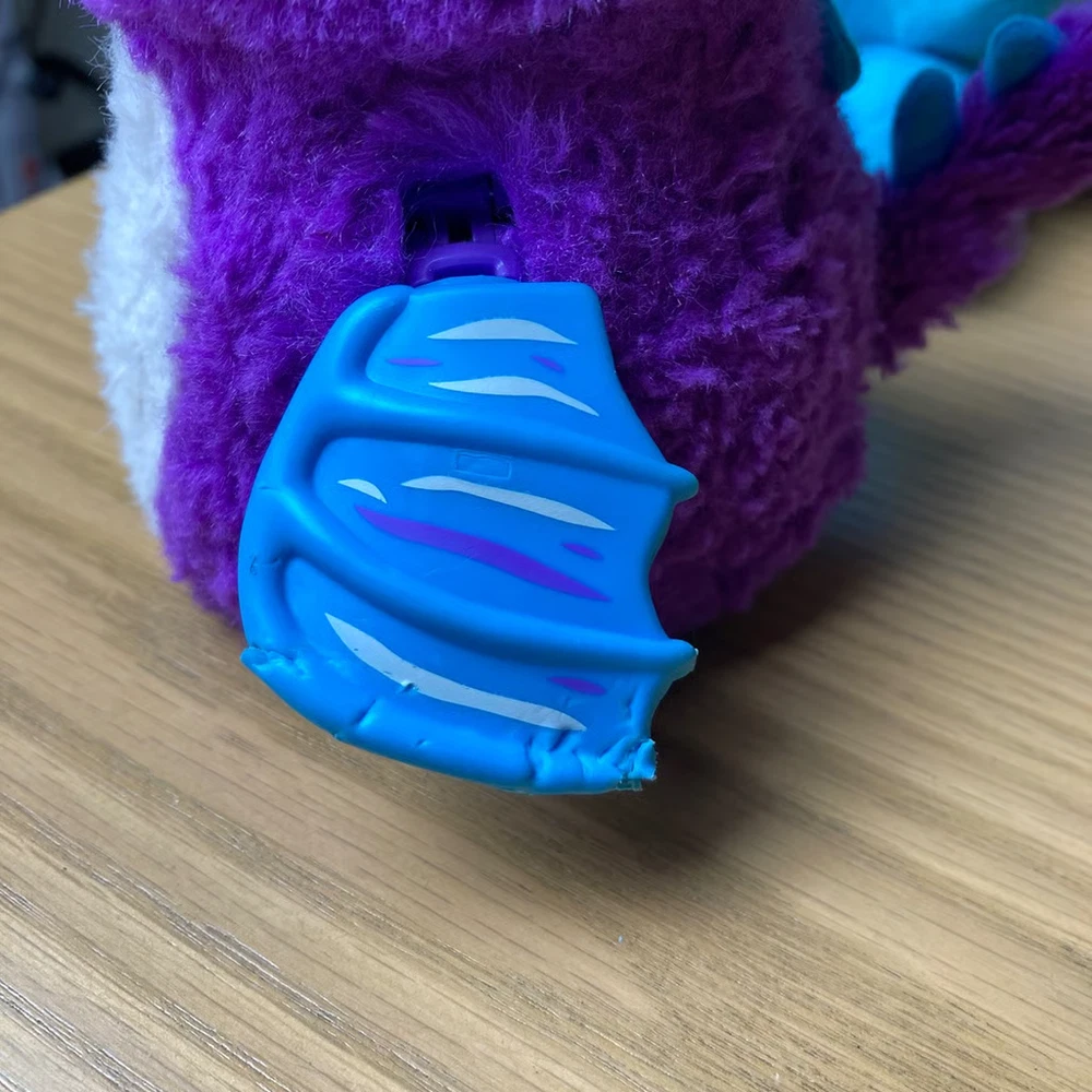 Great condition moving purple dragon toy. Verified working condition: eyes light up and toy moves around when turned on. One wing shows some minor bite marks - see photos for details.