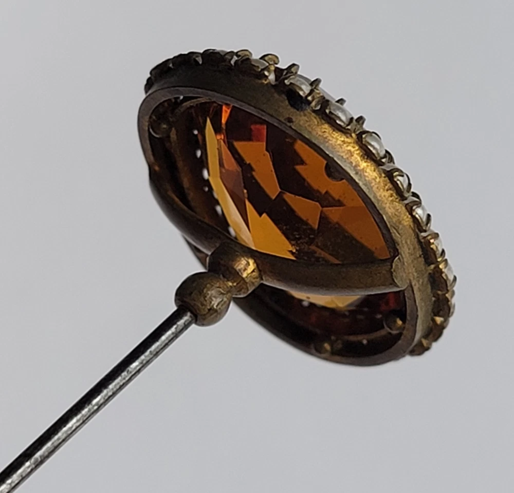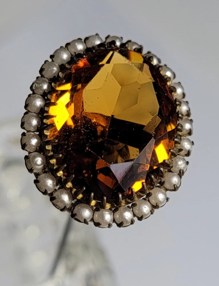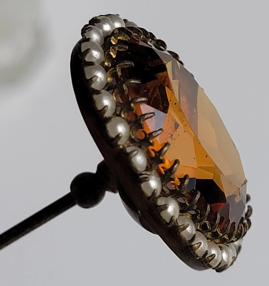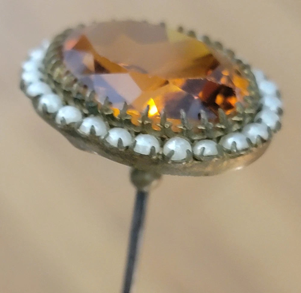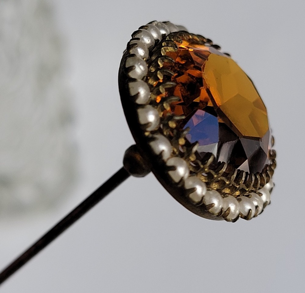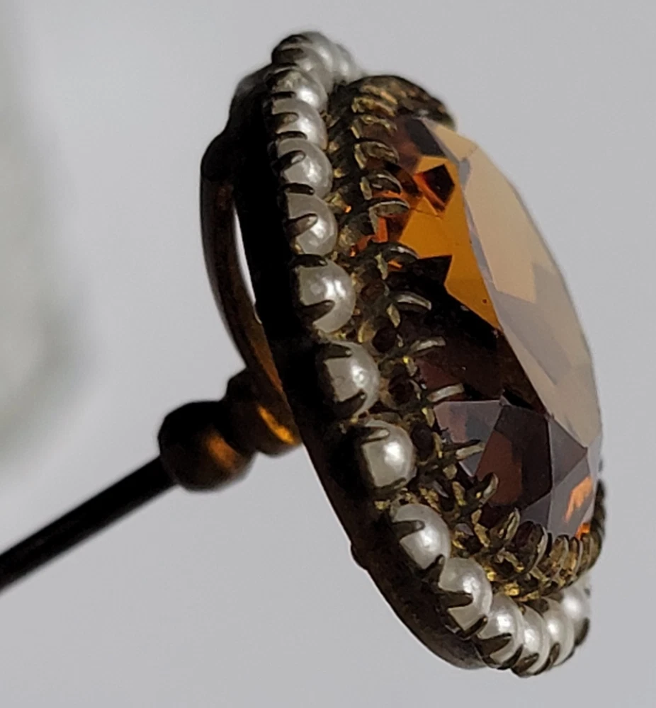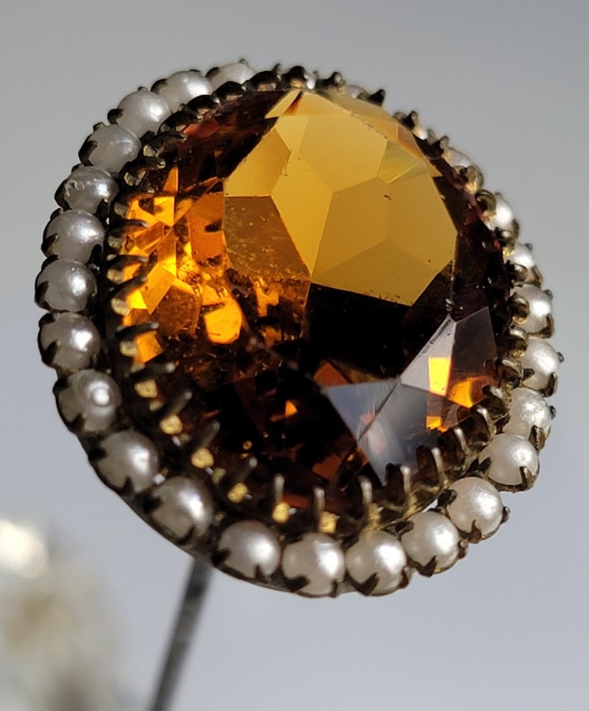Antique Hatpin ---- Halo Set Seed Pearls with Oval Cut Citrine, Topaz, or Amber? Faceted Center Stone set in Brass surround. Overall, Very Nice Condition! Beautiful shine/glow/display! Orange-Amber colored Center Faceted Stone shows signs of age with minimal blemishes/ware. See photos for details and condition. Thank you for looking and for your consideration!