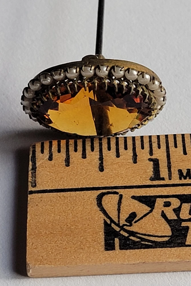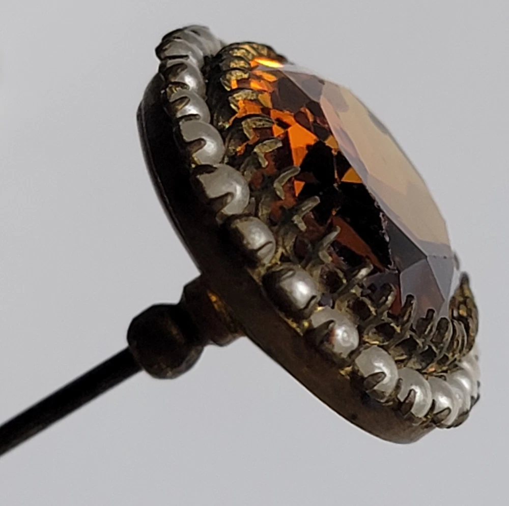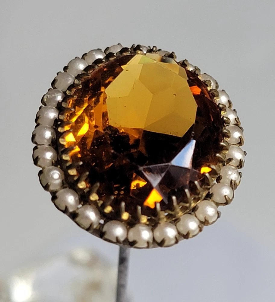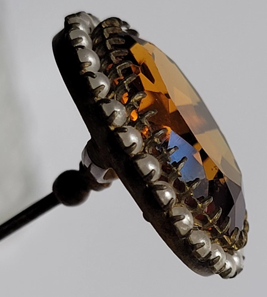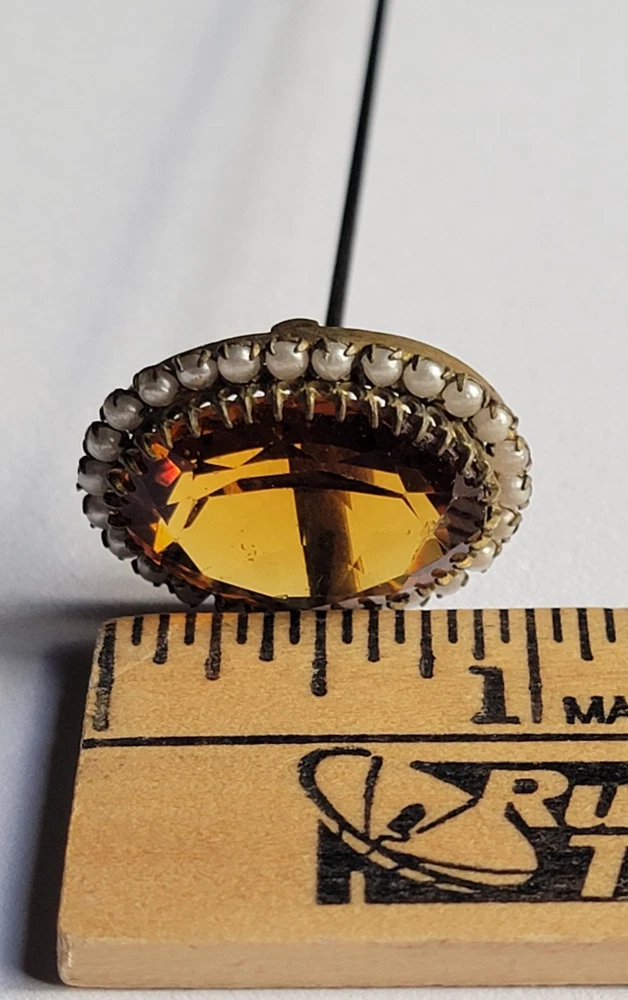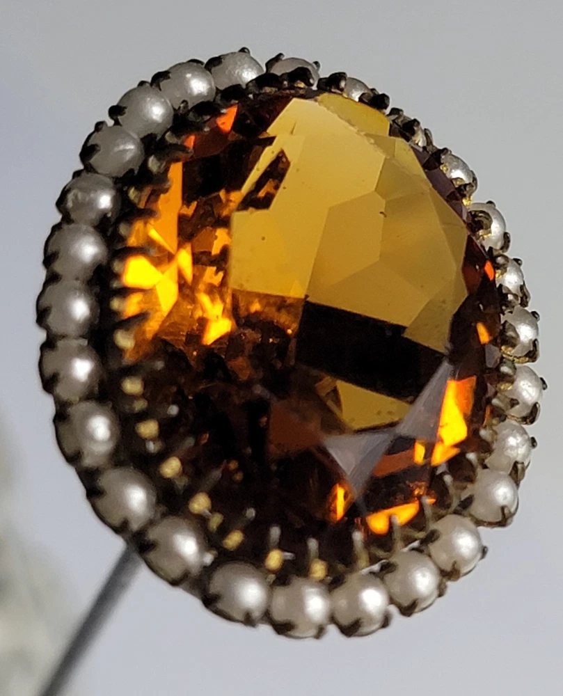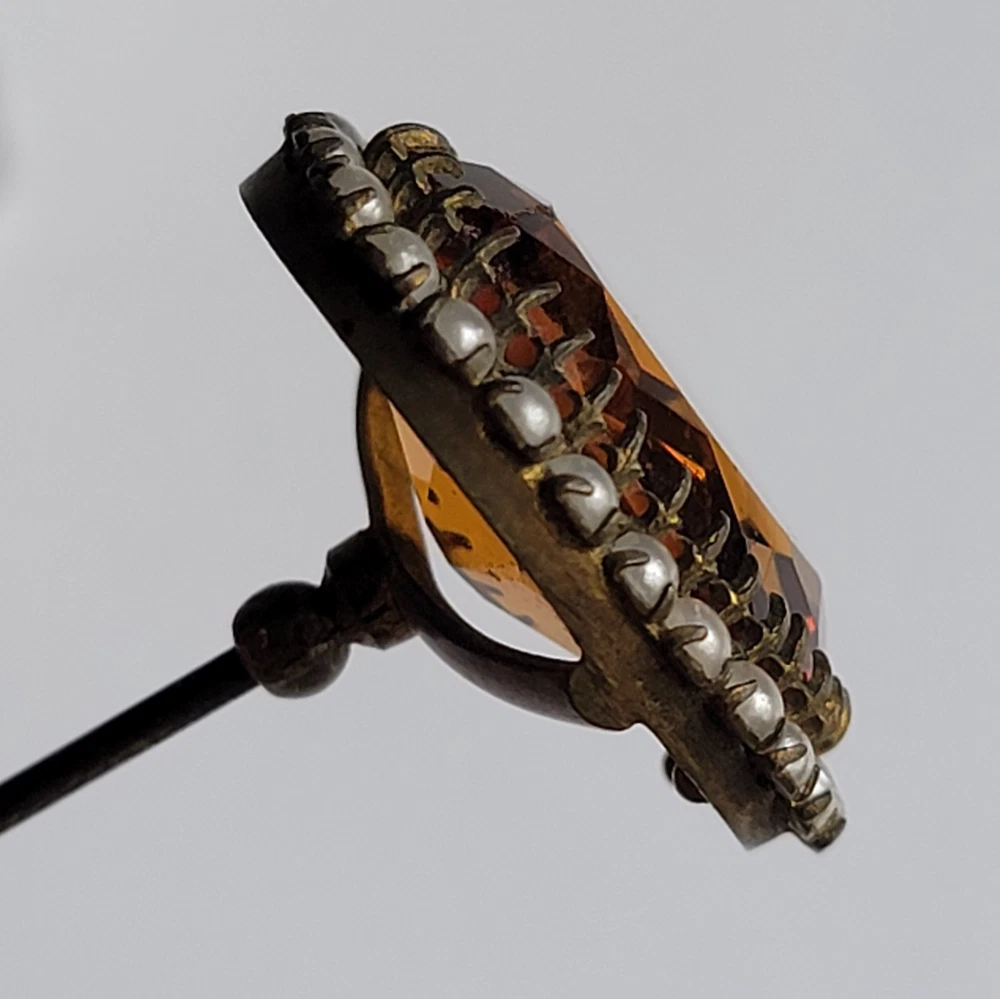 Antique Hatpin ---- Halo Set Seed Pearls with Oval Cut Citrine, Topaz, or Amber? Faceted Center Stone set in Brass surround. Overall, Very Nice Condition! Beautiful shine/glow/display! Orange-Amber colored Center Faceted Stone shows signs of age with minimal blemishes/ware. See photos for details and condition. Thank you for looking and for your consideration!