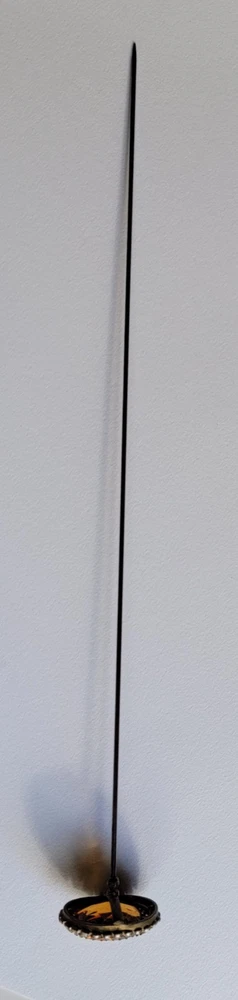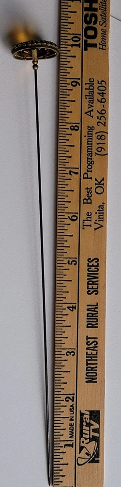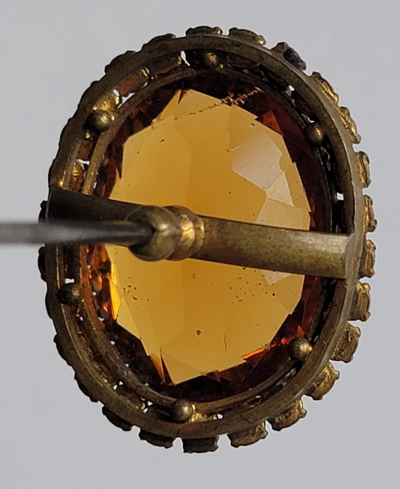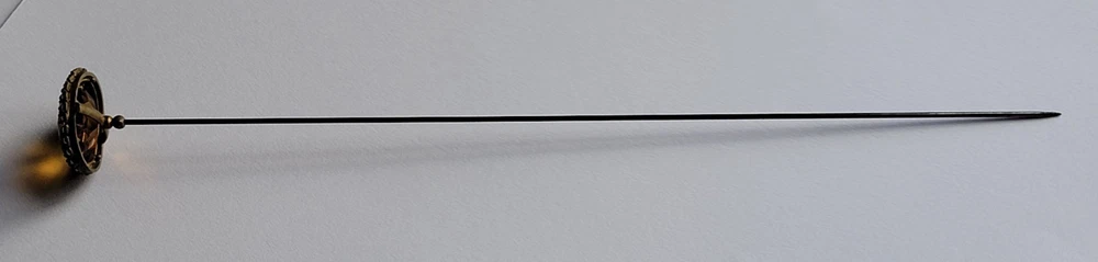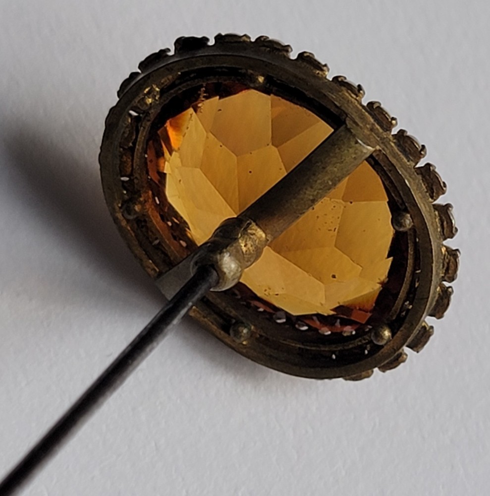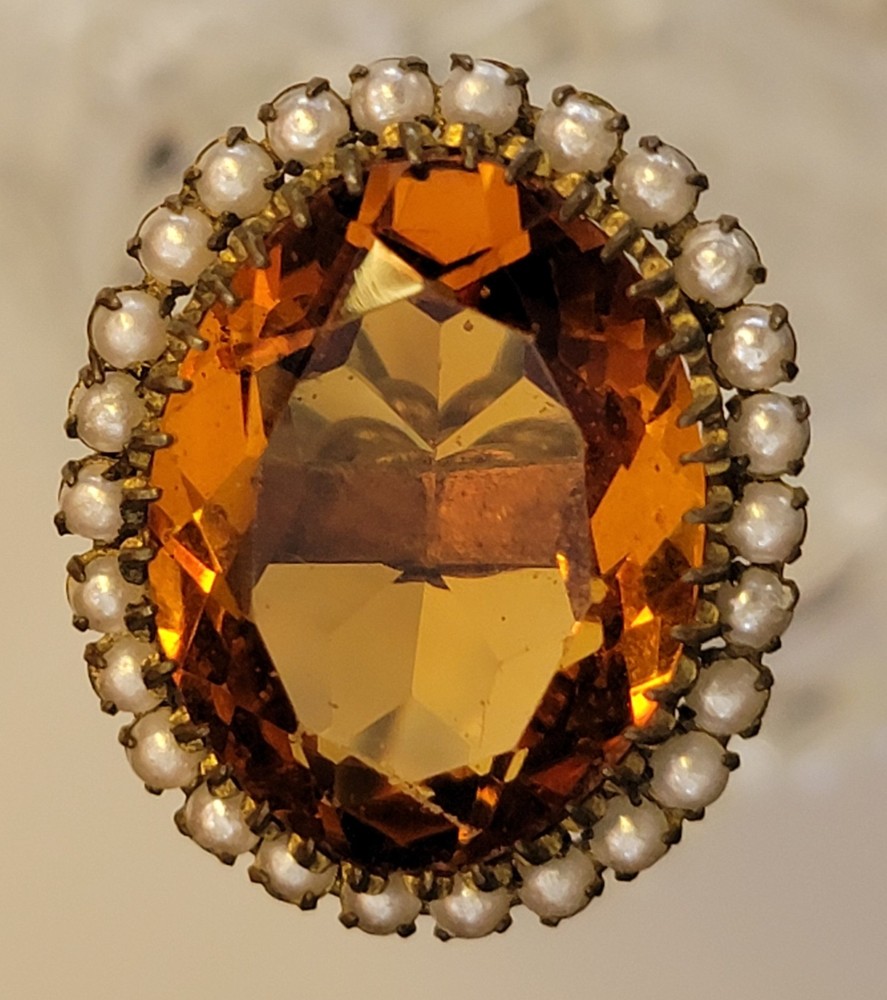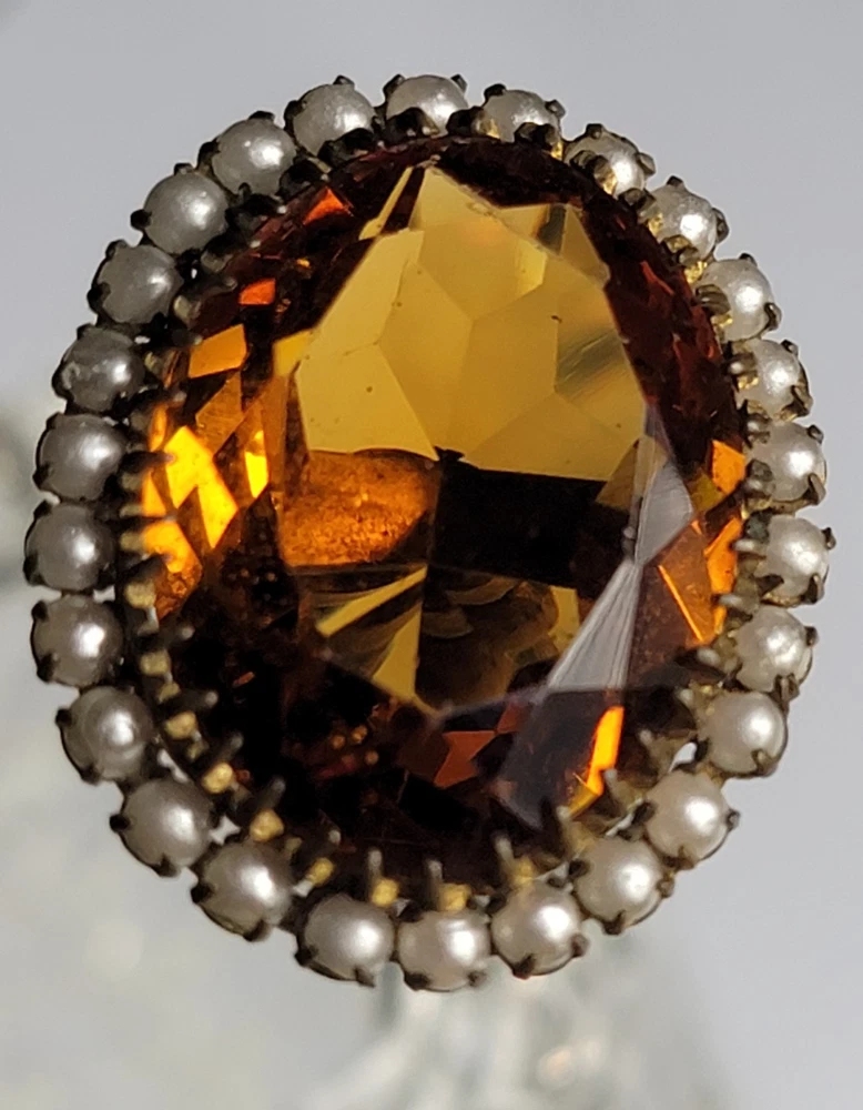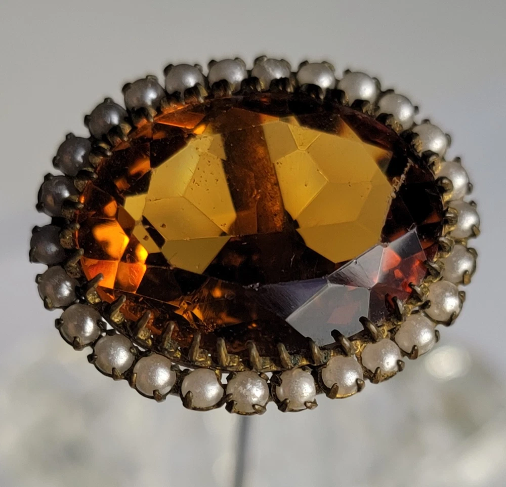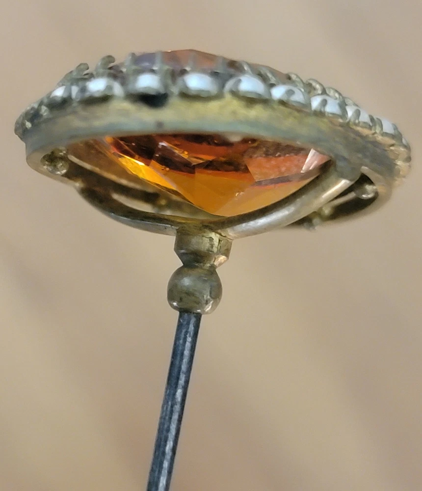 Antique Hatpin ---- Halo Set Seed Pearls with Oval Cut Citrine, Topaz, or Amber? Faceted Center Stone set in Brass surround. Overall, Very Nice Condition! Beautiful shine/glow/display! Orange-Amber colored Center Faceted Stone shows signs of age with minimal blemishes/ware. See photos for details and condition. Thank you for looking and for your consideration!