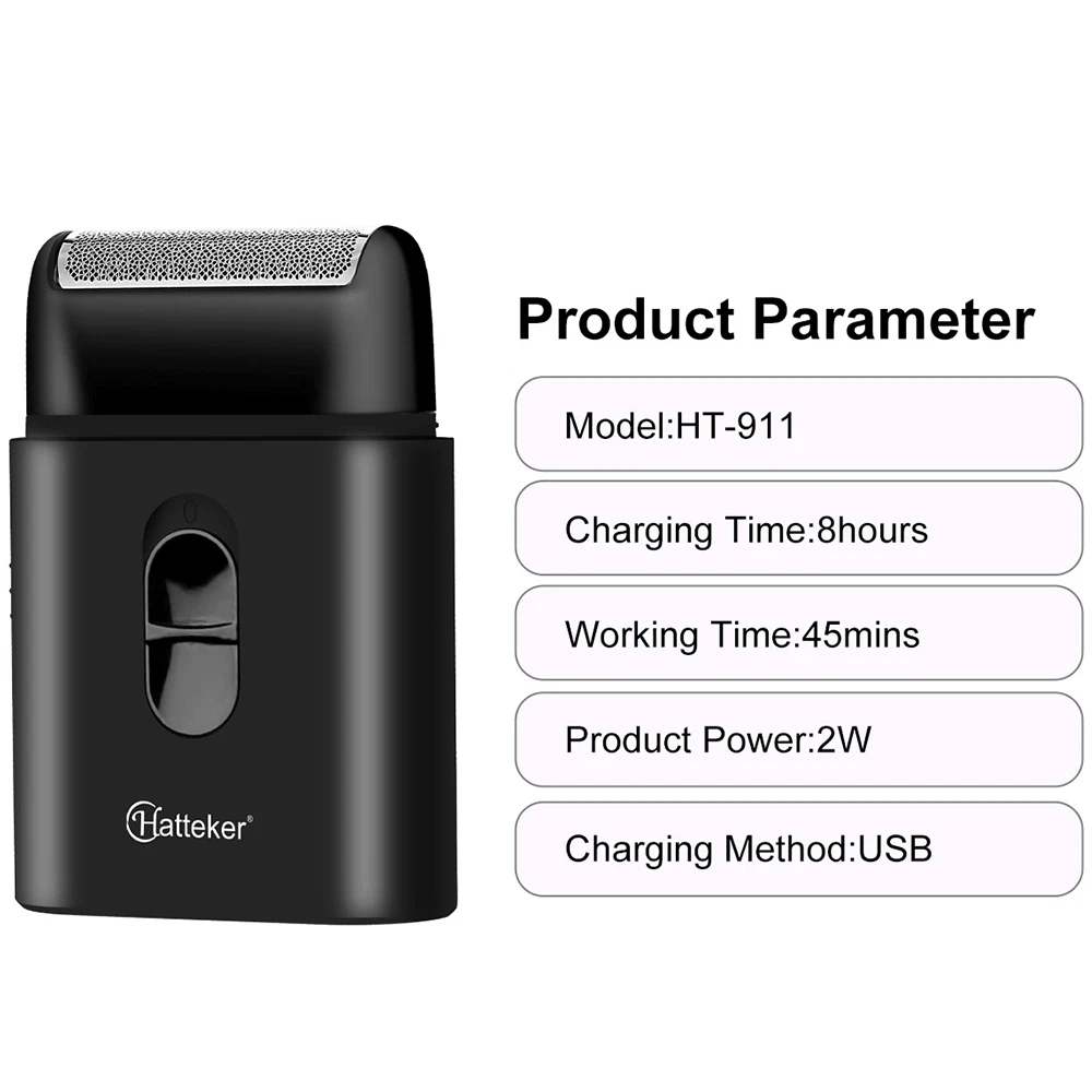 Description: The new electric rechargeable single-head razor and pop-up trimmer in a compact and convenient body for easy portability. New design upgraded cutter head, shaving clean and not stuck. Brand: Hatteker Product name: Shaver Product Model :HT-911 Color box size: 9.1X4X12.4CM Product size: 8*5.2cm/3.1* 2inch Battery: 3w Charging time :8 hours Usage time: 45 minutes Accessories: USB cable (type-c), cleaning brush, multinational manual