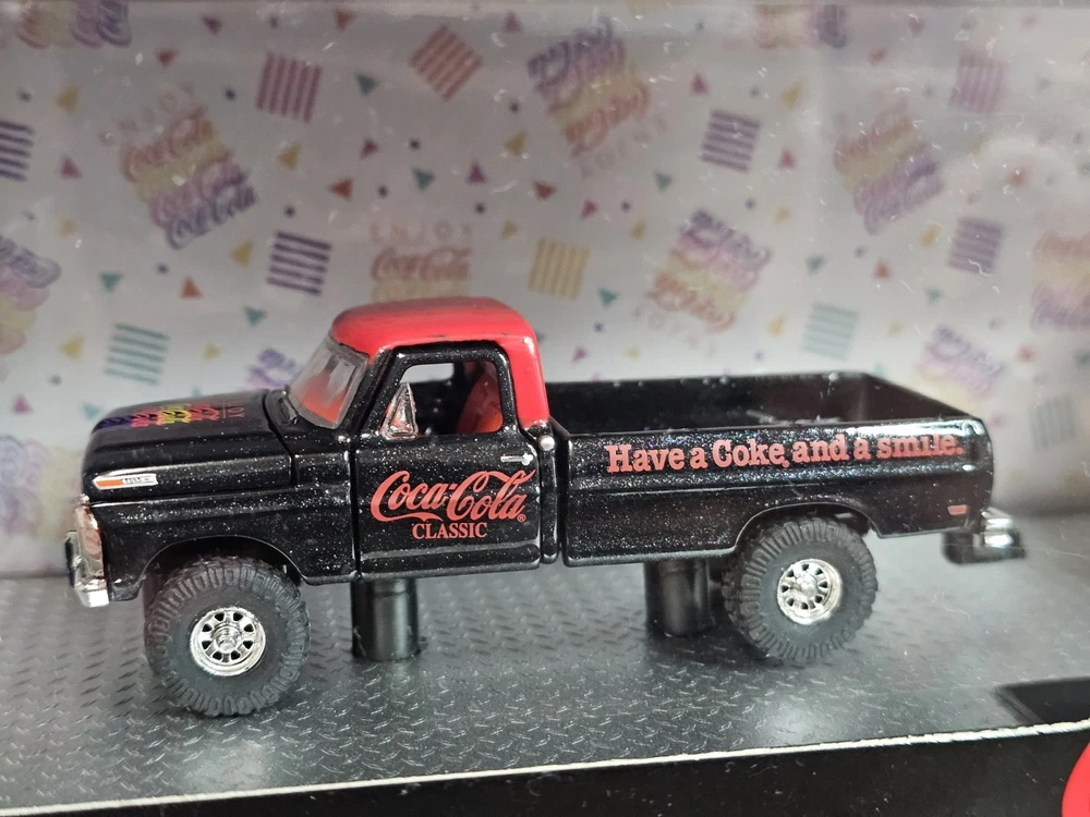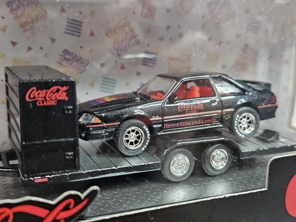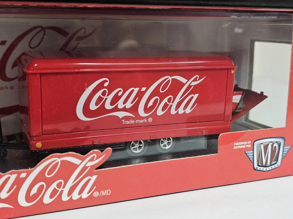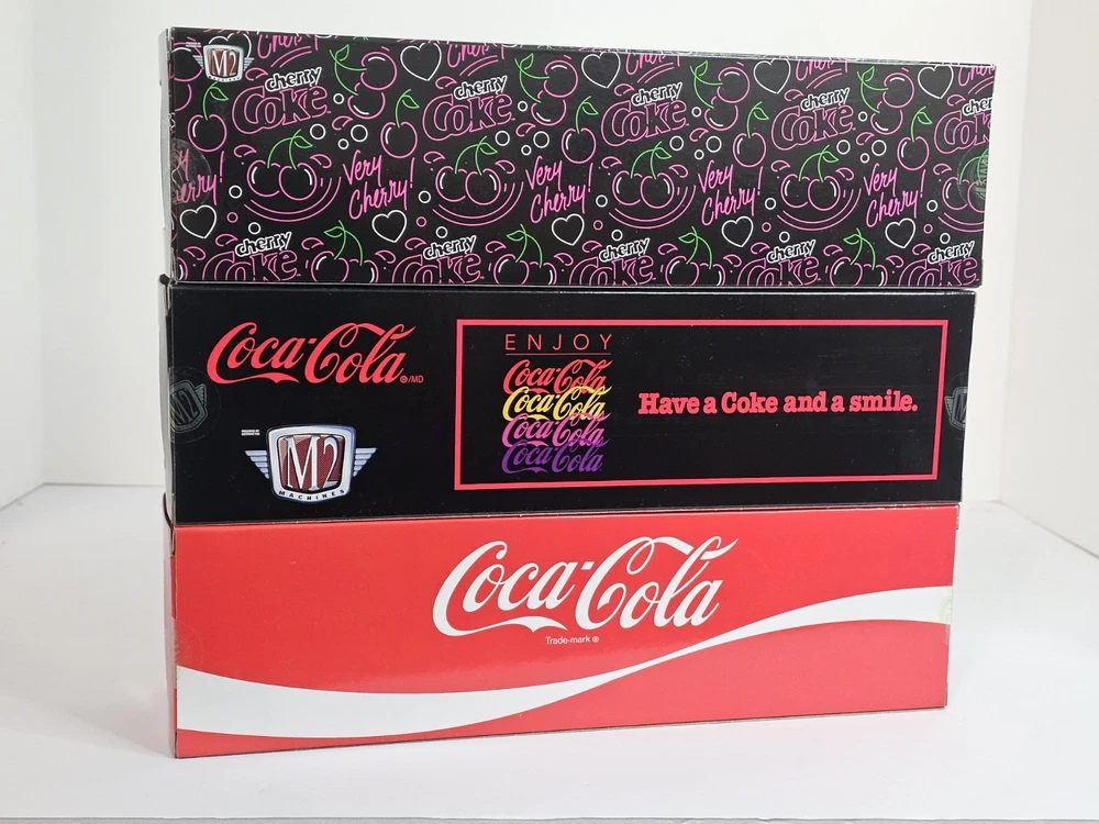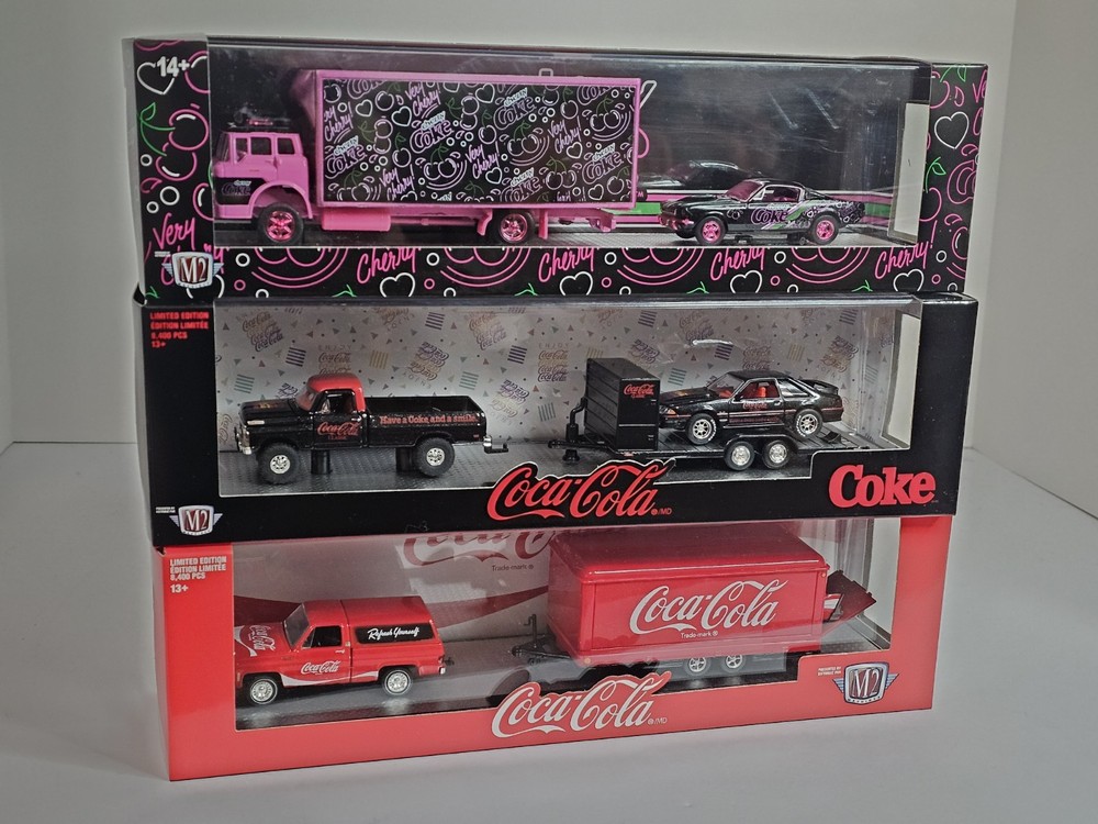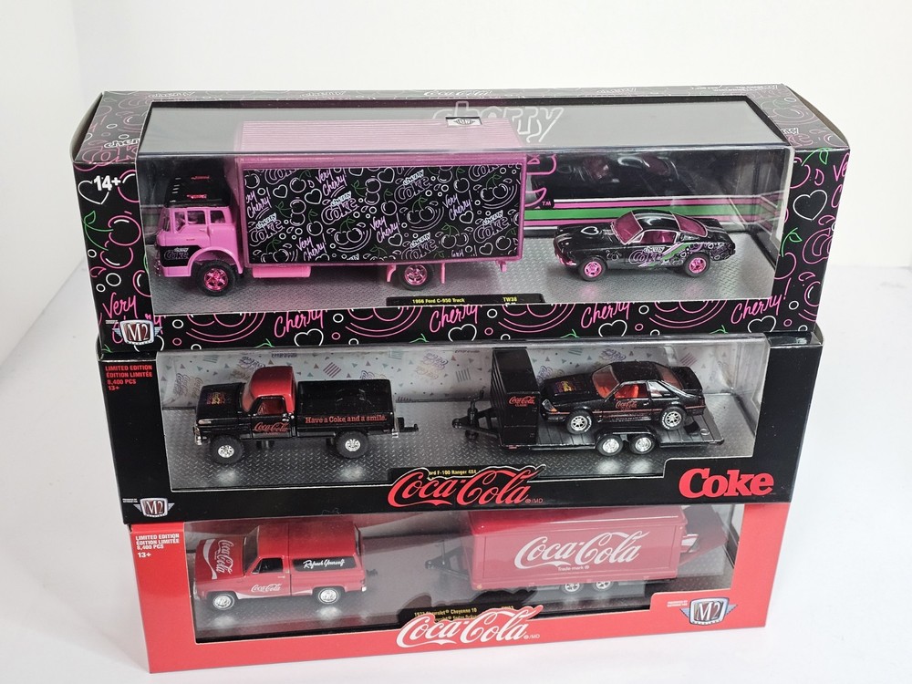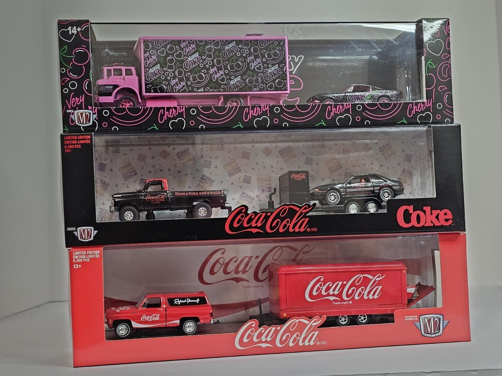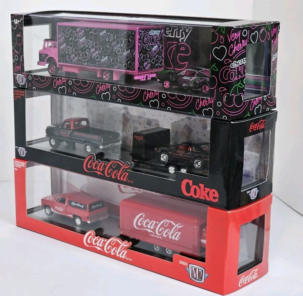 The product is a lot of 3 diecast M2 Machines haulers, including 1 chase version and 2 basic versions. The vehicles feature a multi-color Chevrolet and Ford Mustang theme from the Coca-Cola series. These 1:64 scale models are made of diecast material and are designed for boys and girls aged 12-16 years old. With a 2020 manufacture year, these collectible M2 Machines vehicles offer a fun and unique addition to any toy or diecast collection.