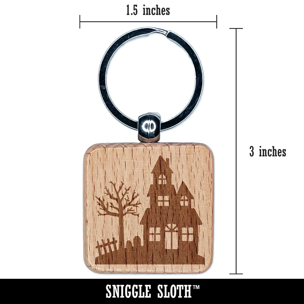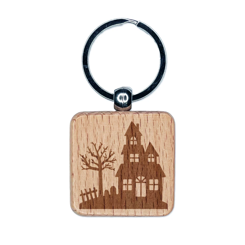 Haunted House Halloween Engraved Wood Square Keychain Tag Charm