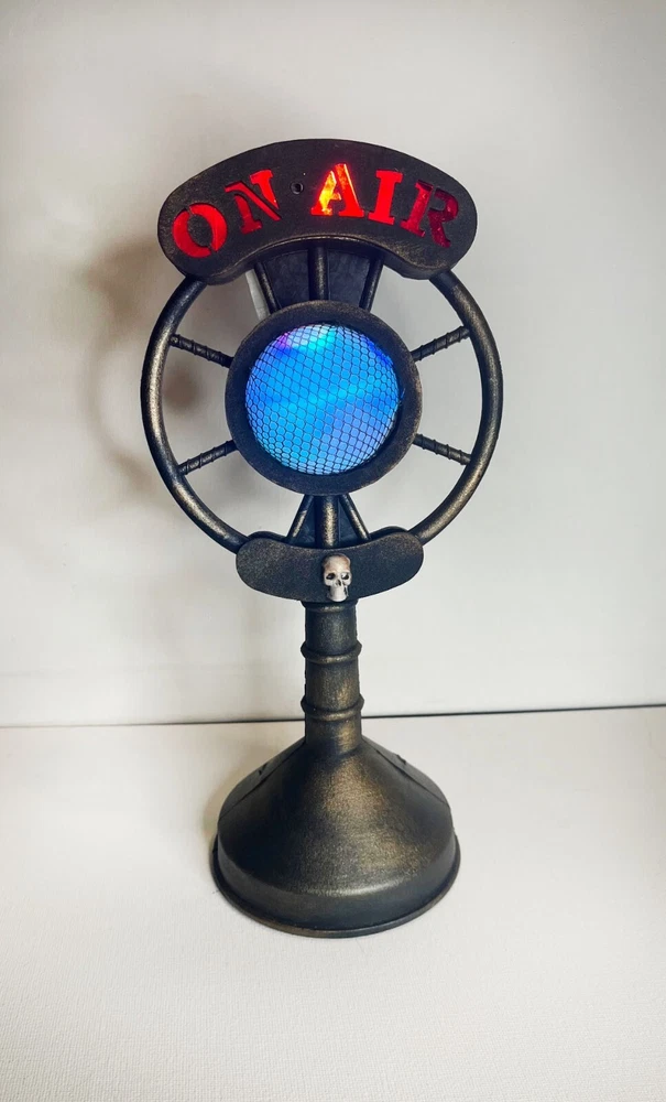 Get ready to add some spooky vibes to your Halloween decorations with this Haunted On Air Radio Halloween Decoration. The microphone prop is perfect for creating a spooky broadcasting station. Light ups and broadcasts creepy spooky messages. Motion activated. Requires 3 AA batteries.