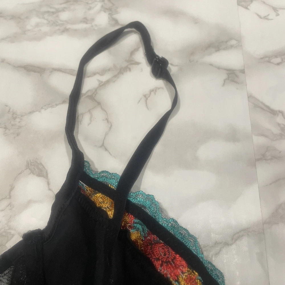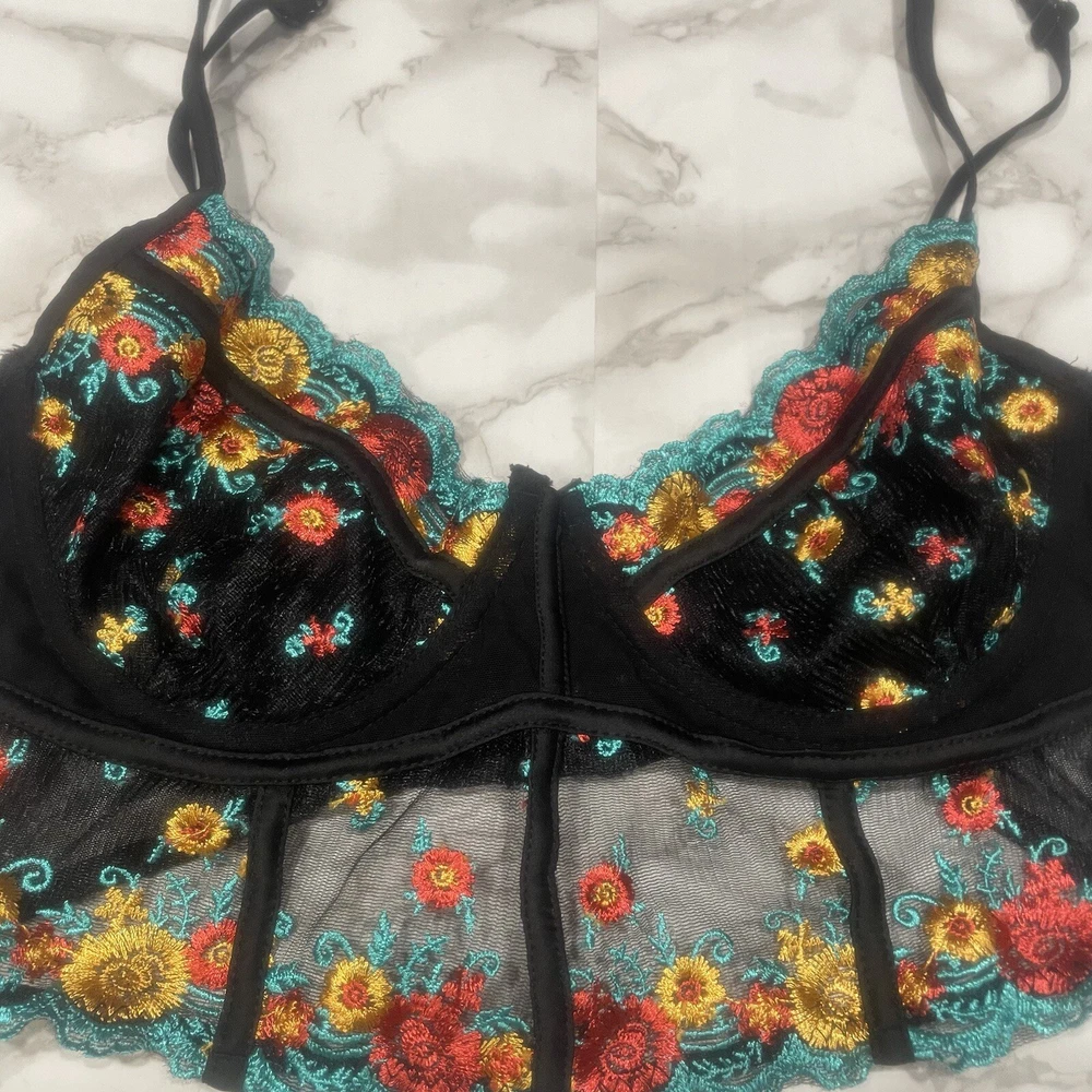 HAUTY BLACK FLORAL BRA: Details: bra, floral, red, yellow, blue, hook closure, lace, adjustable straps, preowned, mesh, lingerie, stylish, sexy Weight: 1.7 oz *All Measurements are Approximate* *All Offers Welcome (I Accept or Counter)* ~Smoke-free home~