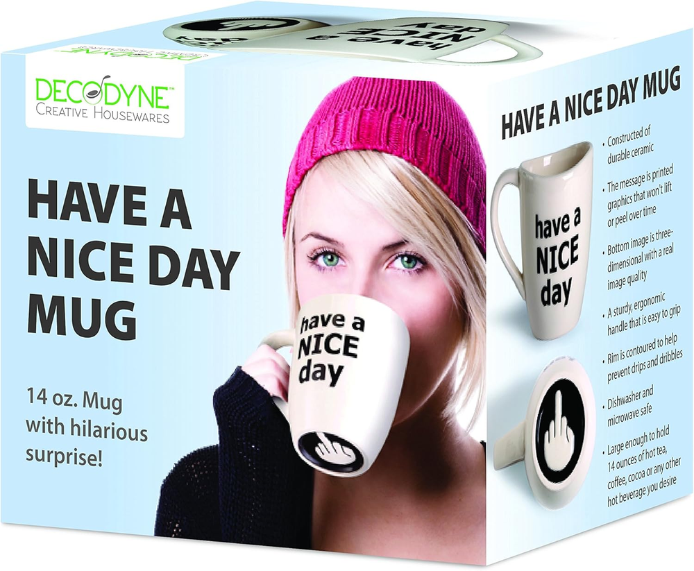 Store New Arrivals Add to Favorite View Feedback Contact Have a Nice Day Coffee Mug, Funny Cup with Middle Finger on the Bottom 14 Oz. - by Description Item model number DZ-5275 Style Coffee cup Number of Items 1 Pattern Letter Print Theme Funny Unit Count 1 Count Material Ceramic Capacity 414 Milliliters Batteries required No Product Dimensions 4"W x 5"H Volume 414 Milliliters Age Range (Description) Adult Is Discontinued By Manufacturer No Specific Uses For Product Hot Drinks Included Components Handle Reusability Reusable Item Weight 12.3 ounces Material Feature ceramic Material Type Free Lead Free Special Feature Printed Color White Shape Round Recommended Uses For Product Home Product Care Instructions Hand Wash Only, Machine Wash Size 14 Ounces A hilarious surprise From the side, this coffee mug sends a cheerful message, but from the bottom it shows how you really feel, Great cool stuff for Gifting or as a white elephant gifts for adults, Weird stuff best friend gifts for coworkers, women and men Easy to sip from Perfectly shaped handle and curved rim allow you to keep hold of the mug and sip with ease Made to last the message is printed onto the ceramic materials, so they will not rub or flake off like stickers, and the Bottom image is three-dimensional to give it a real image feel. Perfectly sized Holds 14 ounces of coffee, tea or cocoa CONVENIENT FOR YOUR COFFEE BREAK heat up a drink and put it in the dishwasher for easy cleanup Product description ABOUT US We offer the best prices around on high quality products. Our E-store includes media such as books, movies, music and games while offering electronics, toys, sporting apparel, clothing, tools, general home, garden items and more. SHIPPING We are always working hard to ensure your package arrives as soon as possible. Please understand that some factors like weather, high postal traffic, and the performance of shipping companies are outside of our control. We offer free shipping to the lower 48 states and ship within 2 business days of payment, usually sooner. We do not accept P.O. Boxes. Please provide a physical address. RETURNS We offer a 30-Day Return Policy on items which you are not completely satisfied with. You have the option for a full-refund or an exchange of the item. No returns are available on items shipped outside of the USA. PAYMENT We accept PayPal. CONTACT US This page content is yet to come Please ad us to your favorite seller and visit again later Thank You CUSTOMER SATISFACTION We try our very best to make sure every customer is completely satisfied. If there's a problem, message us! We're happy to help.