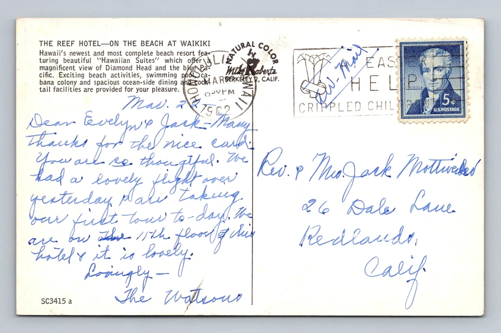 Hawaii HI Waikiki The Reef Hotel On The Beach Vintage Postcard Souvenir Postal