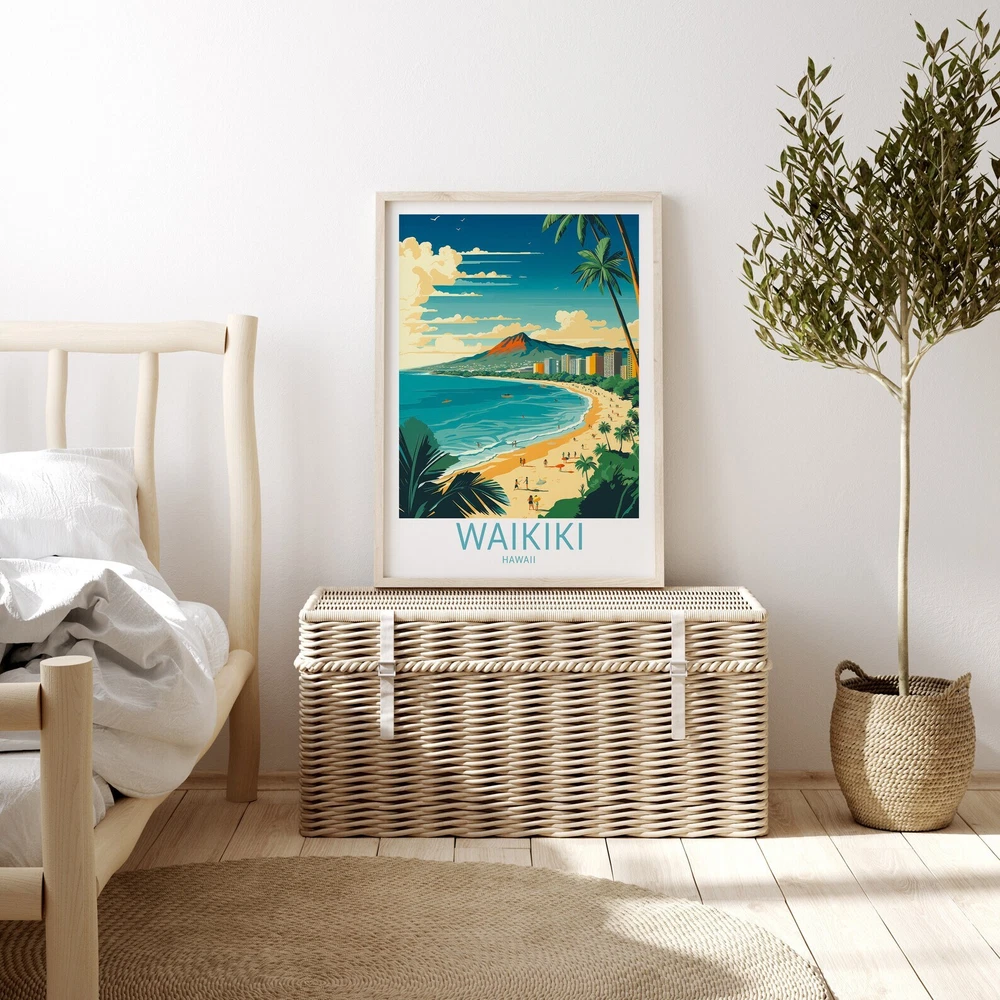 Hawaii Waikiki Travel Poster Waikiki Beach Travel Poster Print Hawaii Waikiki Travel Poster Wall Art Hawaii Coastal Travel Poster Material: Premium luster photo paper Print type: Inkjet printing One side printed + The finish provides the highest possible resolution and color saturation + Lasts up to 200 years in color and 400 years in black-and-white + Printed on high-quality resin-coated photo base paper medium + Posters can be hung with double-sided tape, tacks, or framed + Hand washing with a gentle cry cloth is recommended for extended durability I will hand select the best choice of paper for your chosen design to ensure top quality results for a beautiful, bright and luxurious print. All prints are sealed in cellophane slips for protection during transportation, and are shipped in a protective cardboard envelope.