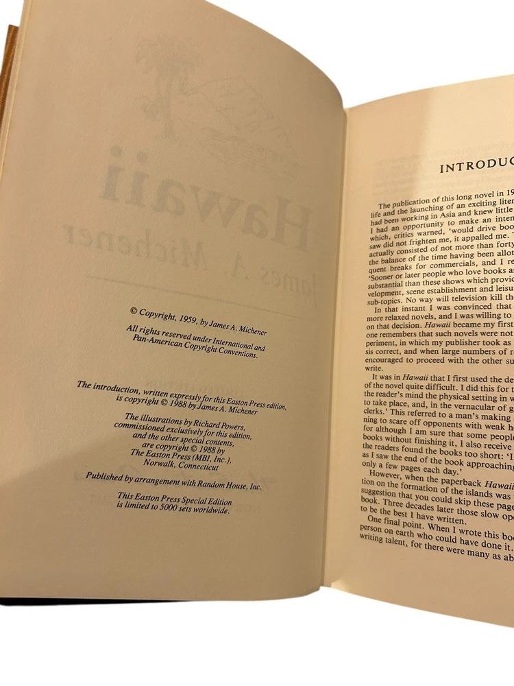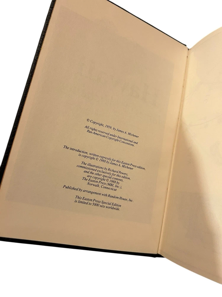 This Easton Press limited edition of *Hawaii* is a stunning collector's piece! The leather binding feels luxurious, and despite minor paint speckles, the books are in great vintage condition. The illustrations and gilded pages add to its charm—perfect for Michener fans or book collectors. Pictures accurately show its state, and the seller is responsive. A fantastic addition to any library!