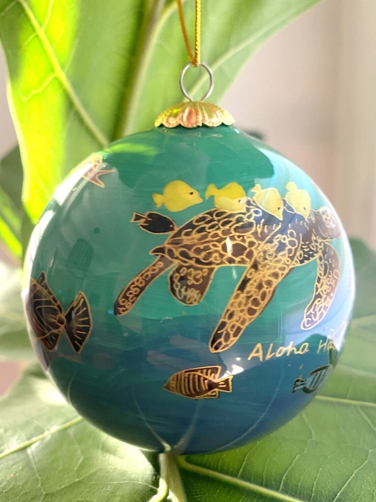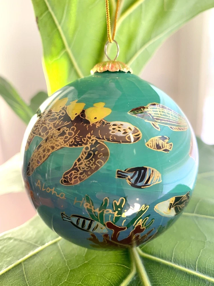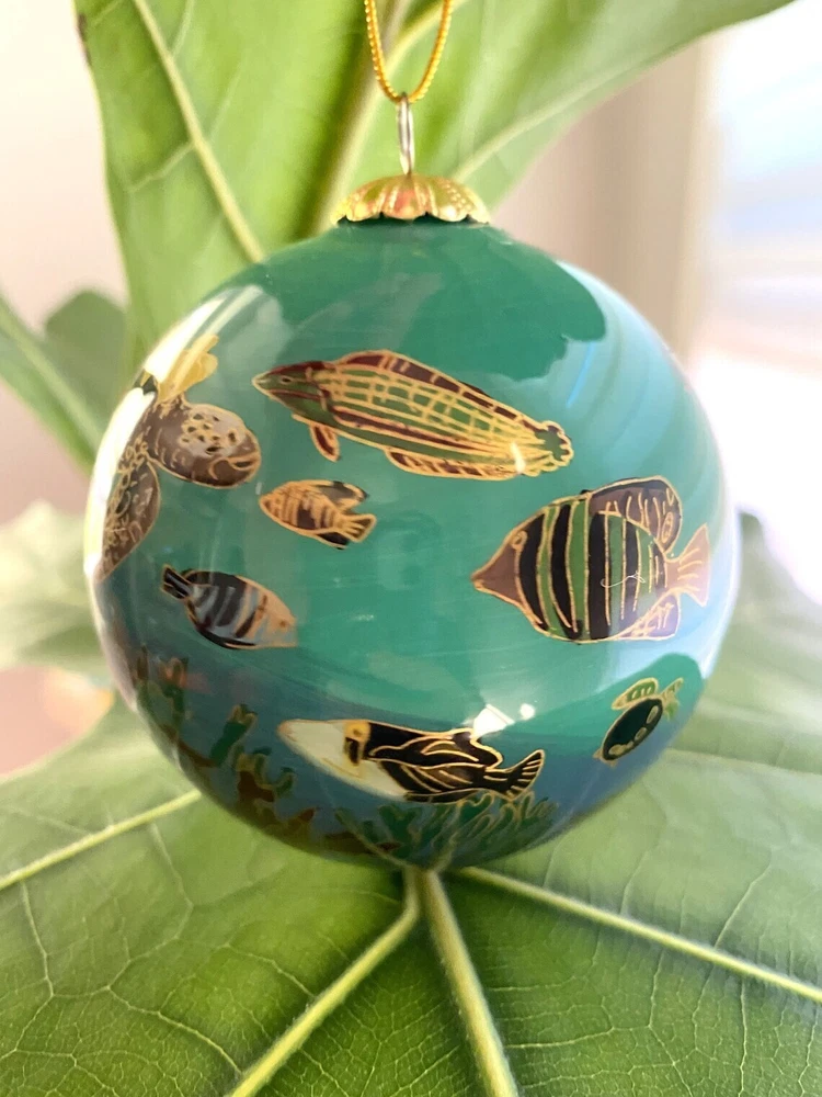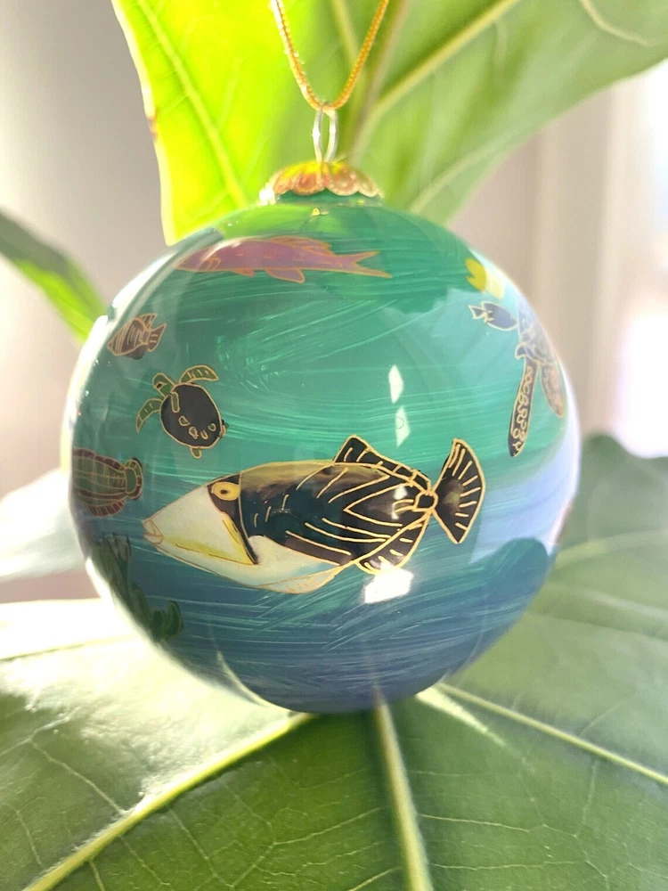 HAWAII STATE FISH / SEA LIFE HAND PAINTED ORNAMENT Our collectible glass Hawaiian State Fish / Sea Life ornament is painstakingly hand painted from the inside of the glass ball. The ornament is 3.5 inches in diameter and comes with a protective gift box that makes it an ideal Hawaii gift and keepsake for anyone who loves Hawaii. #36208-44