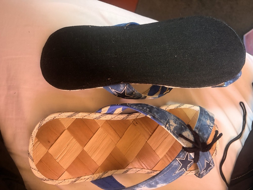 The Hawaiian House Slippers Lauhala are a pair of unisex slip-on house shoes perfect for casual occasions during the summer season. These blue slippers feature a Hawaiian theme and are made with lauhala as the upper material. With a standard shoe width and a slip-on closure, these slippers are comfortable and easy to wear for both men and women in US shoe size 9.5. Ideal for lounging at home or adding a touch of Hawaiian style to your casual outfit, these slippers are a must-have for anyone looking for comfortable and stylish footwear. *HAND MADE*
