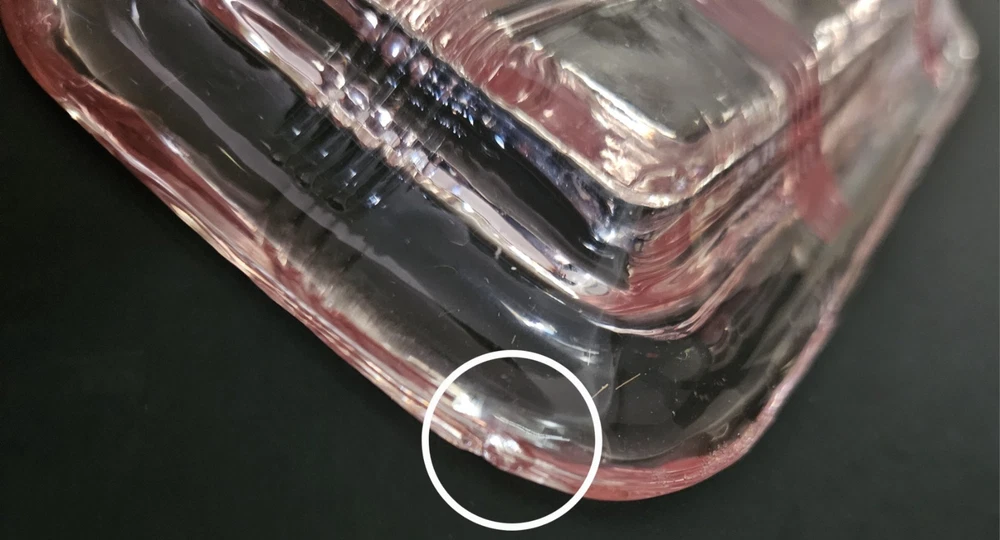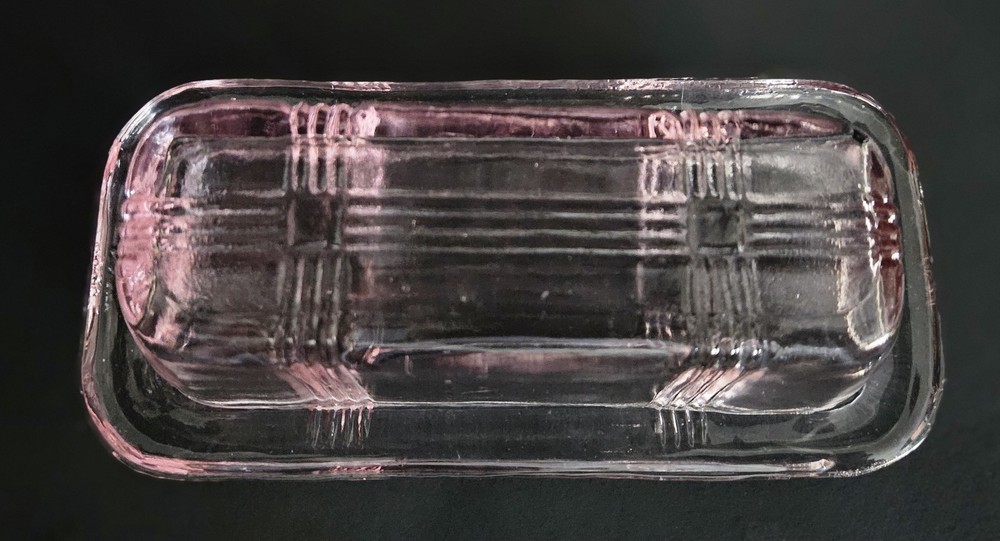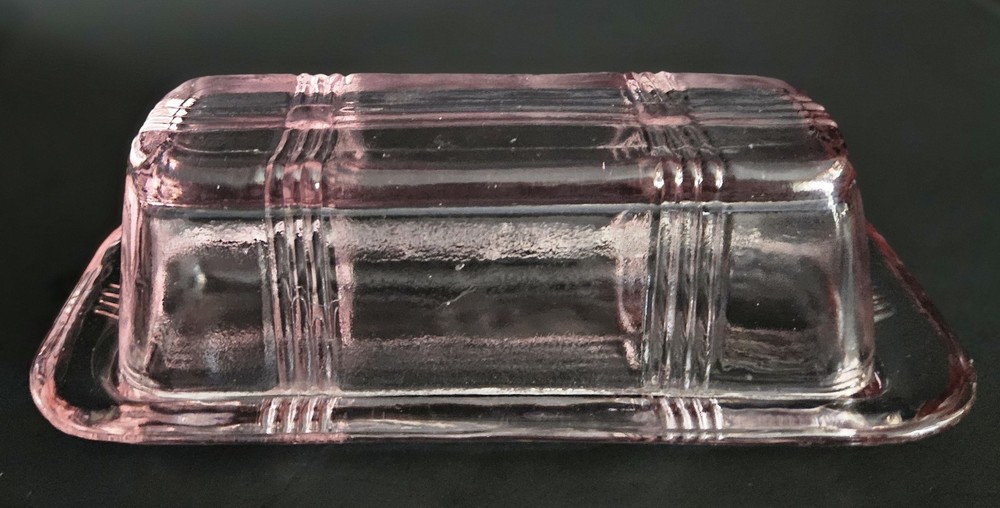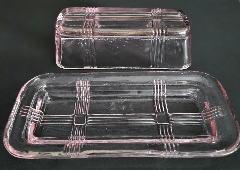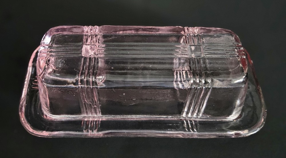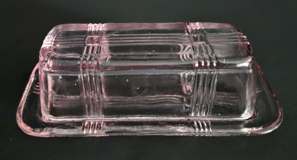 Vintage 1930's Hazel Atlas pink glass criss cross pattern butter dish. 6.75"W at base x 3 1/8"L. ***One small chip on the underside of the base*** Please see last photo. Otherwise in excellent condition.