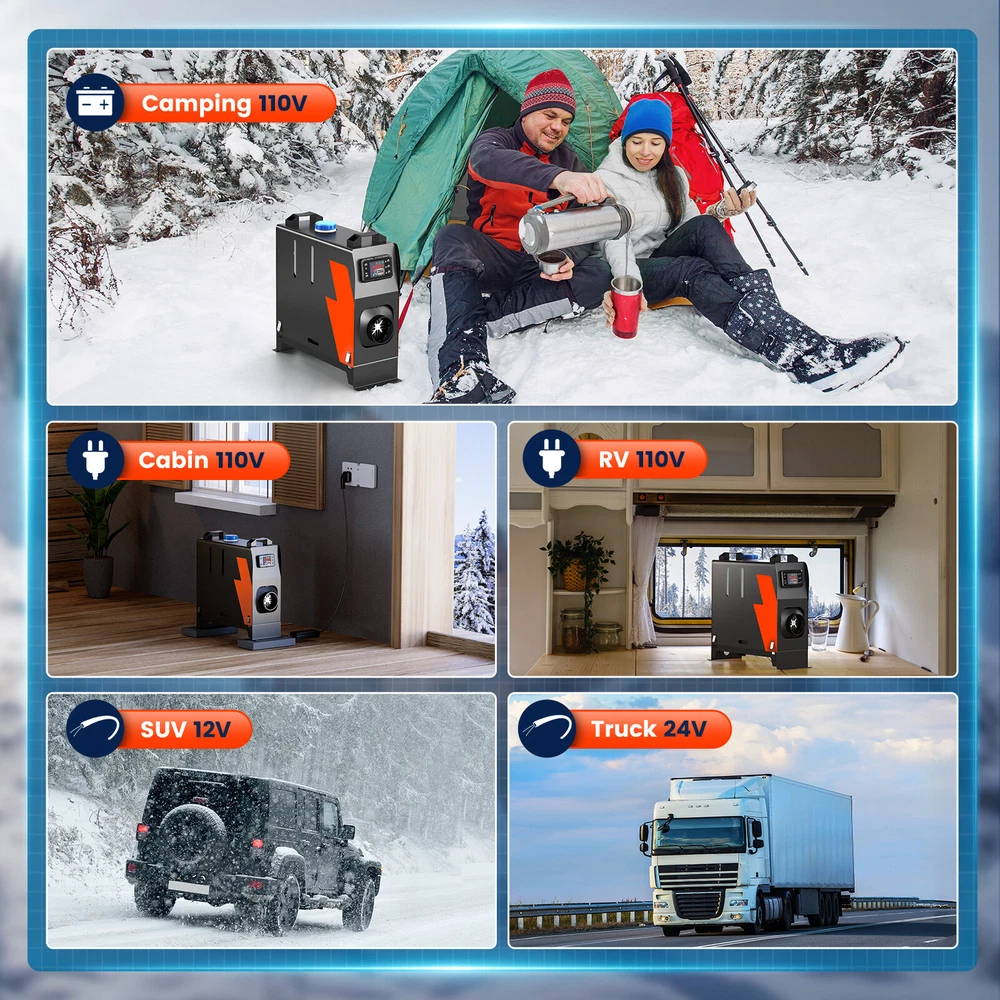 Similar Items Description Features: 1. Heating the car/indoor space: Heating the space by outputting warm air through the heat conversion in the combustion chamber of the heater; 2. Small size, space saving, comfortable to carry, portable 3. temperature (Celsius/Fahrenheit switching) adjustment setting; 4. Timing switch function: start and close according to the set time; 5. Smarter - Download the "airheaterble" App, available for iOS and Android devices, which enables user to remotely control the heater via Bluetooth 6. The built-in fuel tank has no odor, and the oil level scale is marked, making it easy to monitor the oil level and refuel in a timely manner; 7. No installation of intake pipe, fixed air filter at the bottom, easy to install 8. Install exhaust pipes on the side, without the need for bottom padding installation, and can effectively avoid the problem of exhaust pipe blockage 9. The metal buckle opening and closing design is sturdy and sealed, and the fuel tank is completely built-in to prevent odor. It is easy to open and convenient for maintenance and repair. Specifications: Brand Hcalory Type Air Diesel Heater Model Bluetooth Model Color Black and red Rated power 5KW - 8KW Rated voltage 12V - 24V Remote control effective distance 50-100 meters Radiator working temperature -40~+50°C Operating temperature of oil pump -40~+40°C Packaged included: 1 x Air Heater Host with LCD Display 1 x LCD Remote control 1 x Intake pipe 1 x Air Outlet pipe 1 x Exhaust pipe 1 x Filter 1x Silencer 4 x Connection holder 1 set Fixture Accessories set 1 x Instructions Note: 1. Please allow 0.5-1cm differences due to manual measurement. 2. Due to the light and screen difference, the item's color may be slightly different from the pictures. Features: 1. Heating the car/indoor space: Heating the space by outputting warm air through the heat conversion in the combustion chamber of the heater; 2. Small size, space saving, comfortable to carry, portable 3. temperature (Celsius/Fahrenheit switching) adjustment setting; 4. Timing switch function: start and close according to the set time; 5. Smarter - Download the "airheaterble" App, available for iOS and Android devices, which enables user to remotely control the heater via Bluetooth 6. The built-in fuel tank has no odor, and the oil level scale is marked, making it easy to monitor the oil level and refuel in a timely manner; 7. No installation of intake pipe, fixed air filter at the bottom, easy to install 8. Install exhaust pipes on the side, without the need for bottom padding installation, and can effectively avoid the problem of exhaust pipe blockage 9. The metal buckle opening and closing design is sturdy and sealed, and the fuel tank is completely built-in to prevent odor. It is easy to open and convenient for maintenance and repair. Specifications: Brand Hcalory Type Air Diesel Heater Model Bluetooth Model Color Black and red Rated power 5KW - 8KW Rated voltage 12V - 24V Remote control effective distance 50-100 meters Radiator working temperature -40~+50°C Operating temperature of oil pump -40~+40°C Packaged included: 1 x Air Heater Host with LCD Display 1 x LCD Remote control 1 x Intake pipe 1 x Air Outlet pipe 1 x Exhaust pipe 1 x Filter 1x Silencer 4 x Connection holder 1 set Fixture Accessories set 1 x Instructions Note: 1. Please allow 0.5-1cm differences due to manual measurement. 2. Due to the light and screen difference, the item's color may be slightly different from the pictures. #divSKUDetail2 Detail Image Payment 1.We accept Payoneer、PayPal、Mastercard、VISA、Google Pay 、American Express etc. 2.All major credit cards are accepted through secure payment processor. 3.Payment must be received within 7 business days of auction closing. 4.We ship to your eBay or payment address. Please make sure your eBay and payment address is correct before you pay. Shipping 1.We ship to your eBay or Paypal address. Please make sure your eBay and Paypal address is correct before you pay. 2.Items will be shipped within 1-3 business day when we received payment. 3.Delivery time depends on destination and other factors;