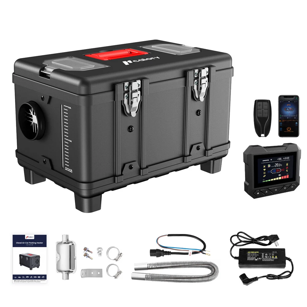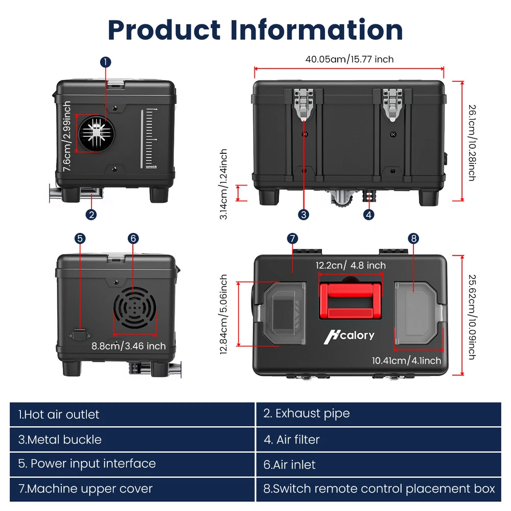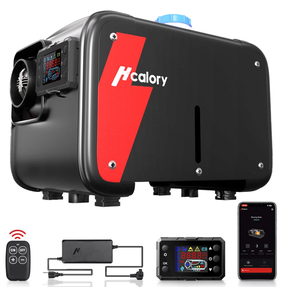 Similar Items Description Product advantages and characteristics: 1. Heating the car/indoor space: Heating the space by outputting warm air through the heat conversion in the combustion chamber of the heater; 2. DC12V-24V, AC 100-240V universal voltage automatic conversion, can be connected to two types of input power sources: AC-DC power adapter/positive and negative electrode battery; 3. temperature (Celsius/Fahrenheit switching) adjustment setting; 4. Timing switch function: start and close according to the set time; 5. Smarter - Download the "airheaterble" App, available for iOS and Android devices, which enables user to remotely control the heater via Bluetooth 6. Small size, space saving, comfortable to carry, portable 7. The built-in fuel tank has no odor, and the oil level scale is marked, making it easy to monitor the oil level and refuel in a timely manner; 8. No installation of intake pipe, fixed air filter at the bottom, easy to install 9. Install exhaust pipes on the side, without the need for bottom padding installation, and can effectively avoid the problem of exhaust pipe blockage 10. The metal buckle opening and closing design is sturdy and sealed, and the fuel tank is completely built-in to prevent odor. It is easy to open and convenient for maintenance and repair. A : Black tool box style Specification: Brand:Hcalory Built-in fuel tank: 5L Rated power: 5~8KW Rated voltage: 12V&110-240V Fuel consumption: 0.1 liters - 0.35 liters / hour Remote control effective distance: 50-100 meters Radiator working temperature: -40~+50°C Operating temperature of oil pump: -40~+40°C Packaged included: 1 x Air Diesel Heater 1 x Remote control 1 x AC power adapter 1 x Silencer 1 x Exhaust pipe 1 set Screw accessory kit 1 x User manual 1 x DC battery power cable B: Black and red horizontal style Specifications: Name Diesel air heater all in one Material metal + plastic Color Black& Red Voltage 12V/24V/110V Power 5KW-8KW Fuel Diesel Complete burn rate 100% Consumption 0.1 - 0.53 L/h Remote controlled effective distance 50-100m Working temperature -40 °c ~ 50 °c Package Included: 1 x Air Heater Host with LCD Display 1 x LCD Remote control 1 x Intake pipe 1 x Air Outlet pipe 1 x Exhaust pipe 1 x Filter 1x Silencer 1x L-type exhaust pipe bracket 4 x Connection holder 1 set Fixture Accessories set 1 x Instructions Note: 1. Please allow 0.5-1cm differences due to manual measurement. 2. Due to the light and screen difference, the item's color may be slightly different from the pictures. #divSKUDetail2 Detail Image Payment 1.We accept Payoneer、PayPal、Mastercard、VISA、Google Pay 、American Express etc. 2.All major credit cards are accepted through secure payment processor. 3.Payment must be received within 7 business days of auction closing. 4.We ship to your eBay or payment address. Please make sure your eBay and payment address is correct before you pay. Shipping 1.We ship to your eBay or Paypal address. Please make sure your eBay and Paypal address is correct before you pay. 2.Items will be shipped within 1-3 business day when we received payment. 3.Delivery time depends on destination and other factors;