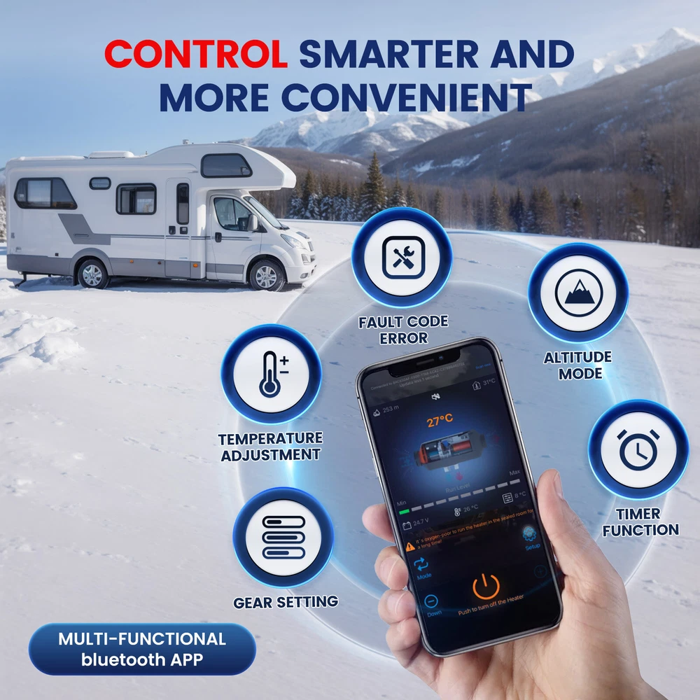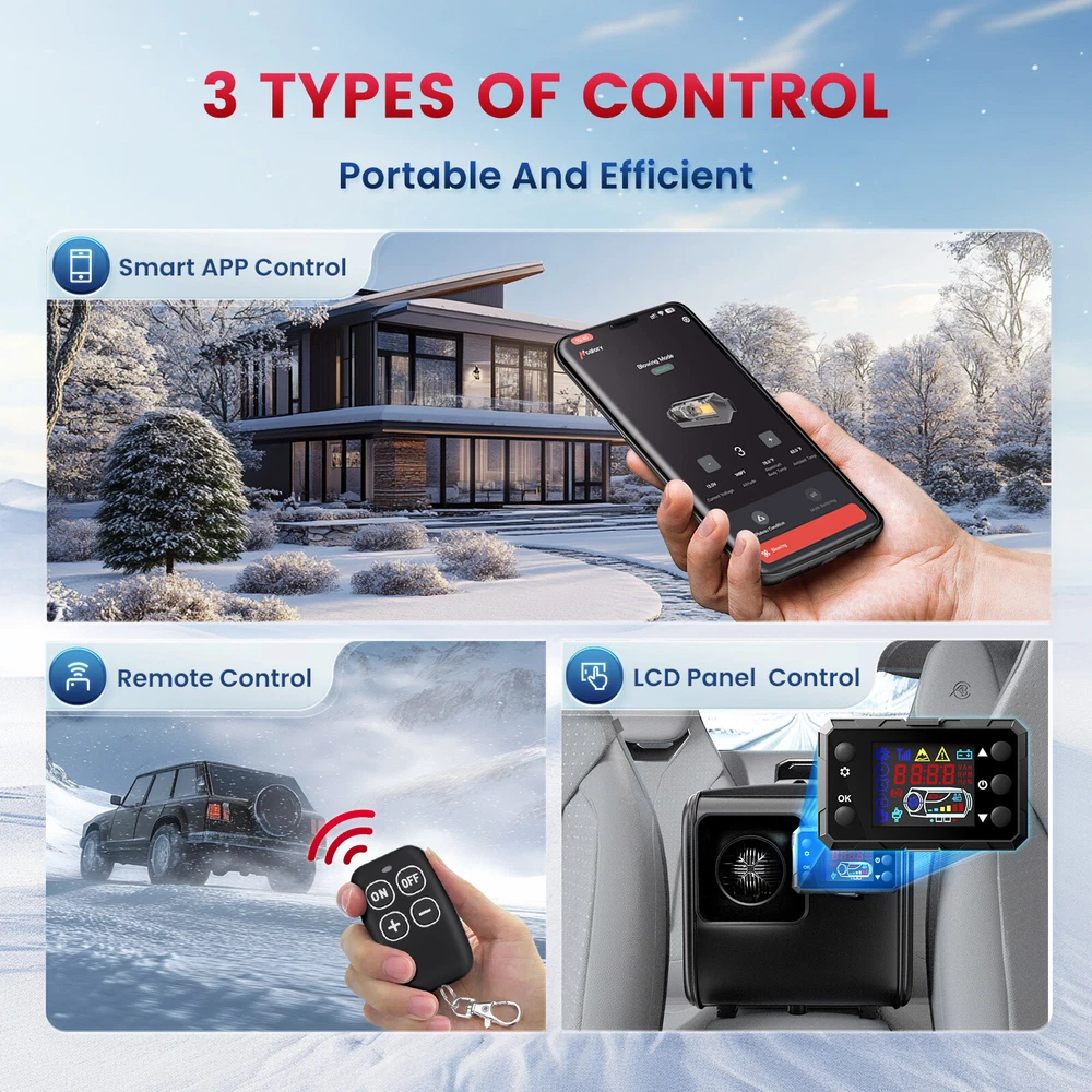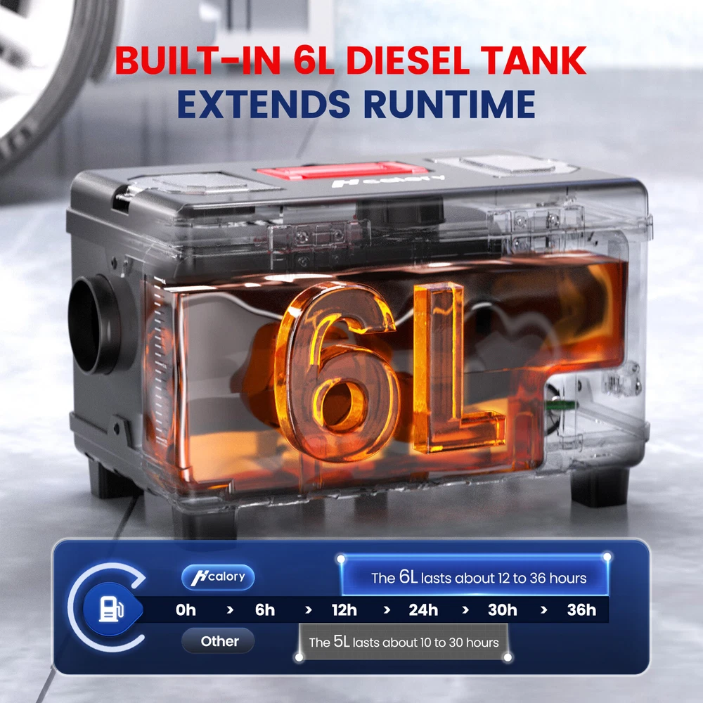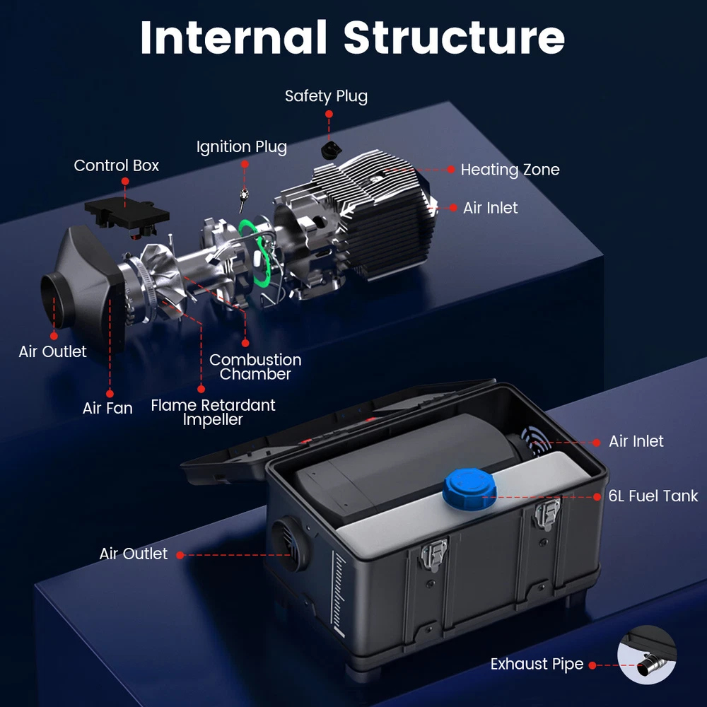 Similar Items Description Product advantages and characteristics: 1. Heating the car/indoor space: Heating the space by outputting warm air through the heat conversion in the combustion chamber of the heater; 2. DC12V-24V, AC 100-240V universal voltage automatic conversion, can be connected to two types of input power sources: AC-DC power adapter/positive and negative electrode battery; 3. temperature (Celsius/Fahrenheit switching) adjustment setting; 4. Timing switch function: start and close according to the set time; 5. Smarter - Download the "airheaterble" App, available for iOS and Android devices, which enables user to remotely control the heater via Bluetooth 6. Small size, space saving, comfortable to carry, portable 7. The built-in fuel tank has no odor, and the oil level scale is marked, making it easy to monitor the oil level and refuel in a timely manner; 8. No installation of intake pipe, fixed air filter at the bottom, easy to install 9. Install exhaust pipes on the side, without the need for bottom padding installation, and can effectively avoid the problem of exhaust pipe blockage 10. The metal buckle opening and closing design is sturdy and sealed, and the fuel tank is completely built-in to prevent odor. It is easy to open and convenient for maintenance and repair. A : Black tool box style Specification: Brand:Hcalory Built-in fuel tank: 5L Rated power: 5~8KW Rated voltage: 12V&110-240V Fuel consumption: 0.1 liters - 0.35 liters / hour Remote control effective distance: 50-100 meters Radiator working temperature: -40~+50°C Operating temperature of oil pump: -40~+40°C Packaged included: 1 x Air Diesel Heater 1 x Remote control 1 x AC power adapter 1 x Silencer 1 x Exhaust pipe 1 set Screw accessory kit 1 x User manual 1 x DC battery power cable B: Black and red horizontal style Specifications: Name Diesel air heater all in one Material metal + plastic Color Black& Red Voltage 12V/24V/110V Power 5KW-8KW Fuel Diesel Complete burn rate 100% Consumption 0.1 - 0.53 L/h Remote controlled effective distance 50-100m Working temperature -40 °c ~ 50 °c Package Included: 1 x Air Heater Host with LCD Display 1 x LCD Remote control 1 x Intake pipe 1 x Air Outlet pipe 1 x Exhaust pipe 1 x Filter 1x Silencer 1x L-type exhaust pipe bracket 4 x Connection holder 1 set Fixture Accessories set 1 x Instructions Note: 1. Please allow 0.5-1cm differences due to manual measurement. 2. Due to the light and screen difference, the item's color may be slightly different from the pictures. #divSKUDetail2 Detail Image Payment 1.We accept Payoneer、PayPal、Mastercard、VISA、Google Pay 、American Express etc. 2.All major credit cards are accepted through secure payment processor. 3.Payment must be received within 7 business days of auction closing. 4.We ship to your eBay or payment address. Please make sure your eBay and payment address is correct before you pay. Shipping 1.We ship to your eBay or Paypal address. Please make sure your eBay and Paypal address is correct before you pay. 2.Items will be shipped within 1-3 business day when we received payment. 3.Delivery time depends on destination and other factors;