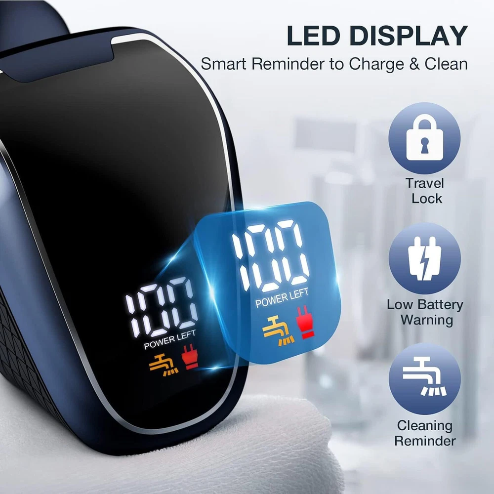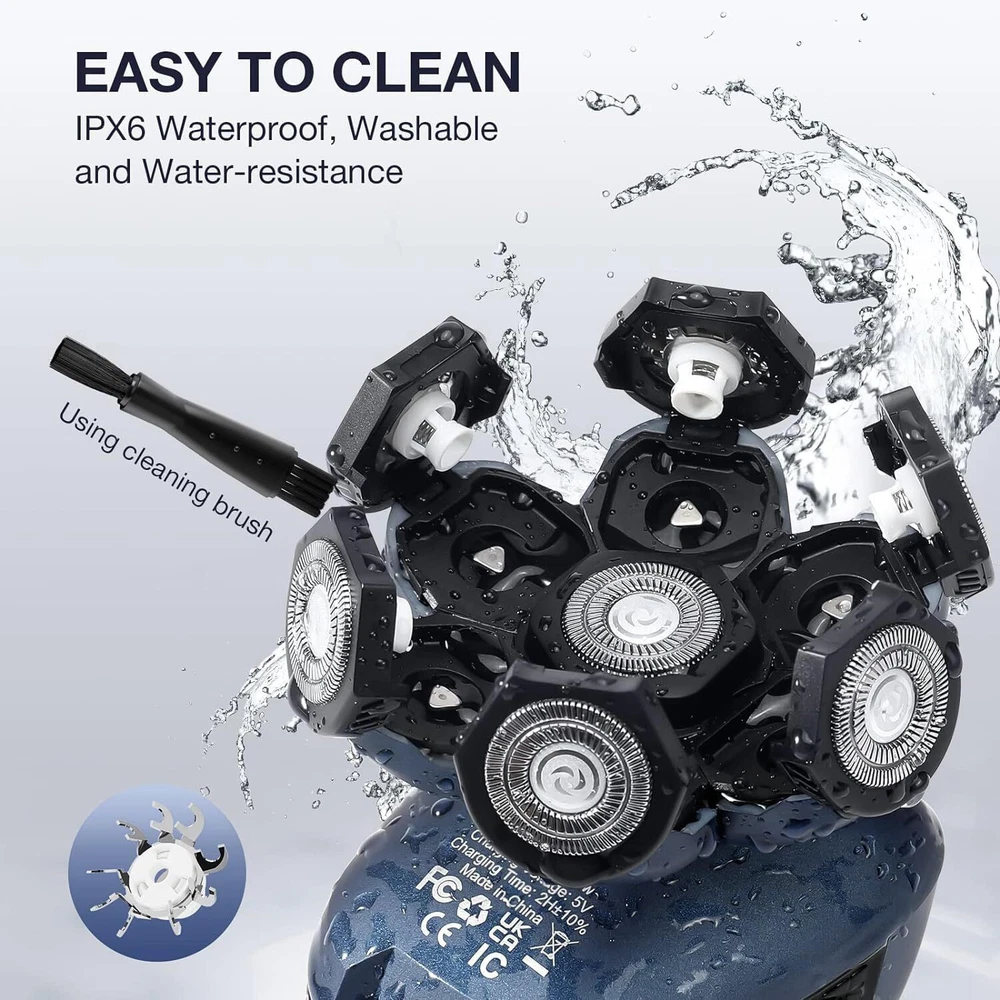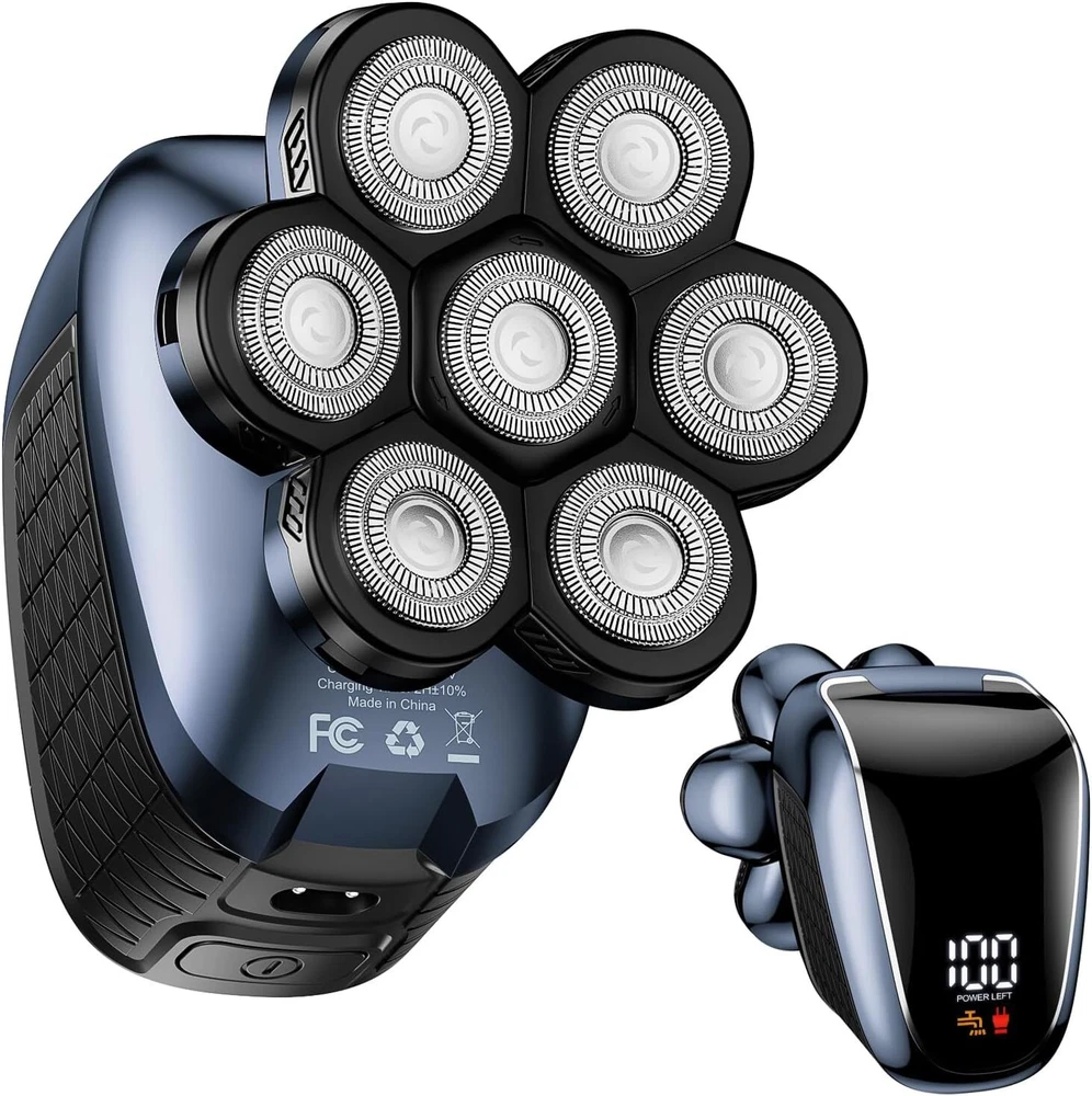 Recommended Uses For Product Beard Special Feature Anti-Scratch Power Source Battery Powered Included Components Attachment About this item 7D Floating Shaving Head: The upgraded version of the 7D floating shaving system is ergonomically designed.The design of 7 cutter heads increases the shaving area and saves shaving time. Our shaver is designed with a non-slip handle for easy gripping, a great choice for your shaved heads. Please regularly clean the hair in the shaver head Double Blade and Double Protective Net: Men’s bald head shaver uses double-layer durable blade to accurately capture long and short hairs, which are precise, sharp and safe. The double net provides protection and reduces irritation. The intelligent induction system effectively prevents hair pinching and brings you a comfortable and smooth shaving experience 5 in 1 Professional Grooming Kit: Wyklaus men's electric shaver includes one head shaver, hair trimmer, nose hair trimmer, cleansing brush, sideburn trimmer, hair trimmer combs(3 5 7mm) and USB cable. Different heads can meet any of your shaving, beauty and cleaning needs, suitable for home and travel, and convenient for your life. Please use the proper charging cord to charge the head shaver and charge it in time LED Intelligent Display: The bald head shaver for men with LED display can accurately show the percentage of the battery power. Low battery reminder, water washing reminder more intelligent. Long press the switch button for 3 seconds to trigger the travel lock to avoid additional power consumption. This electric shaver uses 600mAh large capacity battery, 2 hours of fast charging can provide 60 minutes of working time. Please charge it in time for regular use Waterproof and Wet and Dry: If you want a cleaner shaving experience, we recommend that you use shaving foam to soften the stubble before using our razor. The whole body of the shavers for men is IPX6 waterproof, offered you a comfortable dry shave or a refreshing wet shave with shaving foam. You can use the small brush provided for cleaning, which is easy to operate and easy to clean. This versatile shaving kit is a great gift for your husband or boyfriend