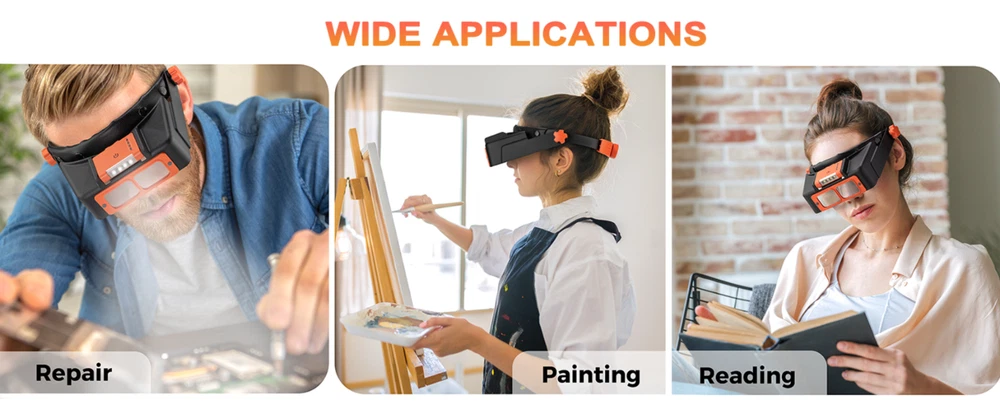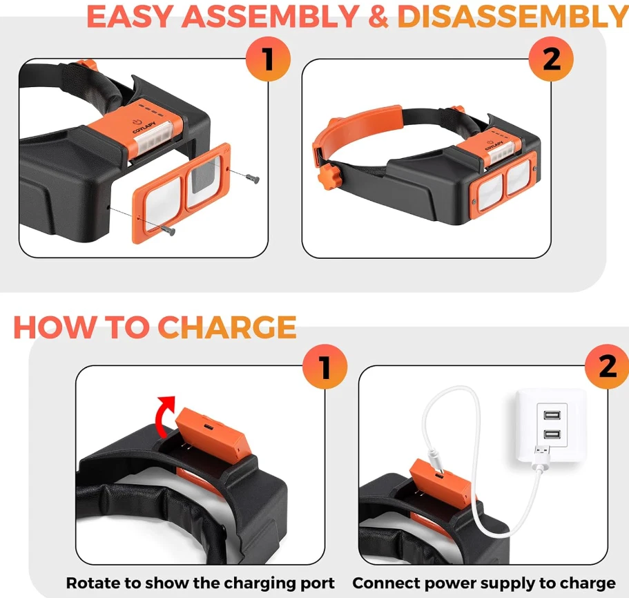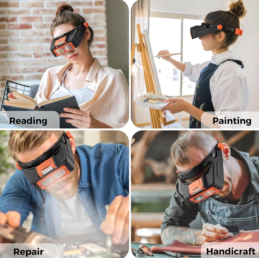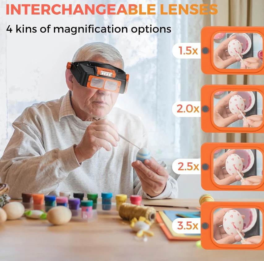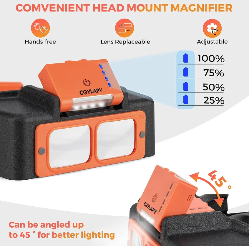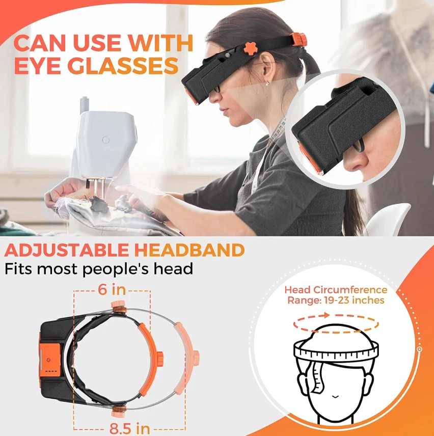 Free eBay listing template designed by dewiso.com Headband Magnifier with Light, Rechargeable Magnifying Glasses for Close Work, 1.5X - 3.5X Magnifying Headset with 4 Lenses, Jewelers Magnifying Glass Loupe Visor for Reading,Crafts, Hobby 【Rechargeable & Adjustable Led Lights】 This newest magnifying glass headband magnifier has 4 bright LED lights with 2 illumination modes for enhanced visibility in any dark or dim environment. More precise lighting area can be obtained by adjusting the light angle. The magnifying headset light can be charged via Type-C cable, and it can work continuously for 4-6 hours after 1.5 hours of full charge. With this hands free magnifying glass, productivity can be improved. 【Replaceable High-Definition Lens】 As a useful gift magnifying glass for elderly or any person dedicated to close work, this head magnifier comes with 4 replaceable acrylic crystal clear lenses of magnification 1.5x, 2x, 2.5x, 3.5x, which can meet various needs. Perfect optivisor headband magnifier for reading, painting, repairing, sewing, soldering, ect. All lenses can be easily assembled and disassembled. 【Fits with Eyeglasses】The magnifying glasses with light for close work is lightweight and nicely padded, you can wear it on top of your prescription eyeglasses. Also, you can adjust the height of the magnifier headset with light by loosening the knobs on both sides. Usually, you can use the 1.5x magnification lens in combination with your regular eyeglasses to zoom in extra and see the smallest prints on medicine bottles clearly and without eye strain. Perfect soldering magnifying glass. 【Widely Used】Our magnifying headset can be used as a hobby tool magnifier, cross stitch magnifying glass, lash magnifying glasses for lash extensions, soldering magnifying glass, magnifying glass for seniors for reading, loupe magnifer jewelers tools. It is also suitable for other hobbies like needlework, miniature painting, beading, carving, manicure, coins, crafts. This head mount magnifier is really a great helper for micro hobby projects. 【Comfortable To Wear】The headband magnifier releases your hands, making it easy to finish close work. Our magnification glasses with light can fit over prescription glasses. The headband is padded with soft sponge with leather cover, which makes it comfortable and suitable for long-time wearing. If you are a jewelry maker, this magnifying gasses can be a practical jewelers magnifying glass. The optivisor headband magnifier is also friendly for the elderly and kids. NOTE: This magnifier with light can fit normal head circumference of 19-23 inches.You can adjust the size by loosing / tightening the rear wheel (pull to adjust, press to lock). For larger head size, please serch COYLAPY 1x - 14x headband magnifier (Black or White), which can fit head circumference of 20 - 25.5 inches. Features and further details Lights Up Working Area 4 led lights ensure uniform illumination in a large area. The light with 2 brightness, and angle can be adjusted to make it more comfortable. More Comfortable The headband is padded with soft sponge with leather cover, which makes it comfortable and suitable for long-time wearing. Convenient To Recharge The Led light battery pack of the magnifying glasses is detachable and convenient to charge via type C cable. Easy To Assemble The lens can be easily fixed with 2 small plastic nails, and it is also easy to replace different lenses to meet your different needs. Contact us We can be contacted at any time through eBay messages if you have any questions, comments or product requests. We will respond to you within 24 hours and do our best to help you out! We encourage our customers to contact us with any questions or concerns! We'd like to be sure you are completely satisfied with your purchase.