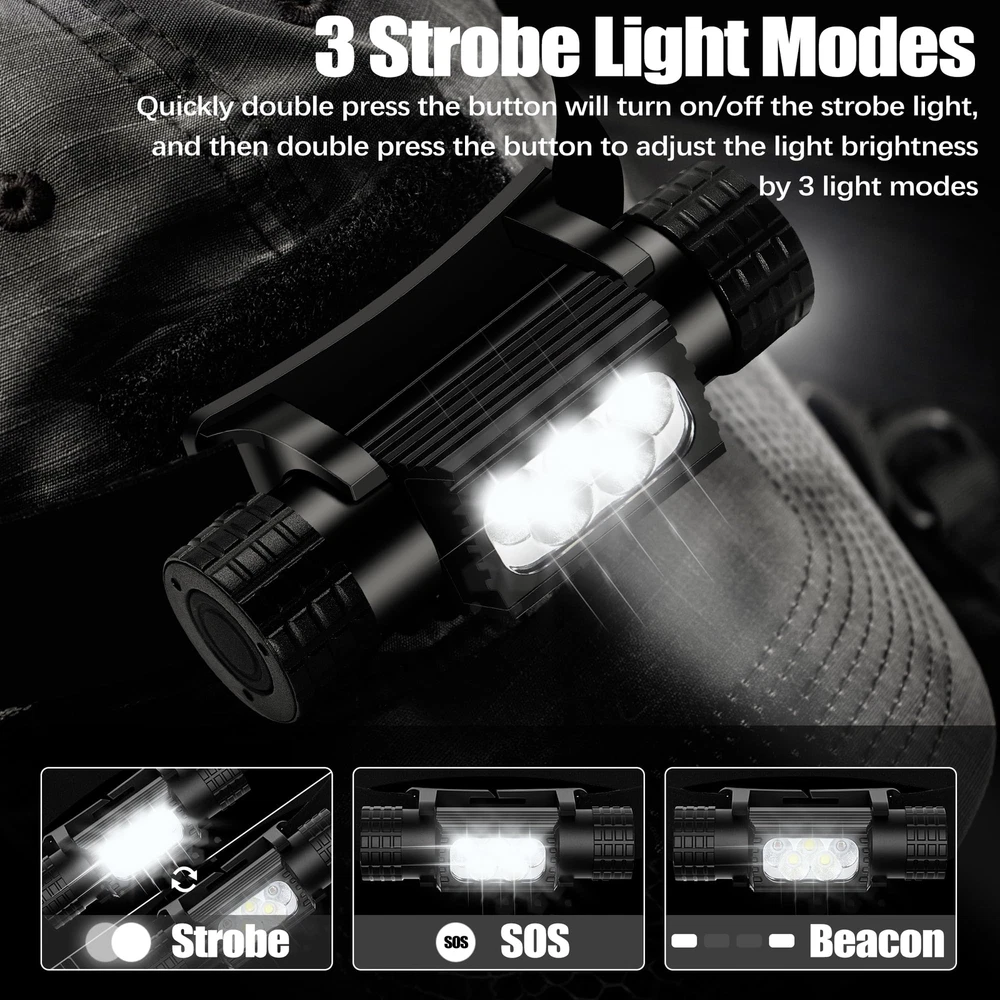 9 lighting modes: This rechargeable headlamp features a high-intensity LED chip that can provide a maximum output of 2000 high lumens and includes 9 lighting modes, including 5 different brightness levels, moonlight mode, and 3 emergency lighting modes - strobe, SOS, and beacon - to meet your different needs. Switching between modes is easy with the press of a button. The headlamp can be adjusted up and down by 180 degrees, with a wide 120-degree illumination range to light your way anytime. Rechargeable LED headlamp: Built-in with a 2600mAh high-capacity rechargeable battery, this headlamp has a long lifespan and supports multiple charging methods, including a hidden TYPE-C charging port that can be charged using a mini USB charging cable (included in the package), making it compatible with laptops, power banks, car chargers, and wall sockets. The red light will turn on while charging and will turn green when fully charged. It can last up to 8 hours after a full charge. Easy to use: With a simple on/off switch, you can easily turn the headlamp on and off without having to go through all the lighting modes. A long press of the switch for 3 seconds can adjust the headlamp to one of five different brightness levels. Quickly pressing the switch twice can activate the emergency lighting modes, and pressing it twice continuously can adjust it to different emergency lighting modes. When the headlamp is off, a long press of the switch can activate the moonlight mode. Versatile application: The adjustable and detachable design of this headlamp makes it perfect for various activities, such as running, camping, repairing, fishing, biking, hiking, and dog walking. Besides its primary use as a headlamp, it can also be used as a handheld flashlight or magnetically attached to metal surfaces for emergency or repair lighting. It can also be used as a safety helmet lamp in industrial settings, making it an essential item for every household. High-quality headlamp: The headlamp body is made of high-strength aluminum material, which is lightweight yet durable. It has undergone four layers of polishing and is combined with a wear-resistant paint layer and a unique hidden charging design. This headlamp is impact-resistant, waterproof, dustproof, and has an IP66 waterproof rating with a built-in circuit protection design that ensures a longer lifespan, providing you with convenience and safety in your daily life.