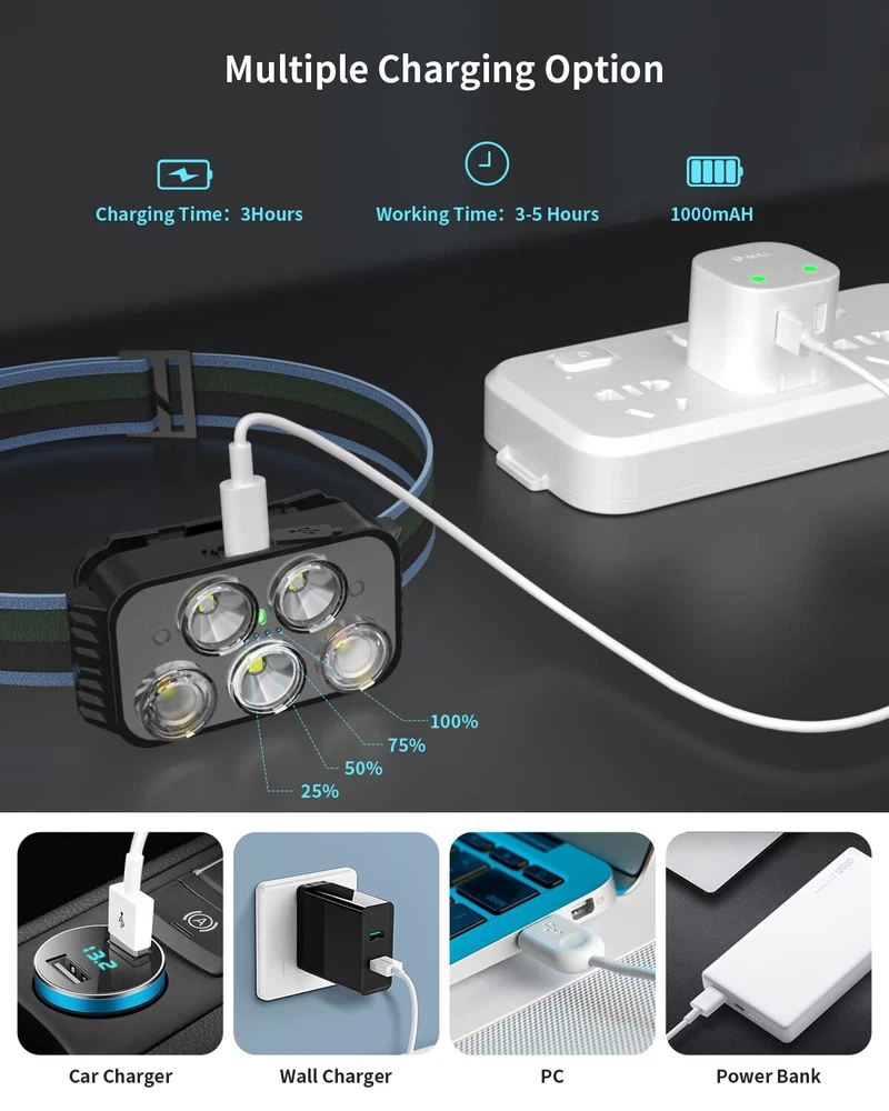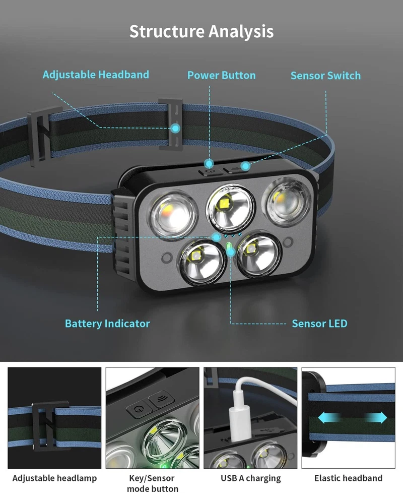 Note: No direct shining on eyes of people or animal, which may cause instant blindness Super Bright & Incredible Value - Headlamp flashlight uses a best-in-class LED chip with a 400-lumen beam wide variety of white & red light modes that can instantly illuminate the surroundings in a dark environment. it can meet all your outdoor lighting needs. Rechargeable Headlamp - Built in 1000mAH large batteries with Type-A USB connectivity. Charge fully only 3 hours. The battery indicator will help you master battery usage. The USB cable is with any USB charger interface. Such as wall charger, power bank, PC etc.( Last for 3-5 hours after full charge.) 6 modes and motion sensor - rechargeable headlamp can switch between Strong White Light, Weak White Light, Strong COB Sidelight, Weak COB Sidelight, Red COB Sidelight, SOS Red Sidelight, which is suitable for running, camping, cycling, fishing and climbing. These modes can be switched with a wave of the hand in front because there are motion sensors built in. Ultra-light and Adjustable - The hand-free headlamp is only weight 2.9 OZ, comfortable and lightweight. The lamp head can be rotated 60° and tightly fixed to avoid shaking and sliding when running. The head flashlight uses comfortable elastic headband, which can easily adjust the length to perfectly fit your head size, perfect for adults and . Intimate after-sales and Risk-free purchase: We will provide a 1-year quality and a 60-day full .If you have any questions, please let us know and our team will reply you within 24 hours.