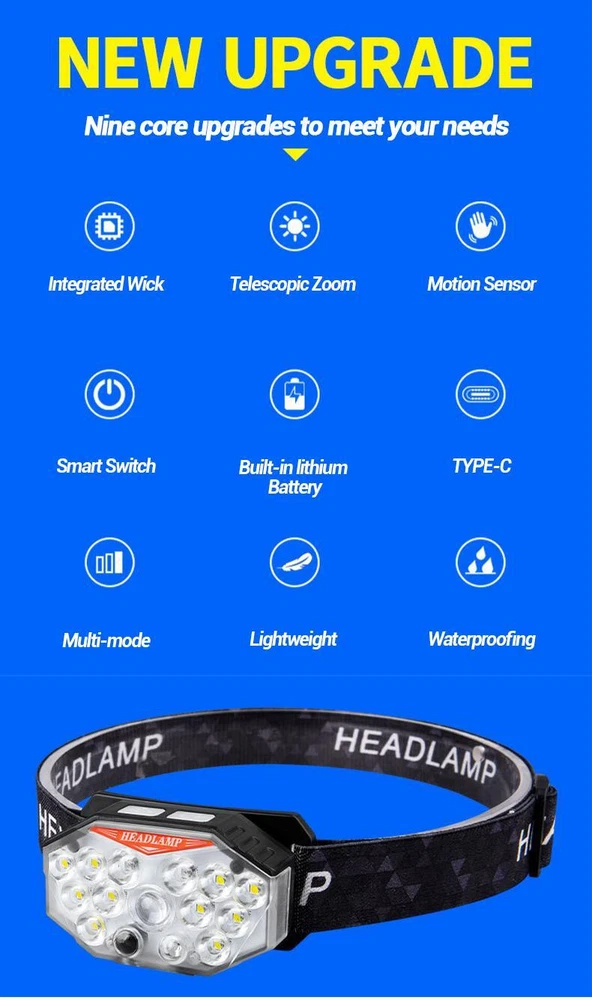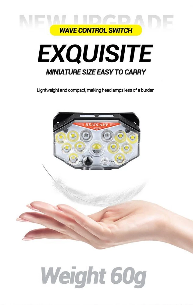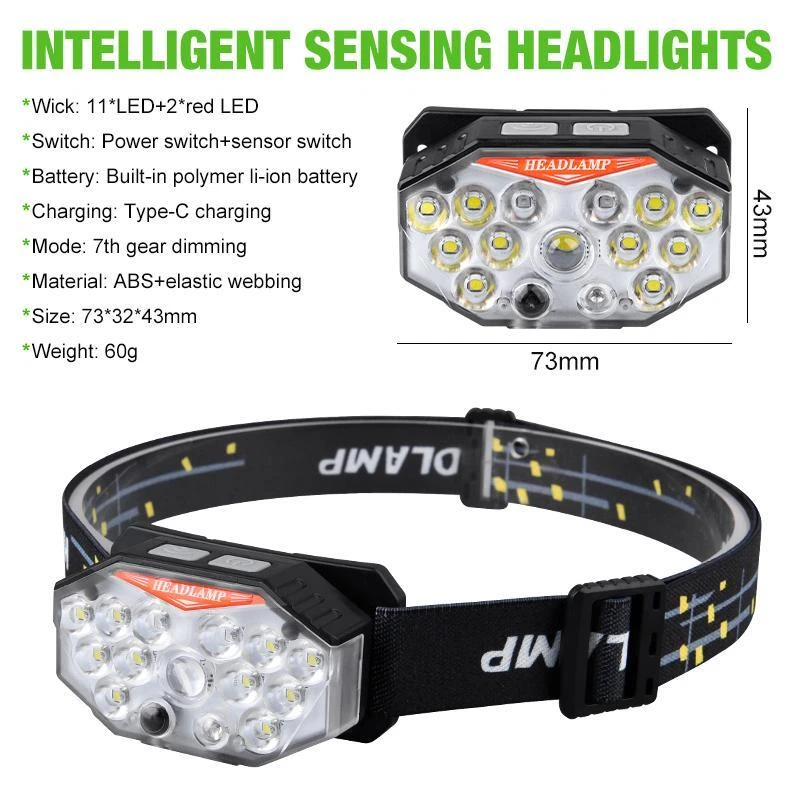 Free and fast shipping , shipping take up 1-7 Business Days 30 Day Return Accepted EASY PAYMENT via PayPal, Credit Card, PayPal Credit, Google Pay... Headlamp USB Type-c Rechargeable LED Battery Waterproof Plastic Multicolor Specification Product Name: Strong Light Sensing Headlight Product light source: 11 * LED+2 * red LED Using battery: built-in polymer battery(800 mah) Endurance: 2-8 hours Switch position: 7-speed lighting mode Charging method: TYPE-C intelligent fast charging Product weight: 60g (bare lamp/battery included) Waterproof performance: Lifestyle waterproof Lightly touch the switch for 4th gear dimming; Single lamp strong light (inductive) Single light weak light (inductive) 10 strong lights (inductive) 11 strong lights (inductive) Long press to switch light source (3rd gear dimming) Long bright red light Alternating flicker Sos INTELLIGENT SENSOR YOU CAN CONTROL THE HEADLAMPONIOFF BY WAVING 10-15CMSENSING DISTANCEALL GEARS CAN BE SENSED REVIEWS The product came very well packaged. I'm very happy. thank you for everything. Seller strongly recommended. This is great! I definitely recommend! Product looks amazing Delivery was fast. Excellent seller, great communication. I advise everyone to buy it!
