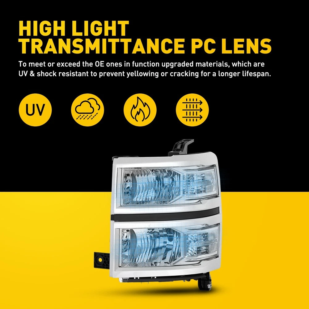 Fit for: 2014-2015 Chevy Silverado 1500 models only (Fit 2014 New Body style models only; Does NOT fit HD models) Specifications: OE number: 20933724, 20933725, 20933722, 20933723, 23172782, 23172783 GM2502389, GM2503389, GM2502395, GM2503395, GM2502410 Material: ABS+PC (ABS Plastic Housing/Polycarbonate lens) Appearance color: 1.Housing Color: Chrome 2.Lens Color:Clear 3.Reflector Color:White Note: Projector ×(Not include) DRL ×( Not Include) Bulb × (Not include) Features: Headlight For 2014-15 Chevy Silverado 1500 Chrome Housing Headlamp Left Right Fit for: 2014-2015 Chevy Silverado 1500 models only (Fit 2014 New Body style models only; Does NOT fit HD models) Specifications: OE number: 20933724, 20933725, 20933722, 20933723, 23172782, 23172783 GM2502389, GM2503389, GM2502395, GM2503395, GM2502410 Material: ABS+PC (ABS Plastic Housing/Polycarbonate lens) Appearance color: 1.Housing Color: Chrome 2.Lens Color:Clear 3.Reflector Color:White Note: Projector ×(Not include) DRL ×( Not Include) Bulb × (Not include) Features: *Easy to install: Direct replacement, drilling and cutting are not required. *Superior quality: Made of ABS and PC materials with toughness and heat resistance functions to ensure its long service life and durability. *Angle adjustment: Equipped with a headlamp Angle adjustment knob, you can adjust the best Angle of view through the knob. *Suggestion: 1.Please confirm the OE number before purchasing!!! 2.Professional installation is required!!! Package Included: Headlights *2 (Left+Right) ABOUT US Headlight For 2014-15 Chevy Silverado 1500 Chrome Housing Headlamp Left Right Fit for: 2014-2015 Chevy Silverado 1500 models only (Fit 2014 New Body style models only; Does NOT fit HD models) Specifications: OE number: 20933724, 20933725, 20933722, 20933723, 23172782, 23172783 GM2502389, GM2503389, GM2502395, GM2503395, GM2502410 Material: ABS+PC (ABS Plastic Housing/Polycarbonate lens) Appearance color: 1.Housing Color: Chrome 2.Lens Color:Clear 3.Reflector Color:White Note: Projector ×(Not include) DRL ×( Not Include) Bulb × (Not include) Features: *Easy to install: Direct replacement, drilling and cutting are not required. *Superior quality: Made of ABS and PC materials with toughness and heat resistance functions to ensure its long service life and durability. *Angle adjustment: Equipped with a headlamp Angle adjustment knob, you can adjust the best Angle of view through the knob. *Suggestion: 1.Please confirm the OE number before purchasing!!! 2.Professional installation is required!!! Package Included: Headlights *2 (Left+Right) FAQ Shipping Returns Contact Us Payment Why swith to LED? LEDs not only give your vehicle a clean, modern look but, with proper use, will outlast any halogen bulb and HID bulb! Low energy draw, high lumen output, and instant on/off LED technology out shines stock bulbs in every way. Which bulbs are used in my vehicle? Check Sylvania automotive lamp replacemnt guide , you can select the year, make, and model of your vehicle, then select the application you want to replace or upgrade from stock. What does CAN Bus mean? CAN Bus means Controller Area Network Bus. This system monitors your vehicle and reports operating conditions. CAN Bus systems are commonly found in European vehicles such as BMW, Audi, Mercedes, Volkswagen, Porsche, and in many American vehicles. While most late model American vehicles have CAN Bus systems, it is always good to check with your vehicle dealer to see which system your vehicle has before purchasing electrical products. When do you need Warning Canceller? Some vehicles with cmplex internal computers(such as Audi,BMW,Jaguar,Mercedes,etc.) might report on-dash errors or flickering on the headlights. The warning canceller fixes the dashboard warning and flickering effect. Bulb Out Dashboard Error: On some vehicles, the dashboard will report as if you have a headlight bulb missing or burnt. It does not affect the headlights functioning, but the light on-dash will be on. The warning canceller fixes the issue. Flickering Issue: This happens when your vehicle does not recognize the new headlights installed. When turning the headlights on, the vehicle's computer does not understand the signal back from the headlights hence thinking they are still off. This triggers the headlight flickering effect. The warning canceller solves this issue. LED Advantages: Very low and efficient energy consumption than halogen bulbs & HID Bulbs Compared with HID bulbs, LED bulbs Light up instantly, no warm up period Low voltage protection, high precision constant current driver chip Longer lifespan than HID and halogen bulbs Light can be controlled easily in color and intensity Easy to install a LED headlight conversion kit (1) We will ship your item(s) within 24 hours. (2) We ship this item to US only via USPS first class mail. It usually takes 3-6 working days to deliver. How Long Will It Take to Receive My Refund? If you have emailed us for a refund ,once we have approved it ,after 60 days your money will be refunded. The estimated time for the refund to appear in your account is based on the payment method you use. Paypal is the only supported in NIGHTEYE Store. Please notify us within 30 days after you've received your purchased item. All return requests must be submitted through your eBay account. NOTE: Buyers pay for the return shipping fee. Items to be returned must be in resalable condition, for example: You do not satisfy the item quality Item do not fit your vehicle perfect Item can not reach your expectation The item arrived be broken You do not receive the item Parcel Lost Receive the wrong item If you have problems with the above issue, please Contact Us immediately ! [Our office hours are MONDAY - Saturday 9:00PM - 6:00PM PST, but we will response you once we get your message .There will be some delay on respons if you send message or E-Mail on Sundy.] (1).Negative feedback will not help resolve any problems you have, please 
