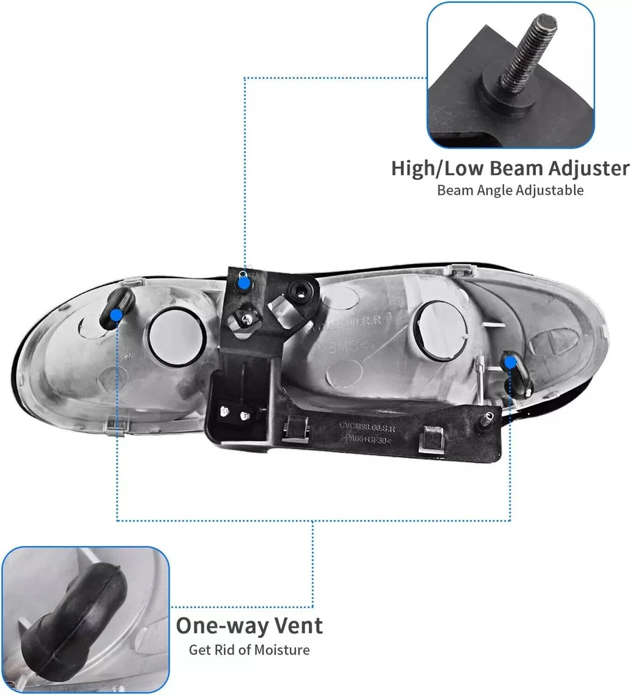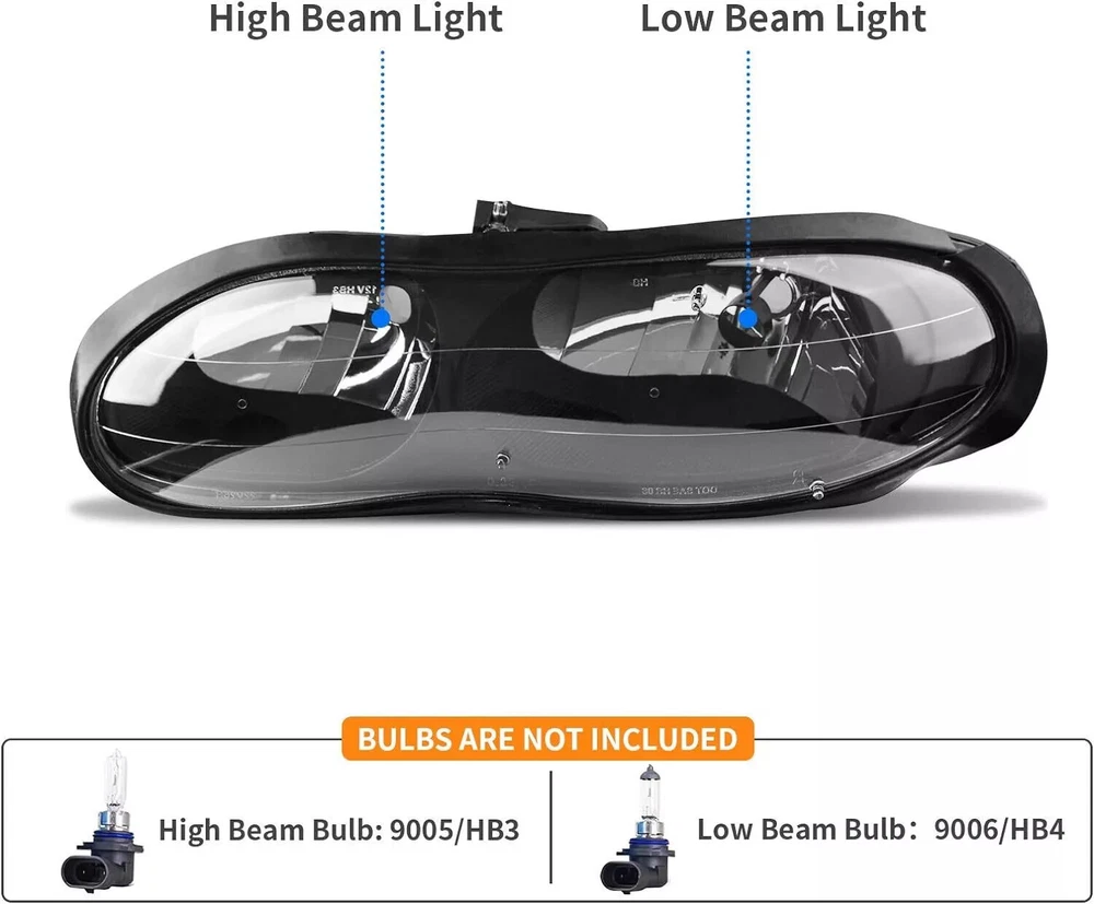 Feature High quality generic branded lights that are identical to OEM lights. Safety and Durable. DOT/SAT approved for street legal. Safety & Fashion. High grade ABS plastic. For toughness, impact resistance, and heat resistance. Condition: 100% Brand New and High Quality Material: ABS Plastic Housing / Polycarbonate Lens Color: Black Housing + Clear Lens High Beam Bulb Type: HB3 9005 (bulb NOT included) Low Beam Bulb Type: HB4 9006 (bulb NOT included) Fit for: for 1998-2002 Chevy Camaro Packing list: 1 Pair of Headlights (Driver & Passenger Side)