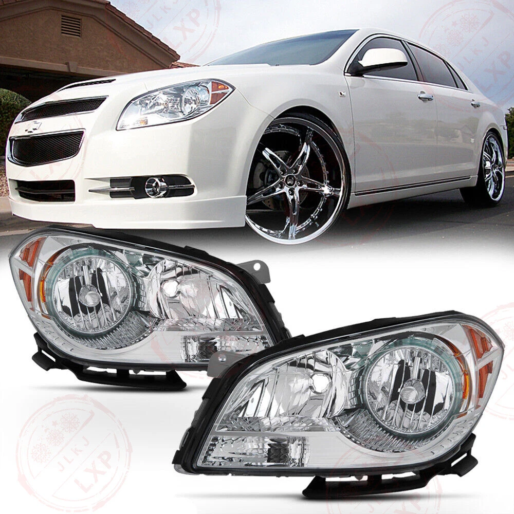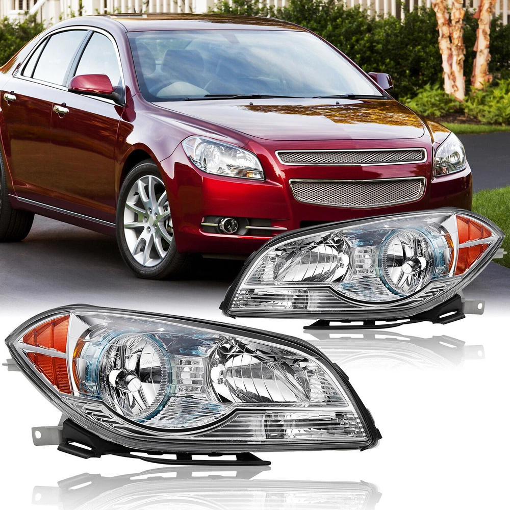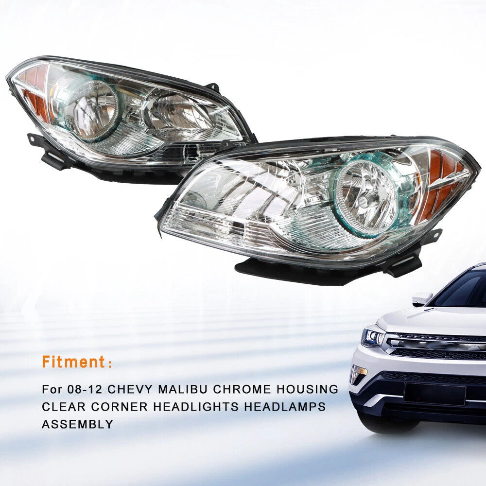 Material:ABS Plastic Color:clear Mounting Position:Driver & Passenger Side Package:Driver & Passenger Side Headlgihts Housing Color:Chrome Lighting Technology:Halogen OEM Part Number: GM2502307 GM2503307 25984637 25872861 Fitment For 2008-2012 Chevy Malibu Chrome Housing Clear Corner Headlights Headlamps Assembly