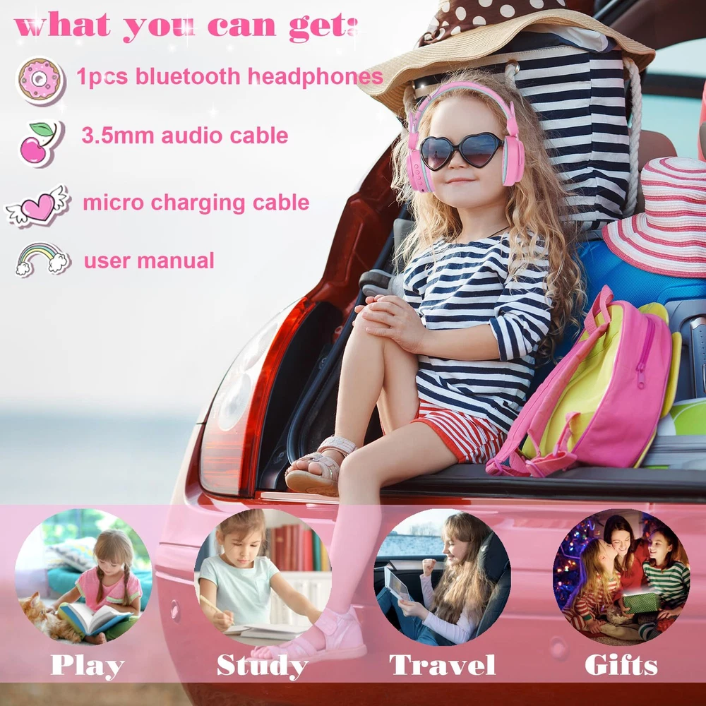 ♪Adjustable RGB LED Light: The light of bluetooth unicorn headphones work in variety modes to show different colors and lighting effect: color light or various colors light changes, keep glowing or flash with music rhythm, you can choose light color or lighting effect as you like. ♪Cute Unicorn Design: The bluetooth headphones designed with different unicorn and cartoon elements, cute cat ear/unicorn, printing clear, bright color. Fashion and super great gift for your on birthday/Christmas Day. ♪10 Hours Long Capacity Battery&Built-in Microphone: The wireless headphones has applied 400mAh battery, can last over 10 hour’s working time on a single charge. With built-in microphone, calling and communicate more convenient. It can meet your demands on study or relaxing, such as online classes, gaming, school use, travel and parties. ♪Wireless and Wired Work Modes: The bluetooth unicorn headphones has applied the latest and upgrade Bluetooth 5.0 technology provides fast and stable transmission without tangling wide range up to 10M, well with most smart phones, and other device in the market. And the wireless headphones has attached 3.5mm plug audio cable (1.2M length), you can use it as wired headphones, no worry about power shortage problem for the long travel. ♪Excellent Sound and Volume Control: The bluetooth headphones applied 40mm deep bass speakers, delivering clear sound and the volume can be adjusted to protect hearing when listening to music and calling, suitable for use on school, home, plane and car travel, parties etc. ♪Comfortable Fit and Adjustable: The cute unicorn headphones has soft earmuff and flexible headband ensure the headphones sit securely and remain comfortable even during prolong periods of use. The adjustable band allows you to get the perfect fit for your head shape. It is not only suitable for your children, but also for many adults. ♪Service: Any quality problems, please feel free to us, we will solve the issue and satisfy you.