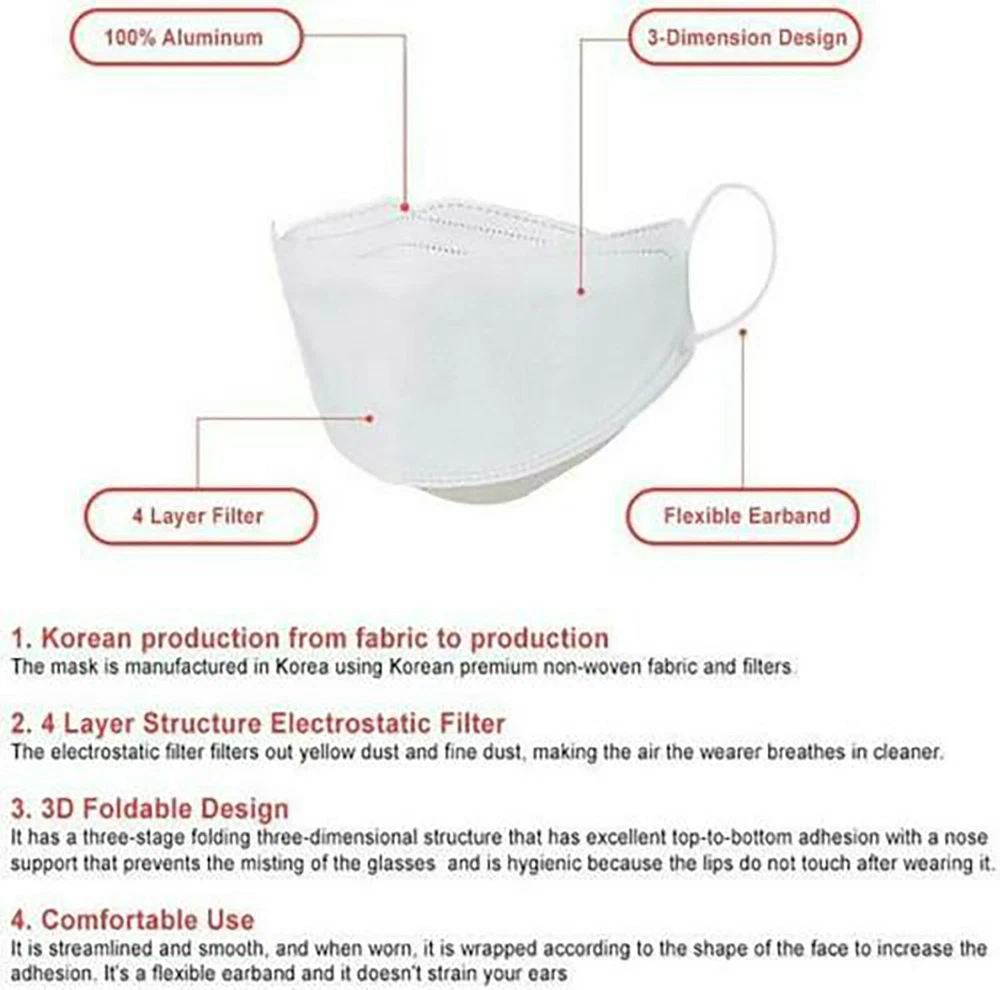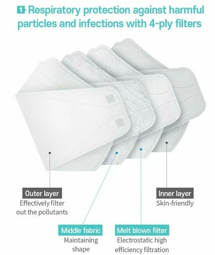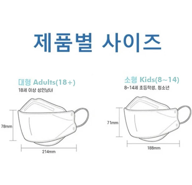 Made in Korea. *Kids size is for age 8 to 14* Brand new in sealed individual packages. 1 order equals 10 individual packs; order more and save more! FDA Surgical Medical Class 2 Grade Korea FDA (M.F.D.S.) and CE Certified Reusable and disposable; do not wash for reuse; use it up to 8 total hours within a week for best protection. Korea Meltblown MB Filter 94% protective filtration 4-layers premium filters Aluminum nose support wire bridge. Anti-slip. Anti-fog on eyeglasses. Soft inner layer: skin irritation compliant test completed; Graded Excellent from German Dermatest. Ergonomic 3D Design: easy to breathe and speak; no lip touch Including 1 ear loop hook clip in the package Box is not included No returns or exchanges accepted for healthcare products. It is final sale. Six or more orders are shipped via faster shipping method, priority mail. Same day shipping from California. We will do our best to ship out our packages as many as possible on the same day, so you can receive them earlier than expected. Most of our local orders (L.A., O.C.) will be delivered on the next day. We are a direct importer from Korean manufactures. You can trust us. We guarantee all of our items are 100% genuine, authentic, and Made in Korea. Thank you and stay safe!