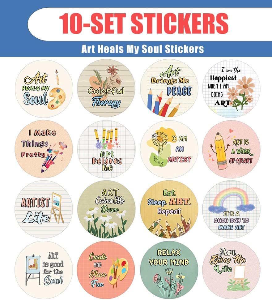 16 UNIQUE DESIGNS INSPIRING STICKERS FOR YOUR DIY PERSONALIZED DECORATIONS - Creanoso Art Heals My Soul Stickers (10-Sheets). These colorful and uniquely inspiring round shaped stickers are the best tool for DIY decoration and personalization of your belongings. GREAT STOCKING STUFFERS , TEACHING SUPPLEMENTARY MATERIALS, AND GIVEAWAY - Great stocking stuffers gifts for Boys, Girls, Teens, Kids. A perfect design to give during classroom school activities, home schooling,birthdays, anniversaries, family day, and any other special occasions. MADE WITH DURABLE AND WATERPROOF MATERIALS - There is a lamination or coating to make the stickers high water resistant, and WILL NOT fade from the water. The stickers can stick it anywhere you like, and it sticks there and lasts a long time. A COLORFUL AND DECOR STICKER DECAL - Each sheet with 16 individual round stickers. There are 10 sheets , with a total of 160 pcs of stickers. STICKER SIZE: 1.5 INCHES IN DIAMETER Art Heals My Soul Stickers (10 Sets X 16 Designs) COLORFUL AND COLLECTION OF TEXT STICKERS • Well designed. • Very encouraging. • Self-adhesive. Art Heals My Soul Stickers (10 Sets X 16 Designs) are super fun to collect; you can't have just one! That's why you will find a selection of stickers right here. Each package comes with different stickers in a variety of designs. Stick them here, stick them there, stick them everywhere! Everyone will love these self-adhesive stickers. These colorful stickers are perfect for any adults and these come with very inspiring messages and bright pictures. A fun, inexpensive way to add a decorative, notes, and stationery. Delight yourself with uplifting messages designs that are very encouraging. Art Heals My Soul Stickers (10 Sets X 16 Designs) perfect for giveaways, behavior incentives, prizes! These stickers are acid-free, nontoxic, and safe for use on photos. This product comes with a 60 days money back guarantee. You can return them to us for a full refund.